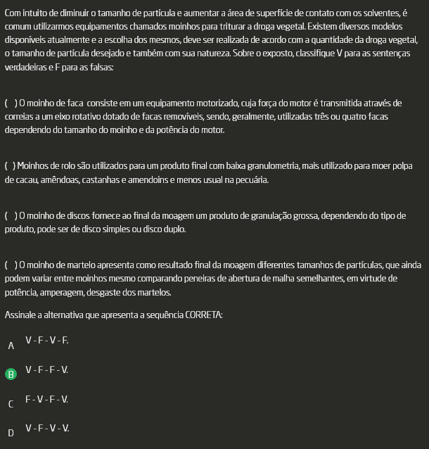 Com intuito de diminuir tamanho de partícula e aumentar a área de superfície de contato com os solventes, é comum utilizarmos equipamentos chamados moinhos para triturar a droga vegetal. Existem diversos modelos disponíveis atualmente e a escolha dos mesmos, deve ser realizada de acordo com a quantidade da droga vegetal, tamanho de partícula desejado e também com sua. Sobre exposto, classifique V para as sentenças verdadeiras e F para as falsas: ( ) 0 moinho de faca consiste em um equipamento motorizado, cuja força do motor é transmitida através de correias a um eixo rotativo dotado de facas removíveis, sendo, geralmente, utilizadas três ou quatro facas dependendo do tamanho do moinho e da potência do motor. ( ) Moinhos de rolo são utilizados para um produto final com baixa granulometria, mais utilizado para moer polpa de cacau, amêndoas, castanhas e amendoins e menos usual na pecuária. ( ) 0 moinho de discos fornece ao final da moagem um produto de granulação grossa, dependendo do tipo de produto, pode ser de disco simples ou disco duplo. ( ) 0 moinho de martelo apresenta como resultado final da moagem diferentes tamanhos de partículas, que ainda podem entre moinhos mesmo comparando peneiras de abertura de malha semelhantes, em virtude de potência, amperagem, desgaste dos. A - V-F-V-F B - F-V-F-V C - V-V-F-F D - F-V-V-F
