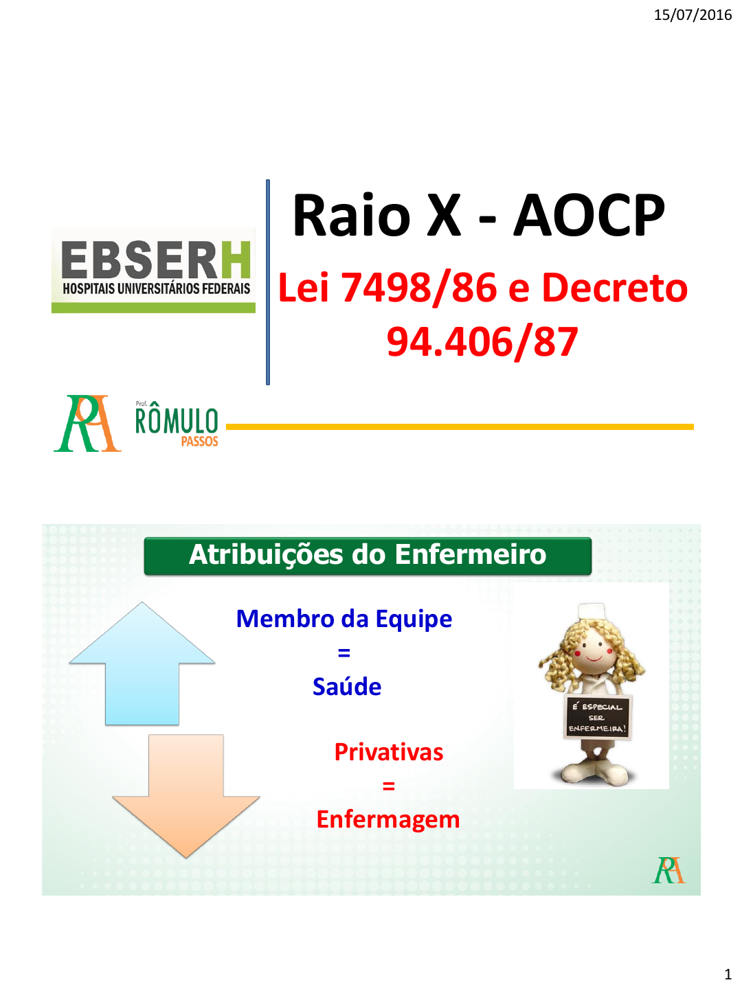 15/07/2016 1 Raio X - AOCP Lei 7498/86 e Decreto 94.406/87 Membro da Equipe = Saúde Privativas = Enfermagem Atribuições do Enfermeiro MAURO MACIEL PEREIRA OLIVEIRA - 031.180.853-04 15/07/2016 2 Atividades Privativas do Enfermeiro Direção do órgão de enfermagem integrante da estrutura básica da instituição de saúde, pública e privada Atividades Privativas do Enfermeiro de unidade de serviço Chefia MAURO MACIEL PEREIRA OLIVEIRA - 031.180.853-04 15/07/2016 3 Atividades Privativas do Enfermeiro - organização e direção dos serviços de enfermagem e de suas atividades técnicas e auxiliares nas empresas prestadoras desses serviços; Planejamento organização coordenação execução avaliação Administrar os Serviços de Enfermagem dos serviços da assistência de enfermagem. Atividades Privativas do Enfermeiro MAURO MACIEL PEREIRA OLIVEIRA - 031.180.853-04 15/07/2016 4 A ti vi d ad e s P ri va ti va s d o En fe rm e ir o Consultoria Auditoria Emissão de parecer Consulta Prescrição da assistência Atividades Privativas do Enfermeiro Pa ci en te s G ra ve s co m R is co d e V id a; ↑ C o m p le xi d ad e Té cn ic a Cuidados diretos de enfermagem Exijam conhecimentos de base científica e capacidade de tomar decisões imediatas. MAURO MACIEL PEREIRA OLIVEIRA - 031.180.853-04 15/07/2016 5 43. (HU-UFS/Instituto AOCP/2014) Sobre a Lei do Exercício Profissional, assinale a alternativa correta. a) A Lei aponta que a Enfermagem é exercida privativamente pelo Enfermeiro e Técnico de Enfermagem, respeitados os respectivos graus de habilitação. b) Quando necessário e sob supervisão do Enfermeiro, o Técnico de Enfermagem poderá realizar Consulta de Enfermagem. c) Cabe ao Auxiliar de Enfermagem prestar cuidados de enfermagem diretos a pacientes graves e com risco de vida. + Aux. Enf. e Part. Privativa do enfermeiro Privativa do enfermeiro 43. (HU-UFS/Instituto AOCP/2014) Sobre a Lei do Exercício Profissional, assinale a alternativa correta. d) A Lei 7.498/86 extingue, da categoria dos profissionais de enfermagem, a Parteira. e) É privativo do Enfermeiro a consultoria, auditoria e emissão de parecer sobre matéria de Enfermagem. MAURO MACIEL PEREIRA OLIVEIRA - 031.180.853-04 15/07/2016 6 44. (HDT-UFT/AOCP/EBSERH/2015) Analise as assertivas e assinale a alternativa que aponta a(s) correta(s). São Enfermeiros: I. o titular do diploma de enfermeiro conferido por instituição de ensino médio, nos termos da lei. II. o titular do diploma ou certificado de obstetriz ou de enfermeira obstétrica, conferidos nos termos da lei. III. o titular do diploma ou certificado de Enfermeira e a titular do diploma ou certificado de Enfermeira Obstétrica ou de Obstetriz, ou equivalente, conferido por escola estrangeira segundo as leis do país, registrado em virtude de acordo de intercâmbio cultural ou revalidado no Brasil como diploma de Enfermeiro, de Enfermeira Obstétrica ou de Obstetriz. www.romulopassos.com.br 44. (HDT-UFT/AOCP/EBSERH/2015) a) Apenas I e II. b) I, II e III. c) Apenas II e III. d) Apenas I e III. e) Apenas II. www.romulopassos.com.br MAURO MACIEL PEREIRA OLIVEIRA - 031.180.853-04 15/07/2016 7 45. (HULW-UFPB/Instituto AOCP/2014) São enfermeiros, EXCETO a) o titular do diploma ou certificado de Obstetriz ou de Enfermeira Obstétrica, conferidos nos termos da lei. b) o titular do diploma de Enfermeiro conferido por instituição de ensino, nos termos da lei. c) o titular de certificado de Enfermeiro Prático ou Prático de Enfermagem, expedido até 1964 pelo Serviço Nacional de Fiscalização da Medicina e Farmácia, do Ministério da Saúde, ou por órgão congênere da Secretaria de Saúde nas Unidades da Federação (...). Auxiliar de Enfermagem 45. (HULW-UFPB/Instituto AOCP/2014) São enfermeiros, EXCETO d) aqueles que, não abrangidos pelos incisos anteriores, obtiveram título de Enfermeira conforme o disposto na letra ““d”” do Art. 3º do Decreto-lei nº 50.387, de 28 de março de 1961. e) o titular do diploma ou certificado de Enfermeira e a titular do diploma ou certificado de Enfermeira Obstétrica ou de Obstetriz, ou equivalente, conferido por escola estrangeira segundo as respectivas leis, registrado em virtude de acordo de intercâmbio cultural ou revalidado no Brasil como diploma de Enfermeiro, de Enfermeira Obstétrica ou de Obstetriz. MAURO MACIEL PEREIRA OLIVEIRA - 031.180.853-04 15/07/2016 8 46. (EBSERH/HE-UFPel-2015) É correto afirmar que o Enfermeiro exerce todas as atividades de Enfermagem, cabendo-lhe, privativamente: a) observar, reconhecer e descrever sinais e sintomas. b) prestar cuidados de higiene e conforto ao paciente. c) prestar cuidados diretos de Enfermagem a pacientes graves. d) participar da equipe de saúde. e) executar ações de tratamento de saúde. www.romulopassos.com.br 47. (AOCP/FUNDASUS/2015) Dentre as situações apresentadas a seguir, assinale aquela considerada privativa do Enfermeiro, ou seja, aquela que apenas o profissional Enfermeiro pode realizar. a) Prescrição da assistência de enfermagem a um paciente portador de DPOC. b) Prestar cuidados de higiene e conforto a um paciente em pós-operatório de apendicectomia. c) Participar da orientação e supervisão do trabalho de Enfermagem em grau auxiliar. d) Dar banho no leito de um cliente idoso com sequela de acidente vascular encefálico. e) Verificar a temperatura axilar de uma criança febril. MAURO MACIEL PEREIRA OLIVEIRA - 031.180.853-04 15/07/2016 9 www.romulopassos.com.br 48. (HU-UFG/AOCP/EBSERH/2015) O Enfermeiro, ao fazer referência à Lei do Exercício Profissional (Lei 7498/86), afirma corretamente que a) essa lei regulamenta em todo o território nacional quais penalidades e infrações podem levar à perda do direito ao exercício da profissão. b) a enfermagem é exercida privativamente apenas pelo enfermeiro, pelo técnico de enfermagem e pelo atendente de enfermagem. c) essa lei extingue a categoria de parteira dos profissionais de enfermag