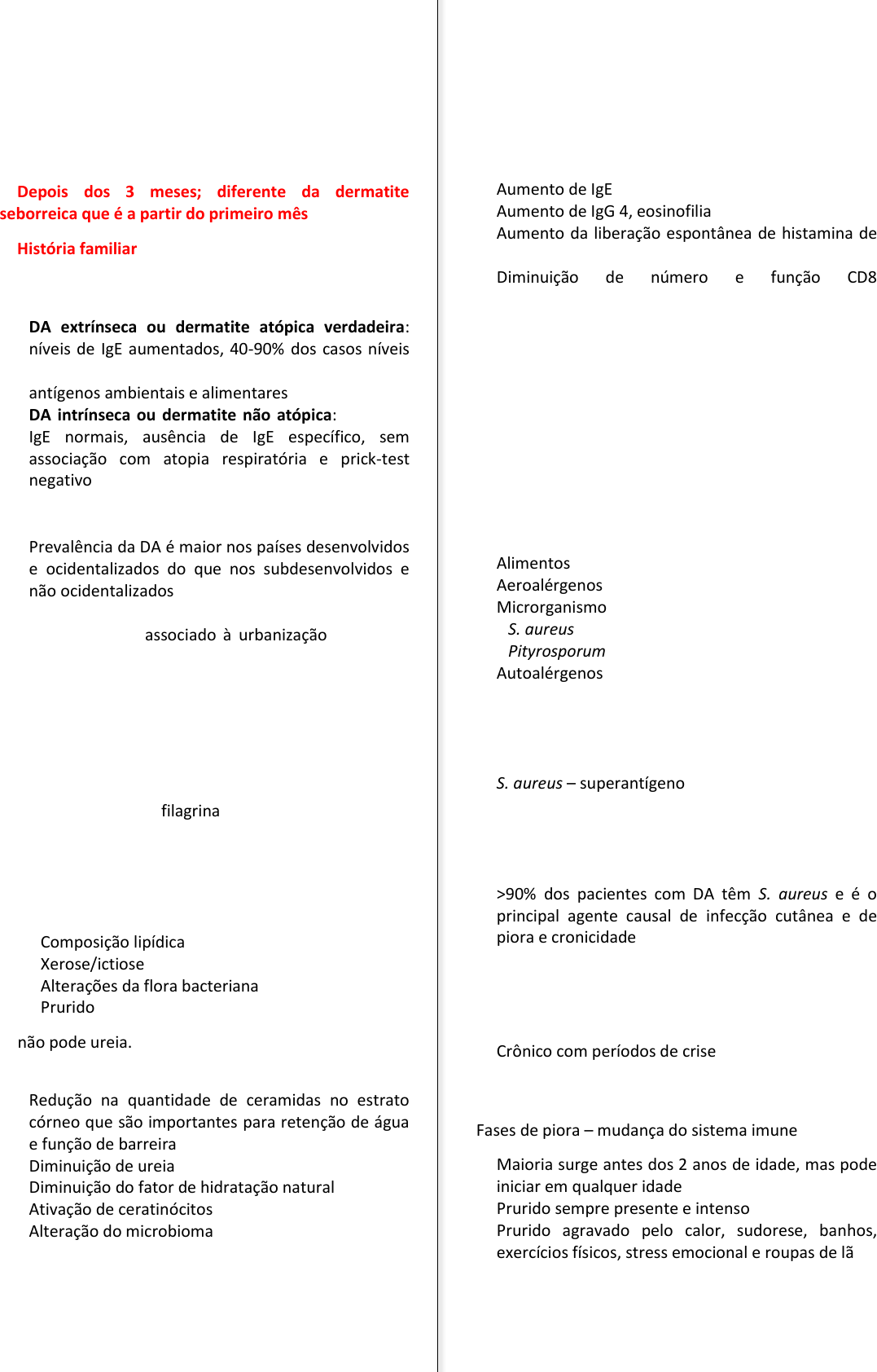 Dermatite Atópica Dermatose inflamatória crônica, às vezes recorrente, pruriginosa, frequentemente associada a outras desordens atópicas, como asma e rinite. →Depois dos 3 meses; diferente da dermatite seborreica que é a partir do primeiro mês. →História familiar. Extrínseca Intrínseca ➢ DA extrínseca ou dermatite atópica verdadeira: níveis de IgE aumentados, 40-90% dos casos níveis de IgE-específicos e prick-test positivo para antígenos ambientais e alimentares. ➢ DA intrínseca ou dermatite não atópica: níveis de IgE normais, ausência de IgE específico, sem associação com atopia respiratória e prick-test negativo. • Epidemiologia ➢ A DA é de ocorrência mundial; ➢ Prevalência da DA é maior nos países desenvolvidos e ocidentalizados do que nos subdesenvolvidos e não ocidentalizados; ➢ Sugere-se fatores ambientais importantes: aumento da prevalência associado à urbanização em países em desenvolvimento. • Etiopatogenia ➢ Envolve fatores genéticos, ambientais, imunológicos e psicológicos, alterações vasculares, alteração do prurido e disfunção da barreira cutânea; ➢ Alteração da barreira imune e das funções da epiderme; ➢ A insuficiência da filagrina predispõe a disfunção de barreira; ➢ Citocinas TH2 (IL4 e IL3) diminuem a expressão da filagrina, indicando interação complexa entre o sistema imune e o epitélio – epiderme. ➢ Alterações próprias da pele: 1. Composição lipídica; 2. Xerose/ictiose; 3. Alterações da flora bacteriana; 4. Prurido. **não pode ureia. • Função de barreira alterada ➢ Redução na quantidade de ceramidas no estrato córneo que são importantes para retenção de água e função de barreira; ➢ Diminuição de ureia; ➢ Diminuição do fator de hidratação natural; ➢ Ativação de ceratinócitos; ➢ Alteração do microbioma. • Genética da dermatite atópica ➢ Doença alérgica resulta de padrão poligênico; ➢ HDA; ✓ 60% de adultos com DA tem crianças com DA; ✓ 81% de crianças têm DA se ambos os pais têm ou tiveram DA; ✓ Mais forte correlação entre gêmeos do que entre gêmeos e pais. • Alterações imunológicas ➢ Aumento de IgE; ➢ Aumento de IgG 4, eosinofilia** ➢ Aumento da liberação espontânea de histamina de basófilos; ➢ Diminuição de número e função CD8 supressora/citotóxica; ➢ Aumento da expressão de receptores CD23 em células mononucleares (FcE RI e II), células de Langerhans e CEDI; ➢ Ativação crônica de macrófagos com secreção aumentada de GM-CSF, PGE2 e IL-10; ➢ Expansão de células TH2 secretando IL-4 e IL-5,Th2 alérgeno-especifica são fundamentais na patogenia da DA; ➢ Número diminuído de células TH1 secretando -IFN; ➢ Aumento de receptores para IL-2. • Desencadeadores imunológicos ➢ Alimentos; ➢ Aeroalérgenos; ➢ Microrganismos: ✓ S. aureus; ✓ Pityrosporum; ➢ Autoalérgenos; ➢ Microbiota cutânea influencia no desequilíbrio imune da pele. • Alterações microbiológicas ➢ Inversão da flora bacteriana da pele; ➢ S. aureus – superantígeno; ➢ IgE anti-superantígeno X gravidade; ➢ Diminuição da fagocitose e quimiotaxia; ➢ Diminuição da imunidade celular • Staphylococcus aureus ➢ >90% dos pacientes com DA têm S. aureus e é o principal agente causal de infecção cutânea e de piora e cronicidade ➢ >50% de S. aureus isolados da pele são toxigênicos: ✓ Enterotoxinas A, B e C estafilocócicas (superantígenos). • Quadro clínico ➢ Crônico com períodos de crise; ➢ Pouca diferença entre gêneros, podendo ser discretamente maior no sexo feminino; *Fases de piora – mudança do sistema imune. ➢ Maioria surge antes dos 2 anos de idade, mas pode iniciar em qualquer idade; ➢ Prurido sempre presente e intenso; ➢ Prurido agravado pelo calor, sudorese, banhos, exercícios físicos, stress emocional e roupas de lã. ➢ Características clínicas: ✓ Xerose, prurido, máculas eritematosas, pápulas ou pápulo-vesículas, áreas eczematosas com crostas, liquenificação, escoriações e infecção secundária. • Quadro clínico ➢ DA infantil; ➢ DA pré-puberal; ➢ DA do adulto; ➢ DA das mãos. DA infantil e pré-puberal Fase adulta *Face, pescoço, região de fralda → crianças mais novas. • Quadros associados ➢ Catarata, ceratocone, ceratoconjuntivite, dermatite de pálpebras, dermatite de contato, eczema perioral, infecções bacterianas, infecções virais; ➢ Rinite alérgica e asma, queratose pilar (braços, coxas e face), ictiose vulgar de MMII, pitiríase alba, urticária, língua geográfica, vitiligo, hiperlinearidade palmoplantar. • Diagnóstico ➢ Clínica e critérios diagnósticos (maiores e menores); ➢ Laboratorial: dosagem de IgE total e sérica, IgE específica (Immunocap); ➢ Histopatológico; ➢ Prick-test e às vezes teste de contato quando suspeita de dermatite de contato associada. • Múltiplos fatores desencadeiam o prurido ➢ Todos irritantes – sabões, detergentes, desinfetantes, ocupacionais, sumo de frutas etc. ➢ Aeroalérgenos e contactantes – ácaros (contato > aero), pelos de animais (gato > cachorro), pólen, fungos, caspa humana. • Banho e hidratação ➢ Banhos mornos a frios, rápidos, pouco sabonete, de preferência Syndet (menos de 10% de sabonete e pH entre 5,5 a 7); ➢ Evitar esfregar a toalha; ➢ Aplicar o hidratante ainda com a pele levemente úmida; ➢ Repetir a hidratação 2x/dia nas crises. • Controle do prurido ➢ Fatores emocionais relacionados ao prurido: ✓ Infância – sensação de toque, distúrbios do sono, crescimento, rendimento escolar. ✓ Adulto – envolvimento familiar, rendimento no trabalho, aspecto sexual. ➢ Educar o paciente quanto aos fatores desencadeantes; ➢ Medidas tópicas não específicas; ➢ Medidas tópicas específicas; ➢ Medicações orais – anti-histamínicos, antidepressivos, antibióticos, ansiolíticos, anti- opi