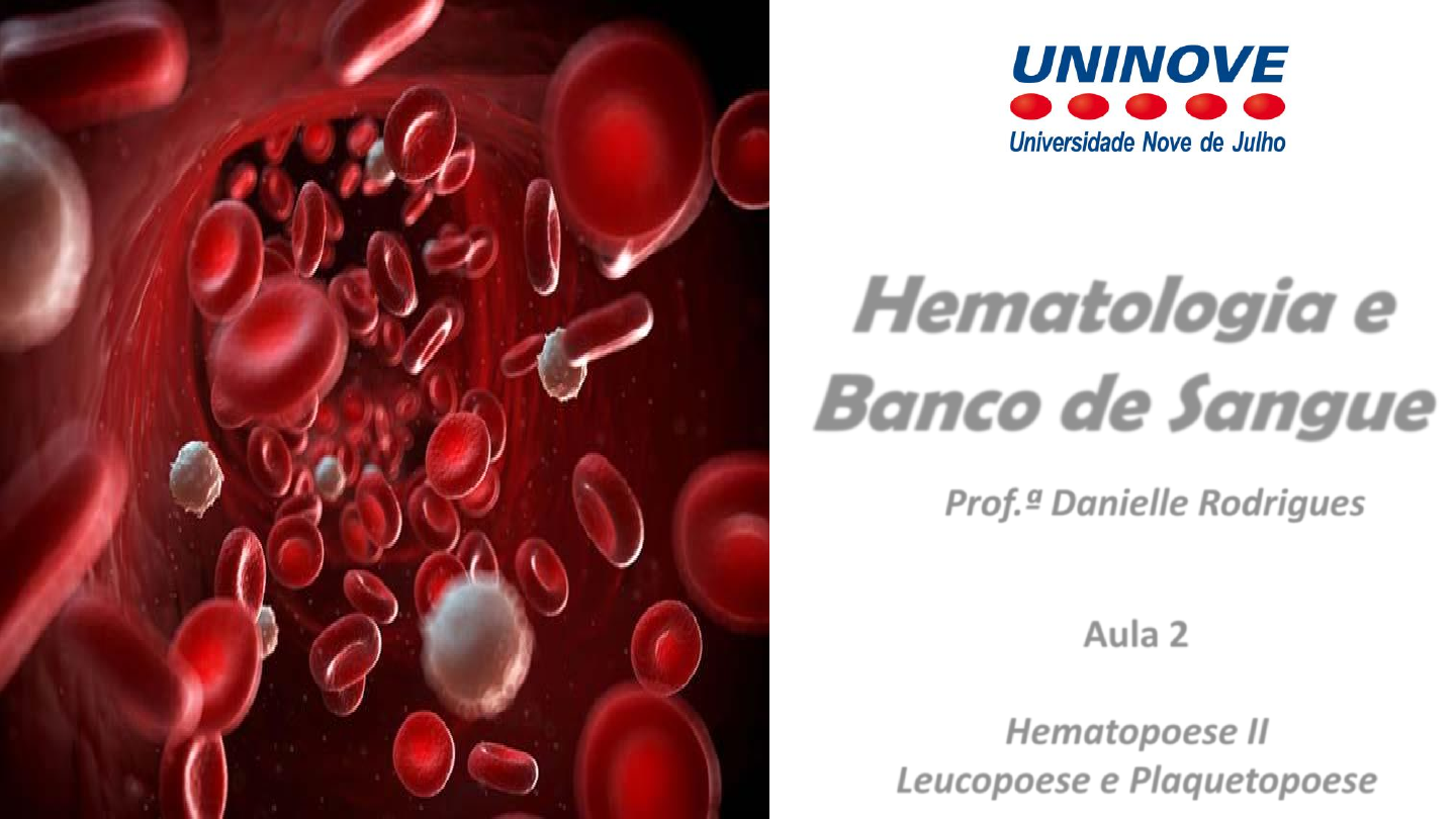 Hematologia e Banco de Sangue Prof.ª Danielle Rodrigues daniellerodrigues@uni9.pro.br Aula 2 Hematopoese II Leucopoese e Plaquetopoese Leucopoese Leucopoese Leucopoese ❑ É o processo de formação dos glóbulos brancos, também chamados de leucócitos. ❑ Pode ser dividida em: ✓ Granulopoese; ✓ Linfopoese; ✓ Monocitopoese. Leucopoese ✓ Os leucócitos são responsáveis pelas defesas do nosso organismo frente a agente invasores; ✓ Cada leucócito é especializado em uma função; ✓ São eles que garantem nossa imunidade contra patógenos; ✓ São capazes de produzir células de memória e anticorpos. Granulopoese Granulopoese Os granulócitos (neutrófilos, eosinófilos e basófilos) são células produzidas na medula óssea, permanecendo pouco tempo no sangue periférico, sendo capazes de migrar para os tecidos mediante a presença de fatores quimiotáticos; ✓ A granulopoese dura cerca de 11 dias. Granulopoese Granulopoese Etapa 1 – Compartimento de Reprodução Nessa fase acontece as divisões celulares, é formada pelos mieloblastos (Mb) e prómieloblastos (PM). Nessa fase as células apresentam as granulações primárias (azurófilas) ricas em mieloperoxidase. Granulopoese Etapa 2 – Compartimento de Maturação Compreende os mielócitos (M), metamielócitos (Mtm), bastonetes (Bt) e segmentados (Seg). Corresponde ao aparecimento das granulações específicas e ao processo de lobulação do núcleo. Granulopoese Etapa 3 – Compartimento marginal Este abriga na camada endotelial dos vasos sanguíneos uma reserva significativa de neutrófilos. Estímulos como exercícios físicos, ansiedade e alimentação ocorridos previamente à coleta de sangue acarretam na liberação destas células para circulação resultando em pseudoneutrofilia ou leucocitose transitória. Granulopoese Etapa 4 – Compartimento circulante Que compreende uma pequena quantidade de bastonetes e além dos segmentados neutrófilos, eosinófilos e basófilos. Granulopoese - Morfologia Mieloblasto Apresenta cerca de 17 µ de diâmetro e basofilia menos intensa quando comparados aos proeritroblastos. Pode apresentar escassas granulações azurófilas. O núcleo é grande, a cromatina é frouxa e com presença de um ou mais nucléolos. Granulopoese - Morfologia Promielócito Após 3 ou 4 divisões mitóticas do mieloblasto aparecem granulações densas e avermelhadas no citoplasma (azurófilas) caracterizando o promielócito que geralmente é maior que o mieloblasto. A relação núcleo/citoplasma favorece ao núcleo e os nucléolos tornam se poucos evidentes. Granulopoese - Morfologia Mielócito O citoplasma vai perdendo basofilia, as granulações primárias ficam pouco evidentes e aparecem as granulações secundárias específicas. O núcleo geralmente é oval e excêntrico. A cromatina é mais condensada e não existe nucléolos. A medula óssea normal contém de 2 a 10% de mielócitos. Granulopoese - Morfologia Metamielócito É incapaz de dividir-se, o citoplasma apresenta granulações específicas em maior quantidade e o núcleo tem aspecto maciço e riniforme. Granulopoese - Morfologia Bastonete Apresenta o citoplasma semelhante ao do metamielócito com granulações neutrófilas, eosinófilas ou basófilas dependendo do tipo celular. O núcleo apresenta forma de bastão. Constituem de 1 a 5% dos leucócitos presentes no sangue circulante e 10 a 40% das células presentes na medula óssea. Granulopoese - Morfologia Segmentado O núcleo é separado em lobos (2 a 5) interligados por finos filamentos de cromatina. A granulação citoplasmática é fina e rósea no neutrófilo, alaranjada e grosseira no eosinófilo e azul escura e densa no basófilo. Linfopoese Linfopoese As células progenitoras da série branca podem se diferenciar em células B ou T dependendo do local de produção/maturação. ✓ Linfócito T – Timo ✓ Linfócito B – Medula Óssea Estes locais são conhecidos como órgãos linfoides primários. Linfopoese ❑ No adulto, os linfócitos são maturados nos tecidos linfoides secundários, que incluem os linfonodos, baço e o tecido linfoide associado a mucosas. ❑ Os linfócitos T e B dificilmente são identificados através da morfologia, são separados de acordo com marcadores específicos. Linfopoese ❑ No adulto, os linfócitos são maturados nos tecidos linfoides secundários, que incluem os linfonodos, baço e o tecido linfoide associado a mucosas. ❑ Os linfócitos T e B dificilmente são identificados através da morfologia, são separados de acordo com marcadores específicos. Linfoblasto Apresenta o citoplasma basófilo, a relação núcleo/citoplasma favorece ao núcleo. O núcleo é redondo com cromatina fina e nucléolos. Morfologia da linhagem linfóide Prolinfócito Apresenta um padrão intermediário de condensação da cromatina nuclear, com nucléolos mais raros. O citoplasma é basófilo. Morfologia da linhagem linfóide Linfócito Compreendem de 5 a 15% das células da medula óssea; No sangue periférico estão em maior quantidade (20 a 40%); Geralmente tem entre 7 e 10 µ de diâmetro. Normalmente são redondos com citoplasma escasso exibindo intensa basofilia. O núcleo apresenta cromatina condensada. Morfologia da linhagem linfóide Monocitopoese São células originadas a partir das células precursoras mielóides. Permanecem por pouco tempo no sangue periférico, migrando para o tecido se diferenciam em macrófagos. Monocitopoese MONOBLASTRO PROMONÓCITO MONÓCITO Monoblasto Como os demais blastos, é uma célula grande com citoplasma basófilo e agranular. O núcleo é geralmente excêntrico e a cromatina frouxa. Apresenta dois nucléolos. Está célula não participa da fagocitose. Morfologia da série monocítica Promonócito O núcleo vai adquirindo forma ou contorno irregular, a cromatina apresenta um pequeno grau de condensação e o citoplasma pode apresentar discreta granulação rósea. Morfologia da série monocítica Monócito