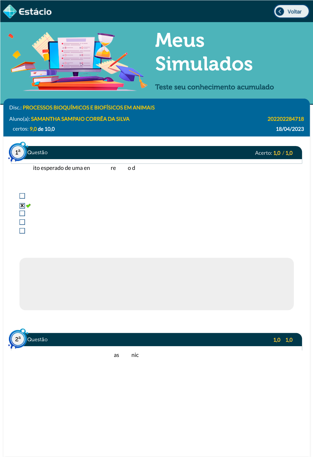 18/04/2023, 21:53 Estácio: Alunos https://simulado.estacio.br/alunos/ 1/6 Meus Simulados Teste seu conhecimento acumulado Disc.: PROCESSOS BIOQUÍMICOS E BIOFÍSICOS EM ANIMAIS Aluno(a): SAMANTHA SAMPAIO CORRÊA DA SILVA 202202284718 Acertos: 9,0 de 10,0 18/04/2023 Acerto: 1,0 / 1,0 O efeito esperado de uma enzima é a redução da energia de ativação durante a conversão de um substrato em produto. Para que esse processo ocorra, existira um momento em que a enzima estará ligada ao substrato formando o energia de ativação. complexo enzima-substrato. complexo enzima-produto. produto substrato Respondido em 18/04/2023 21:29:12 Explicação: No momento em que a enzima está ligada ao substrato (composto que sofre a reação), ocorre a formação do complexo enzima-substrato e posterior conversão em produto (produto formado a partir dos reagentes). A partir do momento que os produtos começam a ser formados, temos então o surgimento do complexo enzima-produto (EP) e, na medida que mais produto é formado, este complexo deixa de existir e enzima se torna disponível novamente para ligação com o substrato. A energia de ativação é a energia necessária para que a reação aconteça. Acerto: 1,0 / 1,0 Os aminoácidos são pequenas moléculas orgânicas que possuem, em sua constituição básica, átomos de carbono, hidrogênio, nitrogênio e oxigênio. São classi�cados como constituintes da estrutura das proteínas e peptídeos, sendo que cada uma dessas estruturas é formada por uma combinação de diferentes aminoácidos, dando como resultados, diferentes proteínas e peptídeos. A respeito dos aminoácidos e proteínas, analise as a�rmativas abaixo. I - A cadeia lateral dos aminoácidos são os determinantes para a variabilidade entre as estruturas. II - O feitio do queijo envolve reações de desnaturação proteica III - As ligações entre as proteínas formam uma estrutura de peptídeos IV - Aminoácidos essenciais são de essencial ingestão na dieta V - Aminoácidos não essenciais são de essencial ingestão na dieta Questão1 a Questão2 a https://simulado.estacio.br/alunos/inicio.asp javascript:voltar(); 18/04/2023, 21:53 Estácio: Alunos https://simulado.estacio.br/alunos/ 2/6 Assinale a alternativa correta. II, III, IV I, III, IV I, II, IV I, II, V I, II, III Respondido em 18/04/2023 21:34:10 Explicação: Os aminoácidos se organizam em cadeias para formar estruturas de peptídeos e proteínas, onde a cadeia lateral de um aminoácido e responsável pela variabilidade entre essas moléculas. Os aminoácidos essenciais devem estar presentes na dieta do animal por não serem sintetizados no organismo em concentração su�ciente para garantir as demandas metabólicas. Dentro do processo de formação de algum tipo de queijo, a proteína do leite, caseína, sofre desnaturação e participa do feitio desse alimento. As proteínas são macromoléculas formadas por polímeros de aminoácidos, cuja formação dessas cadeias de biomoléculas se por meio da ligação peptídica. Acerto: 1,0 / 1,0 Os equinos são animais herbívoros desprovidos de vesícula biliar, e comumente apresentam coloração plasmática mais amarelada, quando comparada à coloração de outras espécies de animais domésticos. Nesses animais, o jejum prolongado, por mais de 24 horas, também pode levar a um retardo na velocidade de conjugação da bilirrubina indireta em direta, fazendo com que a bilirrubina indireta �que mais tempo circulante no sangue. Esse acúmulo vai determinar a ocorrência de uma condição denominada: Hemossiderose Azotemia Icterícia Anemia Eritrocitose Respondido em 18/04/2023 21:36:42 Explicação: Equinos são animais que apresentam uma velocidade de conjugação da bilirrubina indireta em bilirrubina direta mais lenta que as demais espécies de animais domésticos pelo fato de serem isentos de vesícula biliar. Quando submetidos a um longo período de jejum, vai haver uma sobrecarga no funcionamento hepático, já que estará ocorrendo a beta oxidação de ácidos graxos para geração de energia metabólica, o que acaba determinando um retardo ainda maior na velocidade de conjugação da bilirrubina indireta, que �cará acumulada no sangue causando o aparecimento de icterícia. A anemia pode ser provocada pela perda excessiva de sangue pelo animal como em uma hemorragia; pelo excesso de destruição de hemácias (hemólise), pela ação de hemoparasitos ou por falta de ferro para produção de hemoglobina, por exemplo; pela diminuição da produção de hemácias, por patologias na medula óssea ou nos rins, já que eles são responsáveis por produzir eritropoetina, hormônio que participa da hematopoiese. Eritrocitose é o aumento do número de hemácias, hemossiderose é um termo usado para o acúmulo excessivo de depósitos de ferro chamado hemossiderina nos tecidos. Azotemia se refere ao aumento das concentrações séricas de ureia, creatinina e outros compostos nitrogenados não-proteicos no sangue, no plasma ou no soro. Acerto: 1,0 / 1,0 Sabendo-se que a maior parte do ferro presente no organismo animal está ligado a moléculas de hemoglobina presentes no interior das hemácias, e que dessa forma, esse mineral é indispensável para a eritropoiese, é possível estabelecer que situações de privação de ferro, podem acabar levando a quadros patológicos que evoluem para a ocorrência de: Questão3 a Questão4 a 18/04/2023, 21:53 Estácio: Alunos https://simulado.estacio.br/alunos/ 3/6 Eritrocitoses Anemias Leucocitoses Eritroleucemia Leucopenias Respondido em 18/04/2023 21:38:11 Explicação: As anemias são caracterizadas por diminuição no número de hemácias e/ou quantidade de hemoglobina presente no sangue. Como para a síntese de hemoglobina, há necessidade de ferro, havendo falta deste mineral, consequentemente ocorrerá um prejuízo na produção de hemoglobina caracterizando uma anemia do tipo ferropriva, ou seja, uma anemia carencial por fal