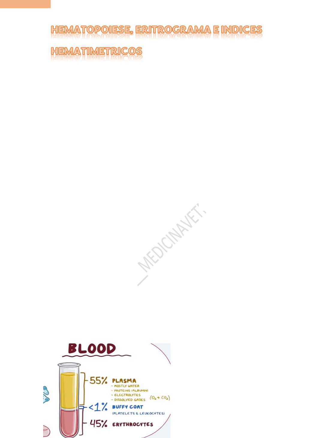 1 PATOLOGIA CLÍNICA – 14/02/23 SANGUE O sangue é definido como um tecido conjuntivo fluido constituído por plasma (parte líquida) e elementos figurados (células e fragmentos celulares). A porção líquida representa em torno de 55% do volume sanguíneo total e a porção celular constitui cerca de 45%. ❖ O sangue é constituído por plasma, glóbulos brancos, hemácias, plaquetas. Compõe-se de uma parte líquida (plasma), constituída por água, sais, vitaminas, e fatores de coagulação, na qual estão misturadas as partes sólidas: hemácias, leucócitos e plaquetas. ❖ Sua principal função é a distribuição dos nutrientes, gás oxigênio e hormônios para as células do corpo. ❖ Na maioria dos vertebrados o sangue é formado pelo plasma (parte líquida do sangue que contém diversas substâncias), hemácias (glóbulos vermelhos), leucócitos (glóbulos brancos) e plaquetas (fragmentos celulares) ❖ Os glóbulos e as plaquetas representam 45% da composição do sangue, que circula pelos vasos sanguíneos (artérias, veias e capilares). As artérias o conduzem do coração para os órgãos e tecidos do corpo, enquanto nas veias ele flui em sentido inverso. Plasma sanguíneo - É uma solução aquosa constituída de água, sais minerais e proteínas. Sua função é transportar essas substâncias pelo corpo. O plasma representa cerca de 55% do volume sanguíneo. A água constitui 95% de sua massa. Os outros 5% são de proteínas, sais, hormônios, nutrientes, gases e excreções. As principais proteínas do plasma são a albumina, com papel importante na manutenção da pressão osmótica do sangue, e a imunoglobulinas, importantes anticorpos. O plasma é composto por: • Água (92%) • Proteínas: albumina, globulinas, fibrinogênio • Sais: sódio, potássio, cloretos, cálcio, ferro • Substâncias orgânicas: glicose, colesterol, triglicérides, ureia, creatinina Hemácias - Também chamadas de eritrócitos ou glóbulos vermelhos, elas são células compostas por moléculas de hemoglobina, proteína responsável pela cor vermelha do sangue. Sua função é transportar o oxigênio para o corpo. As hemácias correspondem a cerca de 42 a 47% do volume do sangue. (hemácias, hemoglobulina) Leucócitos - Conhecido como glóbulos brancos ou células de defesa do organismo, os leucócitos são células responsáveis por defender o organismo contra microrganismos invasores e correspondem a 1% do volume do sangue no corpo são divididos em granulócitos e agranulocitos. - Neutrófilos - Basófilos - Eosinófilos - Monócitos - Linfócitos Plaquetas (trombócitos) - são agentes importantes na coagulação do sangue e correspondem a menos de 1% do volume do sangue e é responsável pela coagulação sanguínea. 2 PATOLOGIA CLÍNICA – 14/02/23 FUNÇÃO DO SANGUE ❖ Transporte ❖ Coagulação ❖ Defesa e imunidade ❖ Regulação ❖ Eritrocitos/Hemácias: transporte de gases, transportar o oxigênio dos pulmões para as células de todo o organismo e eliminar o gás carbônico das células, transportando-o para os pulmões ❖ Leucócitos: imunidade e defesa, possuem formas e funções diversas, sempre ligadas à defesa do organismo contra a presença de elementos estranhos. ❖ Plaquetas: coagulação do sangue, cascata de coagulação, sua função mais importante é a de auxiliar na interrupção dos sangramentos. HEMATOPOIESE A hematopoiese é o processo pelo qual são formadas as células sanguíneas. Envolve todos os fenômenos relacionados a origem, multiplicação e maturação das células precursoras das células sanguíneas. Após o nascimento, a medula óssea constitui o único local de produção das células do sangue (eritrócitos, leucócitos e plaquetas). Apesar de essas três linhagens celulares serem distintas, são oriundas de uma célula- mãe única, chamada célula pluripotente. ❖ Ocorre nos ossos longos dentro da medula óssea ❖ Baço ❖ Fígado ❖ Placenta A medula óssea é o órgão produtor das células sanguíneas. À medida que os anos avançam, ocorre uma substituição gordurosa na medula dos ossos longos até que, na idade adulta, somente os ossos da pelve (como o ilíaco), o esterno, os ossos do crânio, os arcos costais, vértebras e as epífises femorais e umerais são capazes de gerar células sanguíneas. A hematopoiese (ou hemopoese) é processo pelo qual são formadas as células do sangue. Ela abrange todos os fenômenos relacionados com a origem, a multiplicação e a maturação de células primordiais ou precursoras das células sanguíneas. A porção celular do sangue é composta de eritrócitos, leucócitos e plaquetas. Essas três linhagens celulares, apesar de serem distintas umas das outras, são oriundas de uma célula-mãe única, denominada célula pluripotente, toipotente, stem–cell ou célula-tronco. Hematopoiese no Período Intra-Uterino (dentro do útero) As primeiras células sanguíneas surgem no período embrionário (pré-hepático), por volta da sétima ou oitava semana de vida. Daí até o quarto mês, a formação das células se faz em agrupamentos de células redondas localizadas no saco vitelínico. Ocorre, nesse sítio, eritropoiese, que se desenvolve no mesoderma. Existem duas teorias que tentam explicar tal fato. A hipótese de endotélio-hemogenia defende a formação das células tronco hematopoiéticas a partir de células endoteliais, que perdem as características fenotípicas endoteliais e passam, progressivamente, a expressar marcadores hematopoiéticos, Por outro lado, a hipótese da origem das células tronco hematopoiéticas a partir de hemangioblastos alega a existência de um precursor bipotente e indiferenciado comum às células endoteliais e hematopoiéticas. Ainda durante a gestação, do quarto ao sexto mês de vida fetal, as células tronco hematopoiéticas emigram do saco vitelínico para o fígado e as células do sangue são, então, formadas no fígado e também no ba