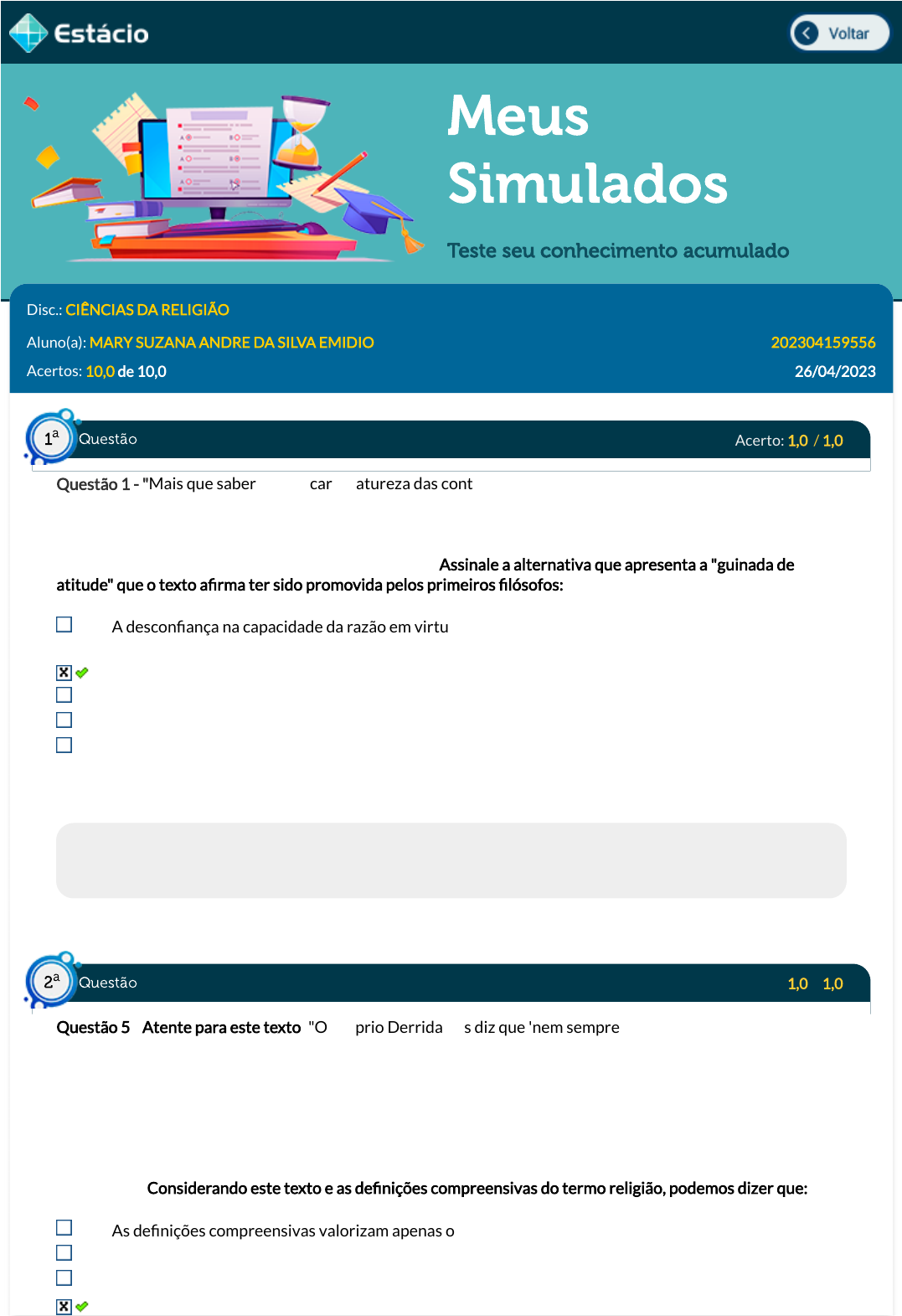 Meus Simulados Teste seu conhecimento acumulado Disc.: CIÊNCIAS DA RELIGIÃO Aluno(a): MARY SUZANA ANDRE DA SILVA EMIDIO 202304159556 Acertos: 10,0 de 10,0 26/04/2023 Acerto: 1,0 / 1,0 Questão 1 - "Mais que saber identi�car a natureza das contribuições substantivas dos primeiros �lósofos é fundamental perceber a guinada de atitude que representam. A proliferação de óticas que deixam de ser endossadas acriticamente, por força da tradição ou da `imposição religiosa¿, é o que mais merece ser destacado entre as propriedades que de�nem a �loso�cidade.". (OLIVA, Alberto; GUERREIRO, Mario. Pré-socráticos: a invenção da �loso�a. Campinas: Papirus, 2000. p. 24.). Assinale a alternativa que apresenta a "guinada de atitude" que o texto a�rma ter sido promovida pelos primeiros �lósofos: A descon�ança na capacidade da razão em virtude da ¿proliferação de pontos de vista¿ con�itantes entre si. A análise crítica das ideias, imagens e posições, que podem ser modi�cadas ou reformuladas. A con�ança na tradição e na autoridade religiosa como alicerces para o conhecimento verdadeiro. A aceitação sem crítica das explicações tradicionais relativas aos acontecimentos naturais. A busca por uma verdade única e não-questionável, que substituísse a verdade imposta pela religião Respondido em 26/04/2023 15:03:42 Explicação: A análise crítica das ideias, imagens e posições, que podem ser modi�cadas ou reformuladas. Acerto: 1,0 / 1,0 Questão 5 - Atente para este texto: "O próprio Derrida nos diz que 'nem sempre houve, continua não havendo e nunca haverá por toda a parte algo, uma coisa una e identi�cável, idêntica a si mesma que leve religiosos ou irreligiosos a �car de acordo para lhe atribuir o nome de 'religião'. E, no entanto, se diz, é necessário responder'. A resposta talvez possa vir justamente dessa relação que podemos estabelecer entre o relegere e o religare. Quando ouvirmos o termo religio, devemos ter em mente mais do que uma reconciliação entre as duas origens etimológicas possíveis; trata-se de uma complementaridade: a observância escrupulosa do culto, a prática religiosa, e os laços de piedade e amor que unem os homens ao deus único.". (Fonte: AZEVEDO, Cristiane. A procura do conceito de religio: entre o relegere e o religare, Revista Religare, vol. 7, n. 1, p. 90-96, março de 2010, p. 95). Considerando este texto e as de�nições compreensivas do termo religião, podemos dizer que: As de�nições compreensivas valorizam apenas os aspectos internos e estruturais da religião. As de�nições compreensivas buscam as origens do termo religião no latim religare. As de�nições compreensivas de�nem precisão e objetividade o conceito de religião. As de�nições compreensivas evitam conceituações permanentes e de�nitivas da religião. Questão1 a Questão2 a https://simulado.estacio.br/alunos/inicio.asp javascript:voltar(); As de�nições compreensivas desprezam os fatores e as funções sociais da religião. Respondido em 26/04/2023 15:07:24 Explicação: As de�nições compreensivas evitam conceituações permanentes e de�nitivas da religião Acerto: 1,0 / 1,0 Descrição �losó�ca dos fenômenos, em sua natureza aparente e ilusória, manifestados na experiência aos sentidos humanos e à consciência imediata. Essa de�nição se refere à: Cartesianismo Filoso�a Antologia Teologia Fenomenologia Respondido em 26/04/2023 15:11:32 Explicação: Fenomenologia é o estudo da consciência e dos objetos da consciência. A "epoché", é o processo pelo qual tudo que é informado pelos sentidos é mudado em uma experiência de consciência, em um fenômeno que consiste em se estar consciente de algo. Coisas, imagens, fantasias, atos, relações, pensamentos, eventos, memórias, sentimentos, etc. Constituem nossas experiências de consciência. Acerto: 1,0 / 1,0 Questão 3 ¿ Leia a avaliação da fenomenologia de Van der Leeuw feita por Nicola Gasbarro, historiador e �lósofo italiano: ¿É inútil procurar em toda a obra de Van der Leeuw as motivações deste salto epistemológico que faz com que todo o horizonte de sentido e, portanto, toda a cultura dependam, de fato e de direito, da perspectiva religiosa: para um teólogo toda a natureza depende do sobrenatural, e toda a cultura nasce da tensão entre natureza e o sentido-valor do sobrenatural. Van der Leeuw nada tem de ingênuo e sabe [...] dissolver a estrutura teológica no contexto experiencial da vida, escondê-la na Filoso�a da consciência, até traduzi-la em termos de epistemologia husserliana, mas, quando o sistema ganha corpo, inevitavelmente reemergem na experiência de vida do a priori seja o sublime do mysterium, seja a complexidade da experiência criatural de Otto¿ (Fonte: GASBARRO, Nicola. Fenomenologia da Religião. In: PASSOS, João Décio; USARSKI, Frank (Orgs.). Compêndio de Ciência da Religião. São Paulo: Paulinas/Paulus, 2013, p. 87). Tendo em vista este texto e a fenomenologia da religião da escola holandesa, assinale a alternativa correta: A fenomenologia da religião procura, apenas, a apreensão dos elementos estruturais das religiões ou tradições religiosas vividos pelos crentes ou membros de qualquer religião. A fenomenologia da religião evitar interrogar as culturas e histórias humanas sobre o sentido do sagrado vivido pelo crente ou seguidor de qualquer religião. A fenomenologia da religião busca compreender o sagrado a partir da experiência religiosa vivida pelo crente ou seguidor de qualquer religião. A fenomenologia da religião busca relativizar a essência do fenômeno religioso a partir da experiência religiosa vivida pelo crente ou seguidor de qualquer religião. A fenomenologia da religião busca na cultura e na história os motivos da redenção universal do ser humano que vive as experiências religiosas. Respondido em 26/04/2023 15:14:23 Questão3 a Questão4 a Explic