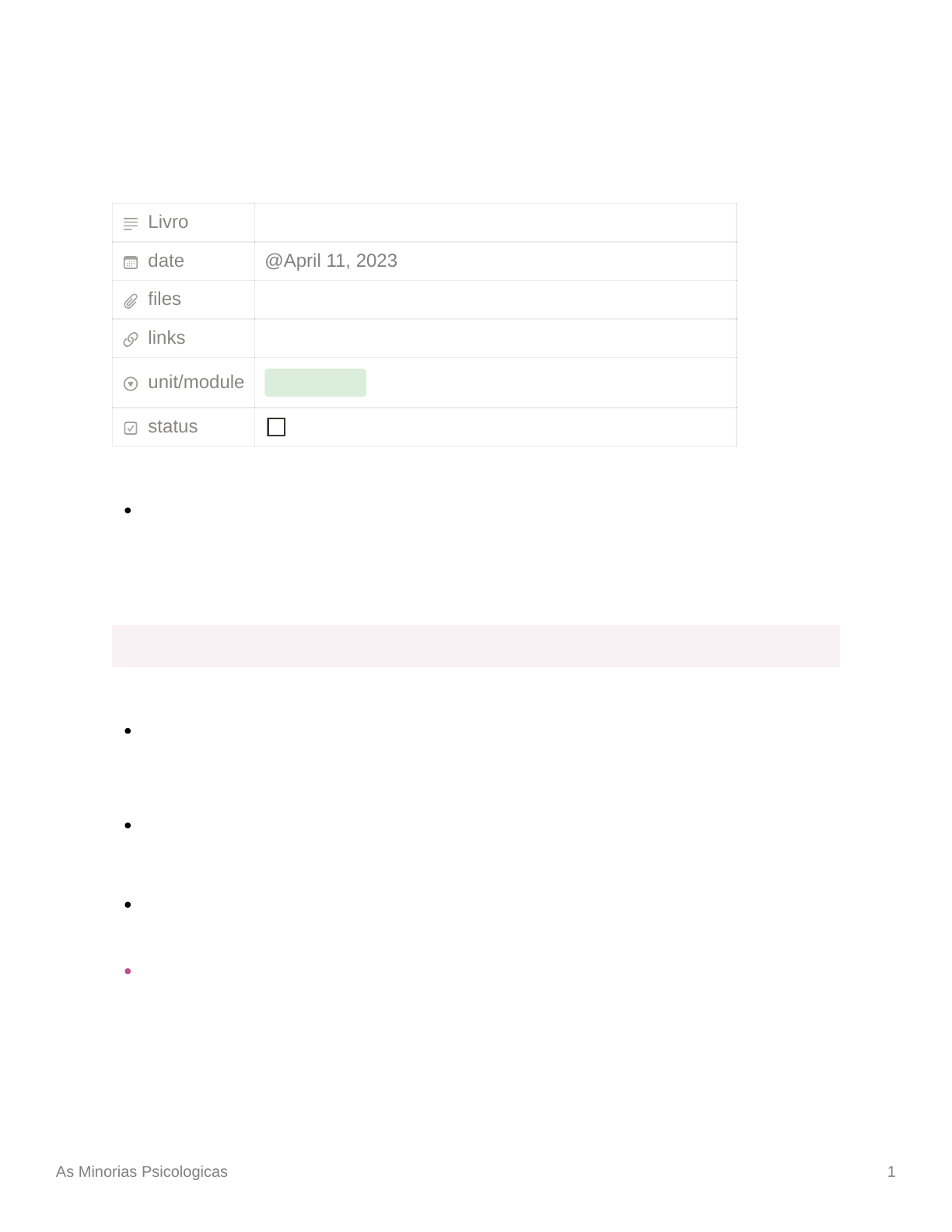 As Minorias Psicologicas 1 As Minorias Psicologicas Livro Dinamica e Genese dos Grupos - CAP 3; KURT LEWIN date files links unit/module Concluido status Lewin → Problema social: Psicologia de seu grupo etnico; seres humanos que, pelo simples fato de pertecerem a determinado grupo etinico, vivem em uma insegurança permanente; DEMOGRAFIA E PSICOLOGIA demografia → termos minoria e maioria em sentidos diferentes em psicologia um grupo é considerado como maioria psicologica, quando se dispõe de estruturas, de um estatuto e de direitos que lhe permitem auto-denominar-se no plano do seu destino coletivo, independente do n° ou % de seus membros; minorias demográficas podem constituir maiorias psicologicas; é considerado maior pelo psicologo social, todo grupo humano que se percebe na posse de plenos direitos que dele fazem um grupo autonomo; um grupo deve ser classificado como minoria psicológica desde que seu destino coletivo dependa da boa vontade de um outro grupo; @April 11, 2023 As Minorias Psicologicas 2 MINORIA DISCRIMIADA E MINORIA PRIVILEGIADA toda minoria psicologica é sempre considerada como minoria discriminada ou susceptível de sê-lo pelo fato de sua sorte e seu destino estarem na dependencia do grupo majoritário; a minoria privilegiada é uma minoria demográfica no seio de uma maioria psicologica que ela controla e manipula a seu favor; AS MINORIAS JUDIAS 1. “When facing danger”: trata do futuro ou das possibilidades de sobrevivencia das minorias judias no ocidente; 2. “Bringing up the jewsh child”: trata da educação que deveria receber o jovem judeu para evoluir normalmente; 3. “Self-hatred among jews”: trata dos mecanismos de auto-depreciação que Lewin observara repetidas vezes em seus própios grupos; → Lewin aplica em apresentar uma caracteriologia étnica de seu povo e um psico- diagnóstico; “When facing danger” estudos sociológicos demonstraram que em todas as guerras europeias dos ultimos sec os judeus tiveram que lutar e morrer por seu país de adoção. Lewin cita que “estava-se disposto a lutar até o ultimo judeu”; Os direitos dos judeus são inseparáveis de uma filosofia e de igualdade dos homens; os regimes políticos que perseguiram os judeus tentaram sempre fazer prevalecer a teoria da inferioridade de certas raças e superioridade da sua; As Minorias Psicologicas 3 Para Lewin, o problema judeu é um problema social, um caso típico de minoria não privilegiada ou discriminada; o que caracteriza as classes ou grupos não-privilegiados é que em todos os casos eles possuem algo em comum: não existem senão porque são tolerados; sua sobrevivencia coletiva precisa da boa vontade das classes privilegiadas; atualmente pode-se demonstrar que as pressões e discriminações contra judeus aumentam ou diminuem, conforme as dificuldades economicas da minoria crescem ou descrecem; é uma das razões pelas quais os judeus de toda parte estão necessáriamente interessados em contribuir para o bem-estar economico das maiorias no meio das quais vivem; o anti-semitismo tem por fundamento, cada vez que se manifesta, a necessidade para a maioria de um bode expiatório; uma minoria privilegiada que consegue mobilizar e manipular para seus fins de massa ou uma multidão cuja agressão canaliza contra a minoria rejeitada; “Bringing up the jewsh child” Lewin compara a educação do jovem judeu à educação de uma criança adotada; o grupo ao qual o indivíduo pertence, pode comparar-se ao terreno sobre qual ele se mantém e que lhe dá ou nega, segundo o caso, seu status social; na medida em que o grupo lhe dá um status social, o individuo se sente em segurança; ao contrário, se o grupo não lhe concede nenhum status social, torna-se fonte de insegurança para o indivíduo; esta segurança ou insegurança se relaciona com a solidez ou fluidez do terreno sobre qual o indivíduo se mantém, uma vez que ele pode ou não se identificar com seu grupo; estabilidade ou instabilidade do meio familiar, determina a estababilidade ou instabilidade emotiva da criança; a razão fundamental, é que o meio familiar no qual a criança cresce e evolui, forma um único campo de forças; As Minorias Psicologicas 4 é necessário, pois levar em conta que o meio familiar, ou qualquer grupo ao qual um indivíduo pertenece, não é para ele somente uma fonte de proteção e segurança; todo grupo, inclusive o grupo familiar, desenvolve suas leis, seus tabus, suas proibições coletivas; segundo essas coisas que prevalecem no grupo, a criança ou o indivíduo que pertence a esse grupo, irá dispor de um espaço de movimento livre mais ou menos extenso; conforme seja restrito o espaço de movimento livre, o indivíduo terá maior ou menor facilidade de se adaptar à vida social, ou no caso da criança, de se socializar; “Self-hatred among jews” Para Lewin, o fenomeno do odio de si entre os judeus pode ser encarado ao mesmo tempo como um fenômeno individual, como um fenomeno de grupo e, sobretudo, como um fenomeno social; Fenomeno de grupo: o odio de si afeta as relações intergrupais no interior da grande família judia, ou melhor, as relações entre os diversos grupos ou subgrupos judeus que existem no mundo; Fenomeno individual: toma-se exemplo de alguns judeus que culpam o grupo judeu como tal ou se identificam negativamente a uma fração particular de judeus, ou difamam sistematicamente sua propia familia. Outros rejeitam a si propios, recusam aceitar-se como judeus e cedem periodicamente a mecanismos de auto-acusação e de auto-punição. Por outro lado, alguns judeus dirigirão o odioo de si exclusivamente contra as instituições, os costumes, a língua judia ou ainda o sistema de valores própios da raça ou da cultura judia; Fenomeno social: que este odio de si depende muito mais das atitudes que cada individuo adota em relação ao problema judeu do que das estruturas mentais ou emotivas de sua personalidade; As Minorias Psicologicas 5 od
