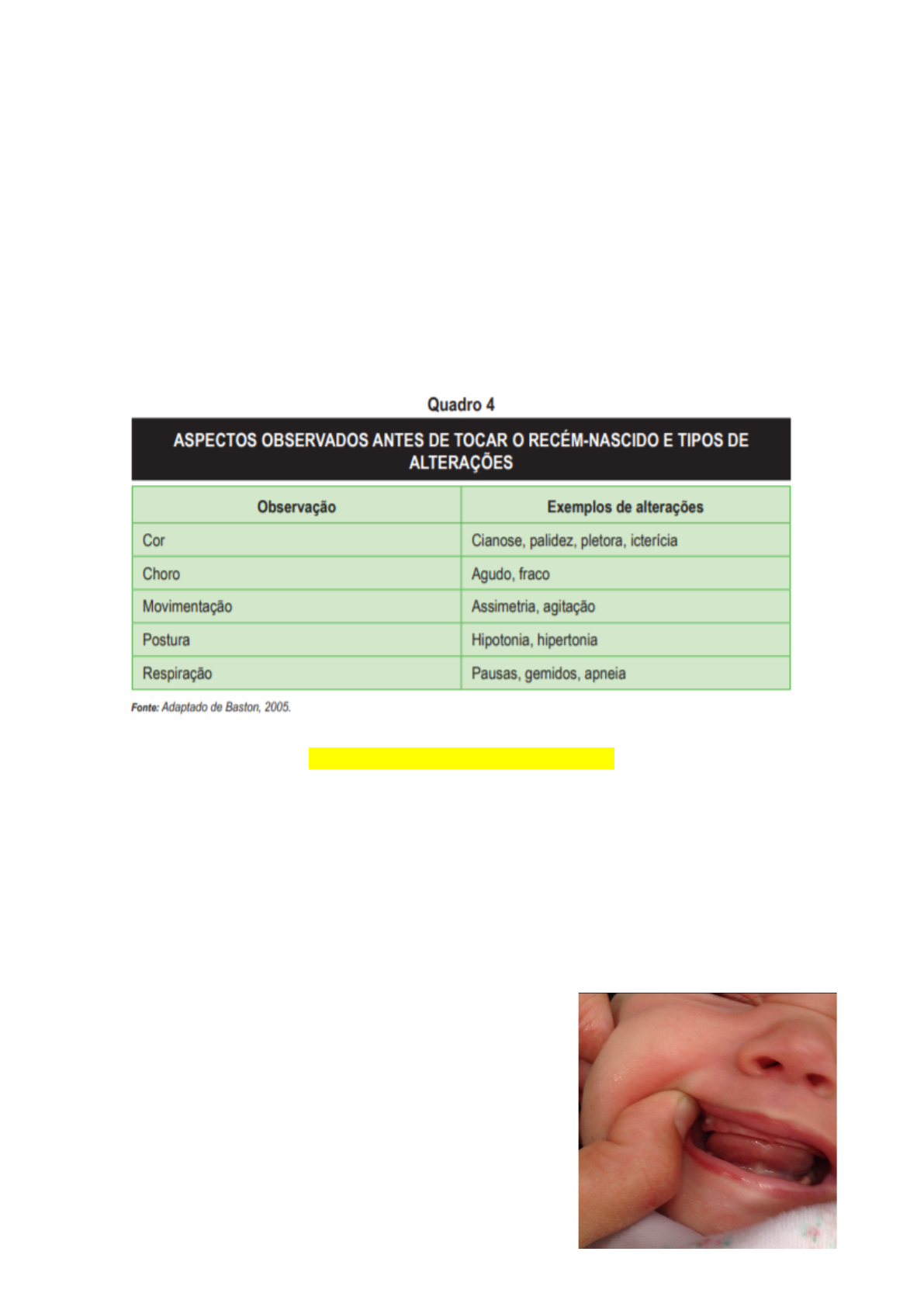 MEDIDAS ANTROPOMÉTRICAS DO RN ➔ Perímetro cefálico (PC) 33 a 35cm (biparietal) ➔ Perímetro torácico (PT) 30,5 a 33cm - 2 a 3 cm menor que o PC ➔ Estatura - 48 a 53cm ➔ Peso – 2500g a 4000g perda de 10% do peso na 1ª semana de vida Pesar com o RN despido, antes da alimentação ➔ Temperatura axilar: 36,5°C – 37,2 °C ➔ Frequência cardíaca: 120 a 160 batimentos/min ➔ Frequência respiratória: 30 a 60 movimentos respiratórios/minuto ➔ Pressão arterial: 65 mmHg/ 41 mmHg ASPECTOS GERAIS EVOLUÇÃO RN NO ALOJAMENTO Nome, IG: 38S, 3 dias de vida, ativo, reativo, choro forte, em alojamento conjunto com sua genitora que informa boa adaptação ao RN, descida do leite materno (colostro) e amamentando em livre demanda. Pele: coloração rósea, em geral, ao nascimento é recoberta pelo vérnix caseoso e lanugem; unhas; presença de equimoses, petéquias, descamação, hemangiomas, miliária, mancha mongólica, eritema tóxico; icterícia Cabeça: Fontanela bregmática e lambdóide (anterior e posterior) palpáveis e planas, presença de vérnix caseoso em grande parte da região parietal e frontal. Palpação do pescoço, sem presença de cistos, fístulas. ● Bossa sanguinolenta (?) - se tiver “bossa sanguinolenta em região grande da parte esquerda, medindo tanto ● Cefalohematoma ● Escoriações (tocotraumatismo); ● Suturas; abertas ou fechadas Abertura ocular espontânea, acianótico, anictérico (em caso de icterícia - esclerótica com icterícia ++/4+), pupilas isocóricas (em caso de anisocoria - com discreta anisocoria), reagentes à luz. Narinas pérvias , com presença de milium na em parte superior das narinas, mucosa oral rósea, observado pérolas de Epstein (cistos brancos ou amarelados que se podem formar nas gengivas e palato dos recém-nascidos, semelhantes a dentes que estão para nascer). Pescoço: ➔ Pescoço curto associa-se a síndromes genéticas; ➔ Integridade das clavículas; ➔ Simetria; ➔ A discreta extensão da cabeça permite sua melhor visualização. Deve-se palpar a parte mediana do pescoço, a fim de que sejam detectados o crescimento anormal da tireóide (bócio) e a presença de fístulas, cistos e restos de arcos branquiais. Em sua parte lateral, deve-se verificar a presença de estase jugular e palpar o músculo esternocleidomastoideo para verificar a presença de contraturas (torcicolo congênito). É importante verificar a mobilidade e o tônus do pescoço a fim de afastar anomalias das vértebras cervicais. A presença de pele redundante na nuca pode estar associada à síndrome de Down, e na parte lateral (o chamado pescoço alado) à síndrome de Turner. Tórax: Simétricos, com movimentos respiratórios uniformes, na ausculta abdominal ruídos hidroaéreos presentes. Na inspeção do mamilo Durante a ausculta pulmonar MV presentes, sem ruídos adventício, FR = 40 rpm. Ausculta cardíaca no pulso apical, com RCR (Ritmo Cardíaco Regular) em 2T, bulhas normofonéticas (BNF), FC = 130 bpm. MMSS e MMII , aquecidos, boa perfusão capilar ➔ Polidactilia e sindactilia; Pé torto; Displasia Coxofemural ➔ Assimetria pode estar associada à malformação cardíaca, pulmonar, da coluna e do arcabouço costal. O apêndice xifóide é frequentemente saliente. ➔ A frequência cardíaca varia, em média, de 120 a 140 bpm. RNs em repouso com frequência cardíaca acima de 160 bpm (taquicardia) devem ser mais bem avaliados. ➔ A frequência respiratória média é de 40 a 60 incursões por minuto (contada em 1 minuto). Frequência acima de 60 caracteriza a taquipneia, que deve ser investigada. Presença de tiragem intercostal supra e infraesternal é anormal, mesmo em RNs prematuros. https://dentalis.com.br/blog/nariz-escorrendo-e-um-sintoma-caracteristico-da-primeira-denticao/ https://dentalis.com.br/blog/nariz-escorrendo-e-um-sintoma-caracteristico-da-primeira-denticao/ Pulso? Abdome: globoso, semi-globoso, com movimentos peristálticos audíveis, plano, indolor, timpânico, coto umbilical gelatinoso e íntegro. Coto umbilical: duas artérias e uma veia; gelatinoso ao nascimento, mumifica-se com o passar dos dias; Presença de hiperemia e secreção local; Dorso: Coluna vertebral íntegra; Desvios; pigmentação anormal, tufos de cabelos na lombar; Fosseta sacral ou pilonidal podem sugerir meningocele ou outras anormalidades; Cisto sacralpilonidal Manchas mongólicas; Genitália externa e ânus: ➔ Feminina: grandes lábios proeminentes; secreção vaginal e pseudomenstruação; ➔ Masculina: presença dos testículos na bolsa escrotal; meato urinário; Ânus pérvio; Reflexos Testados : Babinski bilateral, Moro, Gasper, Sucção Vacinação: BCG, Hepatite B - Foi observada alguma reação adversa? - Como está o local de administração da BCG? - Explicar à mãe como se dá o processo de evolução da cicatriz vacinal de BCG. Evolução da cicatriz vacinal (pode variar de acordo com o laboratório produtor): - Após a administração, de 3 a 4 semanas, surge um nódulo (caroço) no local; - entre 4 a 5 semanas, o nódulo (caroço) evolui para uma pústula (ferida com pus); - em seguida, evolui para uma úlcera (ferida aberta) de 4 a 10 mm de diâmetro; - entre 6 e 12 semanas forma-se uma crosta (ferida com casca em processo de cicatrização). - Não cobrir a úlcera, não aplicar qualquer tipo de medicamento, não deixar a criança coçar. Conduta de Enfermagem ➔ Orientação da mãe quando a amamentação em livre demanda e esvaziamento das mamas a cada mamada; ➔ Orientação quanto a higiene oral , corporal e genital a cada troca de fraldas; ➔ Orientar a mãe para o cuidado com limpeza do coto umbilical com álcool 70% ENFERMEIRO → PUÉRPERA e RN Exame físico da puérpera: 1. Estado geral: postura, expressão facial, estado de ânimo, humor, locomoção, aparência geral, queixas. 2. SSVV: ● Pulso: Cheio? Filiforme? ● T (°C) / PA (mmHg): / FR (rpm): / FC (bpm): 3. Mamas: simetria; presença de ci