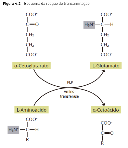 Bioquímica Metabolismo dos Aminoácidos As proteínas da dieta são digeridas no estômago, o suco gástrico , com pH ≅ 2,5 desnatura as proteínas e rompe as ligações de hidrogênio, deixando as ligações peptídicas expostas, pois as mesmas não podem ser quebradas por serem covalentes. A enzima pepsina é um endopeptidase, que quebra as ligações peptídicas e as digere em pequenos peptídeos. A pepsina não consegue clivar as proteínas em aminoácidos livres, pois necessitam se ancorar em uma superfície para realizar a digestão. Os peptídeos gerados no estômago são enviados para o duodeno, onde sofrem a ação das enzimas produzidas pelo pâncreas e lançadas no estômago. EXOPEPTIDADES São enzimas que clivam os peptídeos pelas extremidades, liberando dipeptídeos e aminoácidos livres. Dois tipos de exopeptidases são mais conhecidas: as carboxiexopeptidases, que clivam pela extremidade e são dotadas do grupo carboxil livre, e as aminoexopeptidases, que clivam o peptídeo pela extremidade e contêm o grupo amino livre. Catabolismo dos Aminoácidos Os aminoácidos quando em excesso ou não tendo sido reaproveitados são catabolizados. Nesse caso o grupo amino (NH2), ao passo que o esqueleto carbônico resultante pode ser reaproveitado pelo caminho. O processo catabólico ocorre em três etapas: i. transaminação, ii. desaminação oxidativa, iii. descarboxilação. Reações de Transaminação Ocorre no citoplasma de qualquer célula que esteja quebrando proteínas. Nessa etapa o grupo amino é transferido para uma molécula receptora (chamada de -cetoglutarato). Quando o aminoácido perde seu grupo amino, transforma-se em uma molécula chamada -cetoácido. Quando há a inserção de um grupo amino ao - cetoglutarato, o novo aminoácido é chamado de glutamato. Resumo: A transaminação é um processo bioquímico que envolve a transferência de um grupo amino de um aminoácido para um α-cetoácido, formando um novo aminoácido e um novo α-cetoácido. Esse processo ocorre com a ajuda da enzima transaminase, também conhecida como aminotransferase. Oxidação dos Aminoácidos 10-15% da energia produzida pelo organismo humano é proveniente dos aminoácidos. A oxidação dos aminoácidos ocorre após a transaminação. Todos os -cetoácidos gerados na etapa anterior terão um destino especifico, a produção de energia ou manutenção da glicemia. Resumo: Os aminoácidos são convertidos em α-cetoácidos por meio de uma reação de transaminação e, em seguida, esses α- cetoácidos passam por um processo de descarboxilação oxidativa para gerar acetil-CoA, que é um importante intermediário metabólico utilizado pelo corpo para produzir energia por meio do ciclo de Krebs e da cadeia respiratória. Além de produzir energia, a oxidação dos aminoácidos também desempenha um papel importante na regulação do equilíbrio de nitrogênio no corpo. Quando os aminoácidos são oxidados, o nitrogênio é removido na forma de ureia, que é excretada pelos rins. Isso ajuda a manter um equilíbrio adequado de nitrogênio no corpo e evitar o acúmulo de amônia, que é tóxico para as células. Desaminação Oxidativa É um processo bioquímico pelo qual os aminoácidos são convertidos em cetoácidos por meio da remoção de um grupo amino e sua subsequente oxidação. Essa reação é catalisada por enzimas conhecidas como desaminases. A desaminação oxidativa é um processo importante na regulação do equilíbrio de nitrogênio no corpo, pois permite que os aminoácidos sejam convertidos em outras moléculas que podem ser usadas para produzir energia ou para a síntese de outras proteínas. Além disso, também é importante na produção de neurotransmissores, como a dopamina e a serotonina, que são essenciais para a função cerebral adequada. Durante a desaminação oxidativa, o grupo amino é removido do aminoácido e convertido em amônia, que é então convertida em ureia no fígado e excretada pelos rins. A energia liberada durante a oxidação do grupo amino é capturada na forma de energia química nas moléculas de ATP, que são usadas pelo corpo como fonte de energia. A desaminação oxidativa ocorre em duas etapas. Na primeira etapa, o grupo amino é removido do aminoácido e é convertido em amônia pela ação da enzima desaminase. Na segunda etapa, a amônia é convertida em ureia pelo ciclo da ureia, um processo que ocorre no fígado. Descarboxilação As duas moléculas de amônia formadas no fígado devem ser eliminadas do organismo, por conta de sua toxicidade. A descarboxilação é um processo em que um grupo carboxila (-COOH) é removido de um composto orgânico, geralmente um ácido carboxílico, resultando na formação de um novo composto com um átomo de carbono a menos. A descarboxilação pode ser catalisada por enzimas específicas ou ocorrer de forma espontânea sob certas condições. Ocorre em diversos processos metabólicos no corpo humano. Por exemplo, durante o ciclo de Krebs, a descarboxilação de ácidos carboxílicos como o ácido cítrico e o ácido isocítrico produz dióxido de carbono e um composto com dois átomos de carbono a menos, que é usado para produzir energia. Além disso, a descarboxilação também ocorre na síntese de neurotransmissores como a serotonina, a dopamina e a histamina. A descarboxilação de aminoácidos pode ser uma forma de produzir neurotransmissores ou gerar energia por meio da produção de acetil-CoA. A descarboxilação de ácidos carboxílicos, por outro lado, pode ser uma forma de produzir intermediários metabólicos para a produção de energia. Ciclo da Ureia Ocorre no fígado e tem como função principal a remoção de amônia do corpo humano. A amônia é um composto tóxico e a sua acumulação no organismo pode levar a danos celulares e morte. O ciclo da ureia começa com a conversão da amônia em carbamoil fosfato pela enzima carbamoil fosfato sintetase. O carbamoil fosfato é en