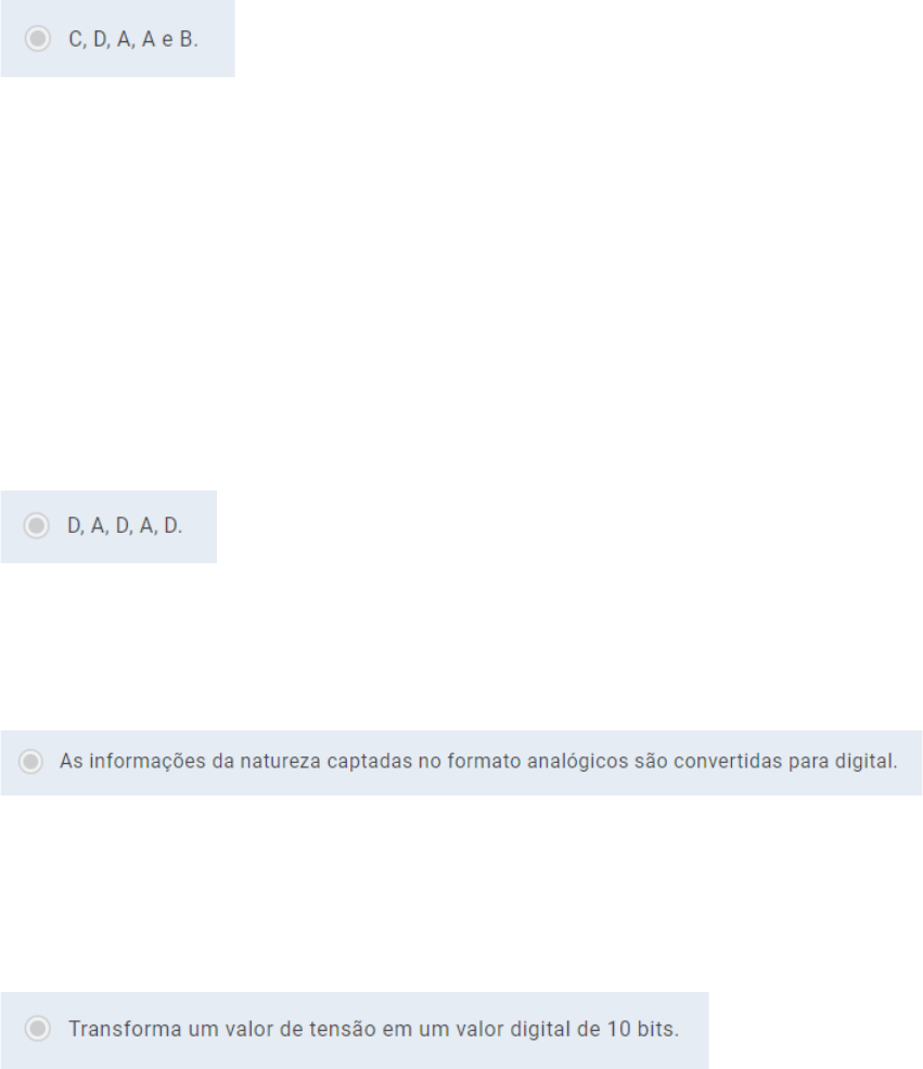 1 - O mundo está passando por uma série de mudanças de ordem política, econômica e social, sendo que o mercado tecnológico exerce sensível influência em praticamente todos os segmentos da estrutura de organização do estado moderno. Componentes como (1) microcontroladores, (2) Arduino, (3) conversores, entre outros, integram esse universo. Analise cada conjunto de informações e assinale a segunda coluna de acordo com a primeira. (A) Referente a microcontroladores. (B) Referente à placa Arduíno. (C) Referente a conversores A/D. (D) Referente a conversores D/A. ( ) Componentes cuja função é converter sinais para que possa ser interpretado pelo circuito. ( ) Realiza a conversão de sinais digitais em analógicos. ( ) Possui autonomia de funcionamento, não necessitando de componentes externos. ( ) Muito utilizado em sistemas embarcados para a função de controle. ( ) Hardware criado por pesquisadores italianos, muito simples de utilizar. Agora, assinale a alternativa que apresenta a sequência correta de respostas. 2 - As informações podem ser representadas eletronicamente nas formas digital e analógica. Podemos fazer a representação desses sinais por meio de uma onda senoidal para representar os sinais analógicos e uma onda quadrada para representar o sinal digital. Cada um desses sinais possui características próprias que devem ser consideradas para estudo ou pesquisa. Dados os itens a seguir, classifique-os como sinal A (analógico) ou como D (digital). I. ( ) Onda criada por meio do processo da amostragem. II. ( ) Onda criada a partir de sinais do ambiente. III. ( ) Após a conversão, as informações formam uma onda quadrada. IV. ( ) Onda que representa períodos com valores infinitos. V. ( ) Onda que representa valores discretos. Agora, escolha a alternativa que apresenta a sequência correta de respostas. 3 - O cotidiano das pessoas tem sido modificado com o avanço da interação com o mundo digital. Isso acontece devido ao crescimento na utilização dos equipamentos portáteis, microcontrolados que são capazes de conectar as pessoas com a internet. Esses dispositivos podem captar informações da natureza e encaminhar via rede mundial. Entre as alternativas apresentadas a seguir, qual descreve melhor a utilização de conversores A/D - D/A? 4 - O ATmega328P é um dos microcontroladores mais utilizados atualmente pela indústria de eletrônicos. Juntamente com a placa Arduino, oferece aos profissionais uma forma simples para a construção de projetos didáticos e interessantes, que ajudam a promover conhecimento em escolas técnicas e em universidades em todo o mundo. Entre as alternativas apresentadas a seguir, qual descreve de forma correta o ADC (analog-to-digital converter ou conversor analógico digital) do ATmega328P? 5 - O sinal digital é formado com partes do sinal analógico, sendo que a qualidade do sinal depende da quantidade de bits que o equipamento é capaz de processar. Isso é muito importante, pois, nos dias de hoje, o aspecto qualidade é algo que as empresas e o mercado consumidor buscam agregar às novas tecnologias que estão sendo lançadas. Considerando esse contexto, analise as seguintes afirmações. I. A amostragem de sinal pode ser representada por 1, 2, 3 ou mais bits. II. A amostragem de sinal possui apenas 4 bits. III. Cada período da faixa de sinal analógico pode ser representado por amostragens binárias. IV. A quantidade de bits da amostragem pode variar em uma única faixa de sinal. Assinale a alternativa que apresenta a(s) afirmativa(s) correta(s). 6 - As placas Arduino foram criadas para facilitar a criação de projetos com a utilização de microcontroladores e outros componentes, como sensores, servomotores etc. Desde sua criação, em 2005, essa plataforma vem crescendo e servindo como base para profissionais e estudantes colocarem em prática muitas ideias interessantes. Considerando esse contexto, analise as seguintes afirmações. I. Arduino é apenas uma plataforma online para programação. II. Arduino é um microcontrolador de alta capacidade. III. Arduino é um hardware que auxilia a interconexão dos microcontroladores e outros componentes. IV. Arduino é uma plataforma de prototipagem. Assinale a alternativa que apresenta a(s) afirmativa(s) correta(s). 7 - Os conversores analógico digitais realizam uma tarefa muito importante e presente na maioria dos equipamentos eletrônicos. Juntamente com a função de conversão, a qualidade é outra questão que as grandes empresas tratam com cuidado. Qualidade é sinônimo de vendas e lucratividade, então, torna-se importante considerar a resolução do sinal convertido. Entre as alternativas apresentadas a seguir, qual descreve corretamente a resolução de um sinal com tensão de entrada de 0,25V e conversor de 10 bits? 8 - Nos dias atuais, a informação é considerada um bem muito valioso, pois, a partir de sua análise, os especialistas conseguem extrair dados vitais para o crescimento dos negócios. O volume de informações está crescendo muito nos últimos anos devido a plataformas de serviços em nuvem e a internet das coisas, com os milhões de dispositivos móveis espalhados pelo mundo. Considerando esse contexto, analise as seguintes afirmações. I. Computação em nuvem é composta por computadores interligados em rede. II. IoT é um novo paradigma em que a rede mundial é conectada por dispositivos portáteis. III. Internet das coisas é uma estrutura de computadores em nuvem. IV. Internet das coisas é uma técnica para conexão de dispositivos. Assinale a alternativa que apresenta a(s) afirmativa(s) correta(s). 9 - A industrial fonográfica foi muito poderosa no passado. Ainda nos anos 1980, com o surgimento do compact disc, o CD, ocorreu uma revolução no mercado musical. Os antigos discos de vinil foram substituídos por mídias digitais, proporcionando ao público uma nova experiencia ao ouvir músicas, mas muitas pessoas passaram a critic