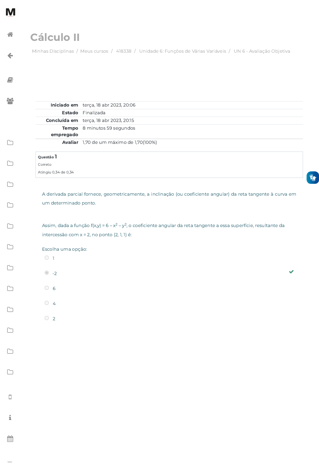26/04/23, 21:34 UN 6 - Avaliação Objetiva: Revisão da tentativa https://avap.multivix.edu.br/mod/quiz/review.php?attempt=2760191&cmid=1314549 1/5 Minhas Disciplinas / Meus cursos / 418338 / Unidade 6: Funções de Várias Variáveis / UN 6 - Avaliação Objetiva Cálculo II Iniciado em terça, 18 abr 2023, 20:06 Estado Finalizada Concluída em terça, 18 abr 2023, 20:15 Tempo empregado 8 minutos 59 segundos Avaliar 1,70 de um máximo de 1,70(100%) Questão 1 Correto Atingiu 0,34 de 0,34 A derivada parcial fornece, geometricamente, a inclinação (ou coe�ciente angular) da reta tangente à curva em um determinado ponto. Assim, dada a função f(x,y) = 6 – x – y , o coe�ciente angular da reta tangente a essa superfície, resultante da intercessão com x = 2, no ponto (2, 1, 1) é: Escolha uma opção: 1 -2 6 4 2 2 2 https://avap.multivix.edu.br/my/ https://avap.multivix.edu.br/course/view.php?id=20183 https://avap.multivix.edu.br/course/view.php?id=20183§ion=7 https://avap.multivix.edu.br/mod/quiz/view.php?id=1314549 https://avap.multivix.edu.br/my/ https://avap.multivix.edu.br/course/view.php?id=20183 https://avap.multivix.edu.br/user/index.php?id=20183 https://avap.multivix.edu.br/course/view.php?id=20183§ion=1 https://avap.multivix.edu.br/course/view.php?id=20183§ion=2 https://avap.multivix.edu.br/course/view.php?id=20183§ion=3 https://avap.multivix.edu.br/course/view.php?id=20183§ion=4 https://avap.multivix.edu.br/course/view.php?id=20183§ion=5 https://avap.multivix.edu.br/course/view.php?id=20183§ion=6 https://avap.multivix.edu.br/course/view.php?id=20183§ion=7 https://avap.multivix.edu.br/course/view.php?id=20183§ion=8 https://avap.multivix.edu.br/course/view.php?id=20183§ion=9 https://avap.multivix.edu.br/course/view.php?id=20183§ion=10 https://avap.multivix.edu.br/course/view.php?id=20183§ion=11 https://avap.multivix.edu.br/course/view.php?id=20183§ion=12 https://avap.multivix.edu.br/hooks/portal/ https://avap.multivix.edu.br/mod/page/view.php?id=1252%2F%22%20target%3D%22_blank https://avap.multivix.edu.br/calendar/view.php/ https://avap.multivix.edu.br/local/staticpage/view.php?page=biblioteca https://avap.multivix.edu.br/ 26/04/23, 21:34 UN 6 - Avaliação Objetiva: Revisão da tentativa https://avap.multivix.edu.br/mod/quiz/review.php?attempt=2760191&cmid=1314549 2/5 Questão 2 Correto Atingiu 0,34 de 0,34 Calcule a derivada parcial de primeira ordem em relação a x da função a seguir (0,35): a. b. c. d. e. https://avap.multivix.edu.br/my/ https://avap.multivix.edu.br/course/view.php?id=20183 https://avap.multivix.edu.br/user/index.php?id=20183 https://avap.multivix.edu.br/course/view.php?id=20183§ion=1 https://avap.multivix.edu.br/course/view.php?id=20183§ion=2 https://avap.multivix.edu.br/course/view.php?id=20183§ion=3 https://avap.multivix.edu.br/course/view.php?id=20183§ion=4 https://avap.multivix.edu.br/course/view.php?id=20183§ion=5 https://avap.multivix.edu.br/course/view.php?id=20183§ion=6 https://avap.multivix.edu.br/course/view.php?id=20183§ion=7 https://avap.multivix.edu.br/course/view.php?id=20183§ion=8 https://avap.multivix.edu.br/course/view.php?id=20183§ion=9 https://avap.multivix.edu.br/course/view.php?id=20183§ion=10 https://avap.multivix.edu.br/course/view.php?id=20183§ion=11 https://avap.multivix.edu.br/course/view.php?id=20183§ion=12 https://avap.multivix.edu.br/hooks/portal/ https://avap.multivix.edu.br/mod/page/view.php?id=1252%2F%22%20target%3D%22_blank https://avap.multivix.edu.br/calendar/view.php/ https://avap.multivix.edu.br/local/staticpage/view.php?page=biblioteca 26/04/23, 21:34 UN 6 - Avaliação Objetiva: Revisão da tentativa https://avap.multivix.edu.br/mod/quiz/review.php?attempt=2760191&cmid=1314549 3/5 Questão 3 Correto Atingiu 0,34 de 0,34 A função T(x,y) = 80 – 4x – 2y representa a temperatura em qualquer ponto de uma chapa metálica. Encontre a razão de variação da temperatura em relação à distância percorrida ao longo da placa na direção dos eixos x e y, no ponto (3, 4), sendo a temperatura medida em graus e a distância em cm. Escolha uma opção: -108 °/cm e -32 °/cm -12 °/cm e -12 °/cm -108 °/cm e -60 °/cm -9 °/cm e -16 °/cm -108 °/cm e -16 °/cm 3 2 https://avap.multivix.edu.br/my/ https://avap.multivix.edu.br/course/view.php?id=20183 https://avap.multivix.edu.br/user/index.php?id=20183 https://avap.multivix.edu.br/course/view.php?id=20183§ion=1 https://avap.multivix.edu.br/course/view.php?id=20183§ion=2 https://avap.multivix.edu.br/course/view.php?id=20183§ion=3 https://avap.multivix.edu.br/course/view.php?id=20183§ion=4 https://avap.multivix.edu.br/course/view.php?id=20183§ion=5 https://avap.multivix.edu.br/course/view.php?id=20183§ion=6 https://avap.multivix.edu.br/course/view.php?id=20183§ion=7 https://avap.multivix.edu.br/course/view.php?id=20183§ion=8 https://avap.multivix.edu.br/course/view.php?id=20183§ion=9 https://avap.multivix.edu.br/course/view.php?id=20183§ion=10 https://avap.multivix.edu.br/course/view.php?id=20183§ion=11 https://avap.multivix.edu.br/course/view.php?id=20183§ion=12 https://avap.multivix.edu.br/hooks/portal/ https://avap.multivix.edu.br/mod/page/view.php?id=1252%2F%22%20target%3D%22_blank https://avap.multivix.edu.br/calendar/view.php/ https://avap.multivix.edu.br/local/staticpage/view.php?page=biblioteca 26/04/23, 21:34 UN 6 - Avaliação Objetiva: Revisão da tentativa https://avap.multivix.edu.br/mod/quiz/review.php?attempt=2760191&cmid=1314549 4/5 Questão 4 Correto Atingiu 0,34 de 0,34 O IMC é a sigla para Índice de Massa Corporal e serve para avaliar o peso (P) de um indivíduo em relação à sua altura (A) e, assim, indicar se está dentro do peso ideal, de acordo com a tabela da Organização Mundial de Saúde (OMS): Condição IMC Muito abaixo do peso < 17 Abaixo do peso 17 ≤ IMC ≤ 18,49 Peso normal 18,5 ≤ IMC ≤ 24,99 Acima do peso 25 ≤ IMC ≤ 29,99 Obesidade I 30 ≤ IMC ≤ 34,99 Obesidade II (severa) 35 