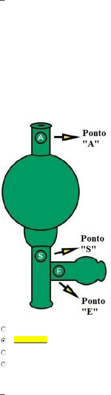 1. Nas práticas do laboratório virtual, um dos experimentos aborda as técnicas de medições de massa e volume de líquidos. O experimento demonstra o uso das principais vidrarias e acessórios utilizados em laboratórios de química geral. No experimento, é utilizado um pipetador de 3 vias (pêra de sucção) em conjunto com a pipeta graduada para a transferência de líquido. Com base no sumário teórico, roteiro da prática e na condução do experimento no laboratório virtual, associe os itens descritos na imagem do pipetador de 3 vias, utilizando o código a seguir: I- Ponto "A" da pêra de sucção. II- Ponto "S" da pêra de sucção. III- Ponto "E" da pêra de sucção. ( II ) Quando pressionado, succiona o líquido do béquer para dentro da pipeta graduada. ( III ) Quando pressionado, libera o líquido da pipeta graduada para outro recipiente. ( I ) Quando pressionado, retira o ar do interior da pêra de sucção para em seguida acoplar na extremidade superior da pipeta graduada. Assinale a alternativa que apresenta a sequência CORRETA: a) I - II - III. b) II - III - I. c) III - II - I. d) III - I - II. 2. A filtração é uma das técnicas de separação utilizadas no laboratório de química. A montagem padrão de um sistema de filtração utiliza alguns materiais, equipamentos e vidrarias específicos. https://www.uniasselvi.com.br/extranet/o-2.0/prova_ead/n2_ead_avaliacao_disciplina_online_alun.php#questao_1 https://www.uniasselvi.com.br/extranet/o-2.0/prova_ead/n2_ead_avaliacao_disciplina_online_alun.php#questao_2 Com base na técnica de separação por filtração simples e a vácuo, classifique V para as sentenças verdadeiras e F para as falsas: ( V ) A utilização do papel filtro pregueado aumenta a velocidade de filtração. ( F ) O filtro de papel do tipo cone simples é usado quando o objetivo é a separação de uma mistura homogênea de dois líquidos. ( F ) Líquidos heterogêneos são aqueles que possuem polaridades iguais. Assinale a alternativa que apresenta a sequência CORRETA: a) V - F - F. b) F - V - F. c) F - V - V. d) V - F - V. 3. A filtração é uma das técnicas de separação utilizadas no laboratório de química. A montagem padrão de um sistema de filtração utiliza alguns materiais, equipamentos e vidrarias específicos. Com base na técnica de separação por filtração simples e a vácuo, analise as afirmativas a seguir: I- O funil de Buchner deve ser adaptado ao Kitassato com um anel ou rolha de borracha para evitar a entrada de ar, caso a filtração seja conduzida a vácuo. II- O tipo de papel filtro utilizado na filtração é um dos parâmetros que influenciam a velocidade de filtração. III- O papel filtro pregueado reduz a velocidade de filtração. Assinale a alternativa CORRETA: a) As afirmativas II e III estão corretas. b) As afirmativas I e III estão corretas. c) As afirmativas I e II estão corretas. d) Somente a afirmativa I está correta. 4. Pipetas volumétricas e graduadas são vidrarias utilizadas para executar transferências e coletas de líquidos durante o preparo de soluções. O tipo de pipeta apropriado a ser utilizado depende das condições do experimento a ser executado. Sobre este tipo de vidraria de laboratório e técnicas de pipetagem, assinale a alternativa CORRETA: a) Uma pipeta volumétrica calibrada em 10 mL pode ser usada para uma coleta precisa de líquido em um volume de 9 mL. b) Deve-se evitar o uso de pipetadores ou peras de sucção na coleta de líquidos. c) As pipetas volumétricas são utilizadas quando não há necessidade de grande precisão no volume dos líquidos coletados. d) As pipetas graduadas permitem a coleta de volumes variáveis de líquido. 5. A filtração é uma das técnicas de separação utilizadas no laboratório de química. A montagem padrão de um sistema de filtração utiliza alguns materiais, equipamentos e vidrarias específicos. Com base na técnica de separação por filtração simples e a vácuo, analise as afirmativas a seguir: I- Alguns materiais utilizados na filtração a vácuo são: Kitassato, funil de Buchner e papel filtro. II- O papel filtro deve ser colocado sobre os orifícios do funil de Buchner para impedir a passagem do líquido. III- O vácuo parcial criado pela bomba ou trompa de vácuo ocorre devido a retirada de ar de dentro do Kitassato. Assinale a alternativa CORRETA: https://www.uniasselvi.com.br/extranet/o-2.0/prova_ead/n2_ead_avaliacao_disciplina_online_alun.php#questao_3 https://www.uniasselvi.com.br/extranet/o-2.0/prova_ead/n2_ead_avaliacao_disciplina_online_alun.php#questao_4 https://www.uniasselvi.com.br/extranet/o-2.0/prova_ead/n2_ead_avaliacao_disciplina_online_alun.php#questao_5 a) As afirmativas I e II estão corretas. b) Somente a afirmativa II está correta. c) As afirmativas I e III estão corretas. d) Somente a afirmativa III está correta. 6. Pipetas volumétricas e graduadas são vidrarias utilizadas para executar transferências e coletas de líquidos durante o preparo de soluções. O tipo de pipeta apropriado a ser utilizado depende das condições do experimento a ser executado. Sobre este tipo de vidraria de laboratório e técnicas de pipetagem, assinale a alternativa CORRETA: a) Deve-se evitar o uso de pipetadores ou peras de sucção na coleta de líquidos. b) As pipetas volumétricas não devem ser aquecidas ou secadas à quente pois podem perder a precisão com a dilatação do vidro. c) Uma pipeta volumétrica calibrada em 10 mL pode ser usada para uma coleta precisa de líquido em um volume de 11 mL. d) As pipetas graduadas permitem a coleta de volumes fixos de líquido. 7. A filtração é uma das técnicas de separação utilizadas no laboratório de química. A montagem padrão de um sistema de filtração utiliza alguns materiais, equipamentos e vidrarias específicos. Sobre a técnica de separação por filtração simples e à vácuo, analise as afirmativas a seguir: I- O vácuo pode ser induzido com auxíl