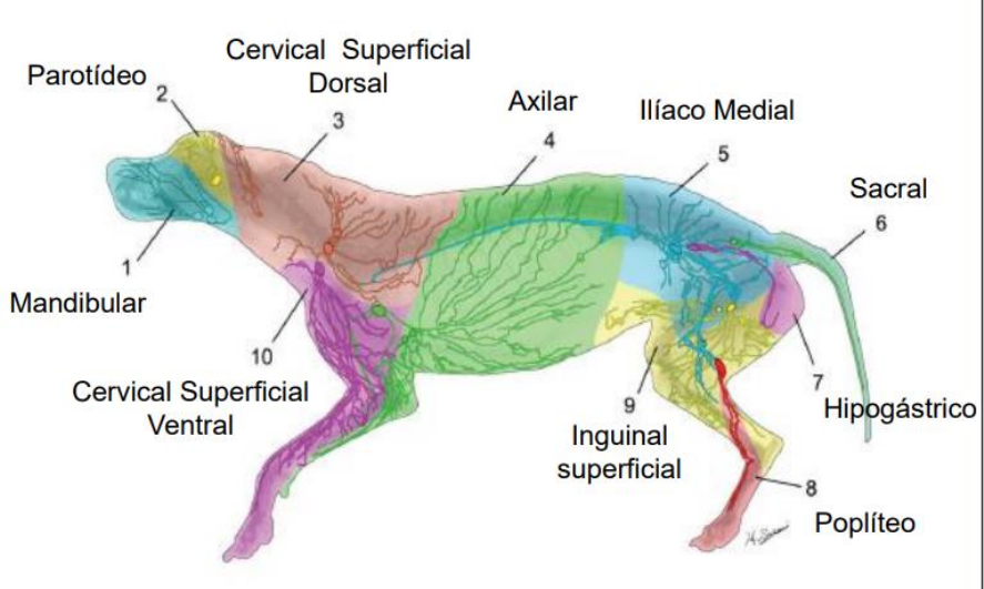 Linfonodos Sentinelas O linfonodo sentinela é o primeiro linfonodo que recebe a drenagem linfática proveniente de um câncer. A aplicação do azul patente ou fluoresceína na região do tumor primário permite a identificação do primeiro linfonodo que recebe o fluxo linfático. O linfonodo sentinela é então removido e submetido à análise histopatológica e, a dissecção dos planos linfáticos mais profundos é indicada nos casos de positividade. Na Medicina Veterinária, no entanto, o estadiamento do linfonodo sentinela não apresenta a relevância e importância demonstrada na Medicina Humana, devido à menor complexidade das conexões e drenagens linfáticas, mas existem indicações potenciais e a técnica pode ser útil para determinadas neoplasias da cabeça e pescoço. Qual linfonodo retirar? Os linfonodos sentinelas são definidos como os primeiros de uma cadeia linfática regional a drenar a linfa do sítio primário neoplásico, sendo a primeira via de disseminação metastática. Fonte: Suami et al., 2013.