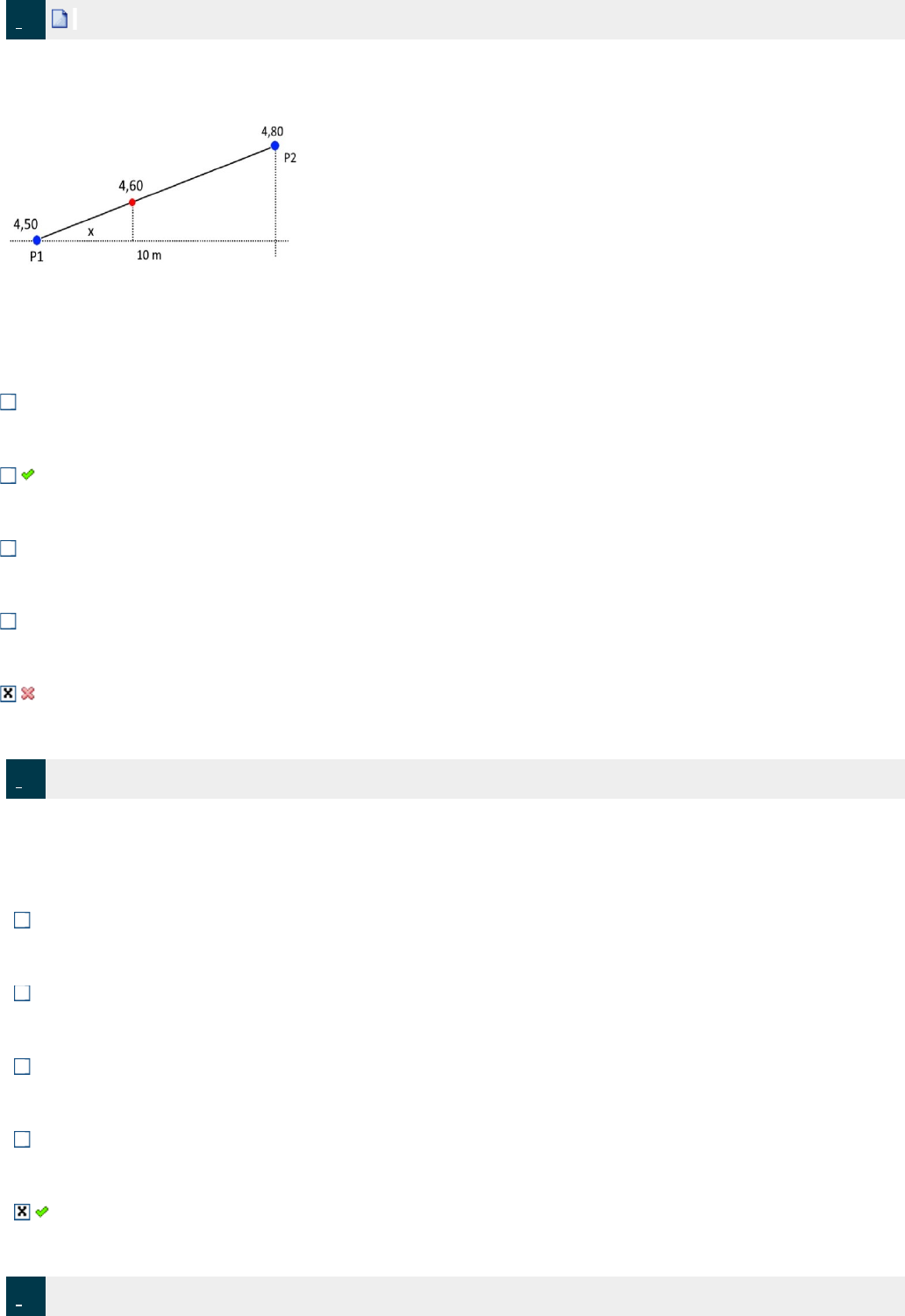 1. Considere as informações da figura a seguir. Sabendo que as cotas de P1 e P2 são, respectivamente, de 4,50 e 4,80, e que estão separadas por uma distância de 10 m, calcule a que distância de P1 estará a cota de 4,60. 5,25 m 3,33 m 7,77 m 4,30 m 6,66 m 2. A declividade pode ser apresentada em unidades de graus e: Milhas Polegadas Metros Passos Porcentagem 3. Considere o desnível igual 4,5 m entre os pontos A e B, sendo a altitude de A igual a 99,25 m. A altitude de B é igual a: 102,35 100,25 103,75 104,5 95,25 4. A cota se refere à altura contada até o: Geocentro Geoide Plano de referência Linha normal Elipsoide 5. Um topógrafo foi contratado para determinar o desnível entre a montante e jusante de uma tubulação de água, com 10 m de comprimento horizontal. Então o topografo posicionou a mira falante na montante (ré) e realizou a leitura igual a 0,785m, em seguida posicionou a mira na jusante (vante) e realizou a leitura igual a 2,156m. Assinale a alternativa que representa o desnível entre montante e jusante da tubulação. 1,470m 3,941m 2,371m 1,371m 2,941m 6. Ref.: 5430264 Foi realizado o transporte de RN conforme a figura abaixo, partindo do RN1 (altitude é 125,000m) ao RN2, as seguintes leituras foram tomadas em milímetros, na ordem em que foram coletadas: 285; 1078; 1793; 1395; 1686; 687; 1201; 3002; 2914; 417. Determine a cota na estaca 6+00 e apresente a caderneta de campo. 126,000m 132,191m 126,191m 124,605m 125,398m 7. Que processo de representação do relevo representa a interseção do terreno com planos verticais que passam pelos alinhamentos nele medidos? Curvas de nível. Planimetria. Hachuras. Desenho de perfil. Pontos cotados. 8. A altimetria é a parte da topografia que se destina a determinação dos desníveis existentes em uma determinada porção da superfície da Terra, descrevendo assim o relevo desta porção. Em virtude da natureza e do processo de medida utilizado na determinação das cotas ou das altitudes, os nivelamentos topográficos podem ser classificados em: geométricos, trigonométricos, barométricos, taqueométricos ou por receptores de satélites. Dado o nivelamento geométrico representado na figura abaixo e sabendo que a cota no ponto RN-1 é igual a 134,541 m. Quais são as cotas dos pontos 5, 6 e 7? 138,960 m, 137,514 m e 137,293 m, respectivamente. 130,960 m, 131,514 m e 132,293 m, respectivamente. 143,960 m, 142,514 m e 142,293 m, respectivamente. 133,960 m, 132,514 m e 132,293 m, respectivamente. 142,962 m, 142,544 m e 138,213 m, respectivamente. 9. Considere que por intermédio de um nivelamento geométrico simples você realizou leituras com um nível mecânico automático sobre duas miras graduadas localizadas sobre os pontos (P) e (Q) do terreno, obtendo-se os valores indicados na Tabela abaixo. Ponto visado Leitura de ré (mm) Leitura de vante (mm) P 2574 Q 857 Considerando os valores indicados na tabela e sabendo que o valor da altitude do ponto (P) é igual a 845,149 metros, calcule a altitude do ponto (Q). Fonte: SEGANTINE, Paulo; SILVA, Irineu. Exercícios de Topografia para engenharia: teoria e prática de geomática. Elsevier Brasil, 2015. 857,321m 847,723m 846,866m 846,866mm 1,717m 10. Ref.: 5310558 O método de nivelamento que proporciona resultados mais acurados é o: De nível de precisão Barométrico Geométrico De mangueira Trigonométrico