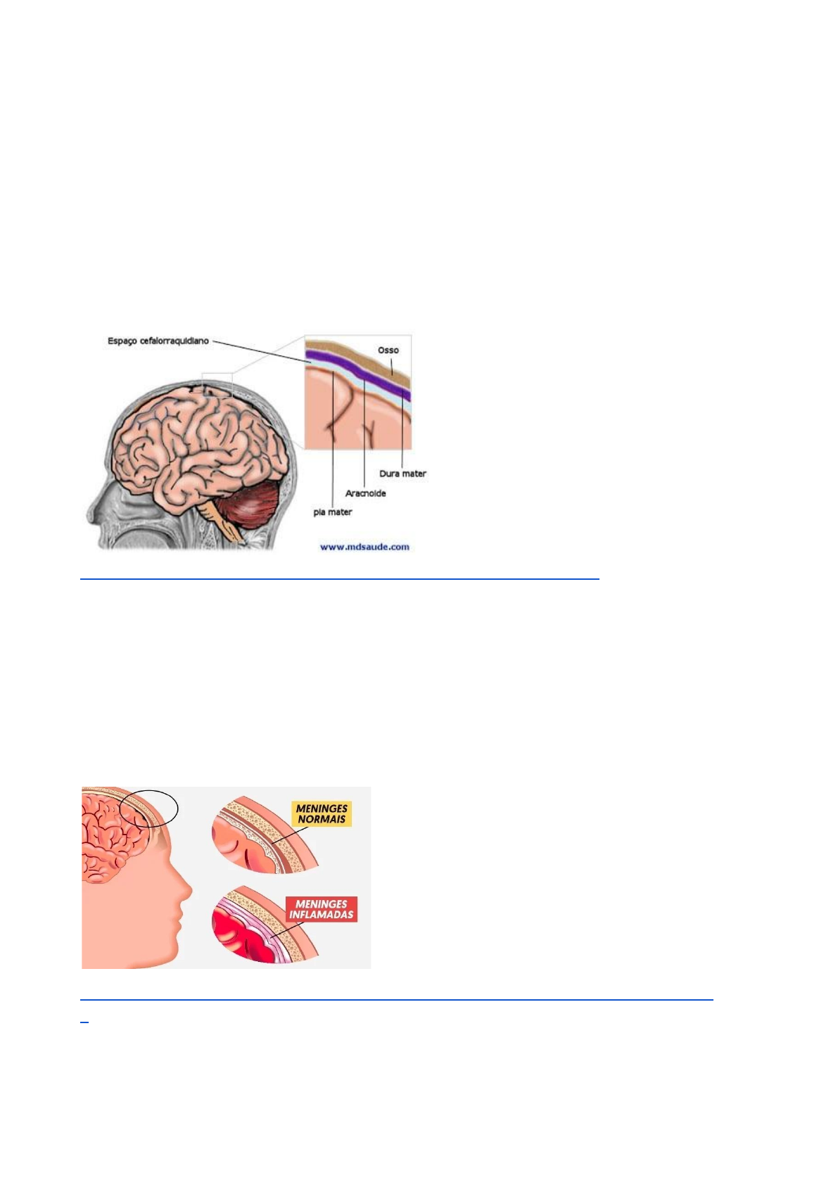 O QUE É A MENINGITE? A meninge é uma membrana que serve como barreira física contra agentes infecciosos, sendo composta por três camadas: Pia Máter: é a membrana mais próxima do cérebro Aracnóide: é a membrana do meio, localizada entre a pia máter e a dura máter. Dura Máter: é a membrana mais externa, próxima ao osso do crânio. É a camada mais grossa e opaca. O líquor (líquido cefalorraquidiano) fica localizado entre a pia máter e a aracnóide. https://www.mdsaude.com/wp-content/uploads/2009/05/meninges.jpg A meningite é uma inflamação das meninges, membranas que envolvem o cérebro e a medula espinhal. Pode ser causada por diversos agentes infecciosos, como bactérias, vírus e fungos, dentre outros, e agentes não-infecciosos (ex: traumatismo). As meningites virais e bacterianas são as de maior importância para a saúde pública, considerando a magnitude de sua ocorrência e o potencial de produzir surtos. No Brasil, a meningite é considerada uma doença endêmica (recorrente), deste modo, casos da doença são esperados ao longo de todo o ano, com a ocorrência de surtos e epidemias ocasionais. https://static.tuasaude.com/media/article/py/cs/meningite-meningococica_30305.web p https://www.mdsaude.com/wp-content/uploads/2009/05/meninges.jpg https://static.tuasaude.com/media/article/py/cs/meningite-meningococica_30305.webp https://static.tuasaude.com/media/article/py/cs/meningite-meningococica_30305.webp QUAIS SÃO OS TIPOS DE MENINGITE? As meningites virais e bacterianas são as de maior importância para a saúde pública, considerando a magnitude de sua ocorrência e o potencial de produzir surtos. No Brasil, a meningite é considerada uma doença endêmica (recorrente), deste modo, casos da doença são esperados ao longo de todo o ano, com a ocorrência de surtos e epidemias ocasionais. A ocorrência das meningites bacterianas é mais comum no outono-inverno, e das virais na primavera-verão. Meningite bacteriana A meningite bacteriana é a forma mais grave. Essa forma de meningite costuma ser causada pelas bactérias: •Neisseria meningitidis (meningococo) • Haemophilus influenzae • Streptococcus pneumoniae • Mycobacterium tuberculosis Meningite viral A meningite também pode ser causada por vírus, normalmente da família dos Enterovírus (Echovírus e coxsackievírus A e B são os mais comuns). Meningite fúngica A meningite fúngica é uma forma rara, sendo, geralmente, resultado da propagação de um fungo através do sangue para as meninges. A meningite fúngica é típica de pacientes imunossuprimidos, como nos casos de portadores de AIDS ou câncer. A meningite por fungos não é contagiosa e sua principal causa são os fungos Cryptococcus e Coccidioides. ● A ocorrência das meningites bacterianas é mais comum no outono-inverno, e das virais na primavera-verão. Quais diferenças nos tipos de transmissão?? Meningite Bacteriana A bactéria comumente responsável pelos quadros mais graves e fatais é o meningococo. Interessante saber que há diferentes sorotipos de meningococos, chamados pelas letras: A, B, C, W, Y. Estes sorotipos variam sua incidência ao longo do tempo. Há alguns anos, em nosso meio, tem predominado o sorotipo C. Geralmente, as bactérias que causam meningite bacteriana se espalham de uma pessoa para outra por meio das vias respiratórias, por gotículas e secreções do nariz e da garganta. Meningite Viral As meningites virais podem ser transmitidas de diversas maneiras a depender do vírus causador da doença. No caso dos Enterovírus, a contaminação é fecal-oral, e os vírus podem ser adquiridos por contato próximo (tocar ou apertar as mãos) com uma pessoa infectada; tocar em objetos ou superfícies que contenham o vírus e depois tocar nos olhos, nariz ou boca antes de lavar as mãos. Meningite causada por Fungos A meningite fúngica não é transmitida de pessoa para pessoa. Geralmente os fungos são adquiridos por meio da inalação dos esporos (pequenos pedaços de fungos) que entram nos pulmões e podem chegar até as meninges membranas que envolvem o cérebro e a medula espinhal. Pessoas com diabetes e portadoras do vírus HIV têm mais risco de desenvolver a doença. Quais são os sintomas?? A pessoa infectada apresenta os seguintes sintomas e sinais: ● febre; ● rigidez na nuca; ● dor de cabeça; ● mal-estar; ● náusea e vômito; ● confusão mental; ● sensibilidade à luz; ● dores intensas ou dores nos músculos, articulações, peito ou barriga; ● manchas vermelhas na pele, parecidas com picadas; (Na meningite por meningococo pode surgir um rash, que são lesões de pele avermelhadas que, às vezes, causa confusão com outras infecções, tais como rubéola, sarampo ou até dengue.) ● respiração rápida; ● calafrios. https://www.mdsaude.com/wp-content/uploads/2012/12/dm-L1.jpg https://www.mdsaude.com/wp-content/uploads/2012/12/dm-L1.jpg https://clinprosaude.com.br/wp-content/uploads/2018/08/meningite.jpg Como é feito o diagnóstico?? O diagnóstico é feito através da punção lombar, onde consegue-se aspirar o liquor para avaliação laboratorial. Através desta avaliação é possível determinar não só a existência de meningite, como também a sua causa. O médico suspeita de meningite, ele solicita a coleta de amostras de sangue e líquido cerebroespinhal (líquor). O laboratório então testa as amostras para detectar o agente que está causando a infecção. https://brasilianeuroclinica.com.br/wp-content/uploads/2021/06/Puncao-lombar-liquor -LCR.png Quais exames são feitos? Os principais exames são: - exame quimiocitológico do líquor; - bacterioscopia direta (líquor); - cultura (líquor, sangue, petéquias ou fezes); - contra-imunoeletroforese cruzada – CIE (líquor e soro); - aglutinação pelo látex (líquor e soro). O aspecto do líquor, embora não considerado um exame, funciona como um indicativo. O líquor normal é límpido e incolor. Nos processos infec