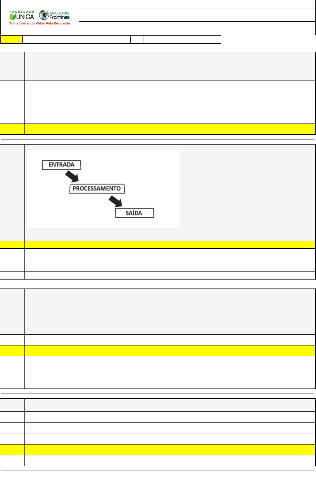 08/03/2023 20:50:25 1/2 REVISÃO DE SIMULADO Nome: ADRIANA GOMES ALVES Disciplina: Linguagem de Programação e Ferramentas Computacionais Respostas corretas são marcadas em amarelo X Respostas marcardas por você. Questão 001 Como se chama a parte da memória que os sistemas utilizam para armazenar temporariamente os dados durante um processamento de transferência de informações? A) CompactFlash. X B) Memória RAM. C) EEPROM. D) Memória Flash. E) Buffer. Questão 002 (SELECON, 2019) Em Informática, o processamento de dados pode ser visualizado de acordo com o diagrama de blocos da figura a seguir. Entre os componentes de hardware utilizados na configuração dos microcomputadores e notebooks, existem dispositivos que funcionam exclusivamente na entrada, empregados na obtenção dos dados a serem processados pela CPU. Dois exemplos desses dispositivos são: A) scanner e teclado X B) mouse e pendrive C) teclado e plotter D) pendrive e scanner E) plotter e mouse Questão 003 (CONPASS, 2015) A UCP – Unidade Central de Processamento – de um microprocessador, também conhecida como CPU, é composta por duas unidades funcionais básicas. Assinale a alternativa que apresenta as duas unidades funcionais componentes da UCP/CPU de um microprocessador, segundo o modelo de Von Neumann. A) DVD – Digital Video Disc; e, Unidade de Programação. B) ULA – Unidade de Lógica e Aritmética; e, Unidade de Controle. C) USB – Universal Serial Bus; e, Unidade de Controle. X D) ULA – Unidade de Lógica e Aritmética; e, Memória Principal. E) DVI – Digital Video Interface; e, Unidade Programação. Questão 004 Com relação à hierarquia de memórias, qual é a memória mais rápida? A) Disco magnético. B) Memória RAM. X C) Disco óptico. D) Registrador. E) Memória cache. 08/03/2023 20:50:25 2/2 Questão 005 Ao se dividir um HD em duas partições, o SO apresentará as partições de qual maneira? A) D: e E: B) A: e C: X C) A: e B: D) B: e C: E) C: e D: Questão 006 São componentes do disco rígido: X A) Plato, eixo, alternador, braço atuador e cabeça de leitura e gravação. B) Platter, axial, atuador, braço atuador e cabeça de leitura e gravação. C) Platter, eixo, atuador, braço atuador e rolamento de leitura e gravação. D) Platter, eixo, atuador, braço atuador e cabeça de leitura e gravação. E) Platter, eixo, alternador, braço atuador e cabeça de leitura e gravação. Questão 007 (UFMT, 2021 - Adaptada) A figura abaixo apresenta os componentes básicos da arquitetura de Von Neumann de computadores, numerados de 1 a 5. De acordo com a figura, assinale a alternativa que associa corretamente cada número ao componente especificado. A) 1-Entrada, 2-Memória, 3-Unidade de Controle, 4-Unidade Lógica e Aritmética, 5-Saída. B) 1-Entrada, 2-Unidade de Controle, 3-Unidade Lógica e Aritmética, 4-Memória, 5-Saída. C) 1-Saída, 2-Unidade Lógica e Aritmética, 3-Unidade de Controle, 4-Memória, 5-Entrada. D) 1-Saída, 2-Unidade Lógica e Aritmética, 3-Unidade de Controle, 4-Entrada, 5- Memória X E) 1-Entrada, 2-Unidade de Controle, 3- Memória, 4-Unidade Lógica e Aritmética, 5-Saída. Questão 008 (OBJETIVA-2021) Em relação aos conceitos de informática, sobre os periféricos de um computador, analisar a sentença abaixo: Os periféricos são dispositivos instalados junto ao computador, cuja função é auxiliar na comunicação entre o usuário e a máquina (1ª parte). Impressora é um exemplo de periférico (2ª parte). O monitor é um exemplo de periférico de entrada (3ª parte). A sentença está: A) Totalmente correta. X B) Correta somente em suas 1ª e 2ª partes. C) Correta somente em suas 2ª e 3ª partes. D) Correta somente em suas 1ª e 3ª partes. E) Correta somente em sua 2ª parte.