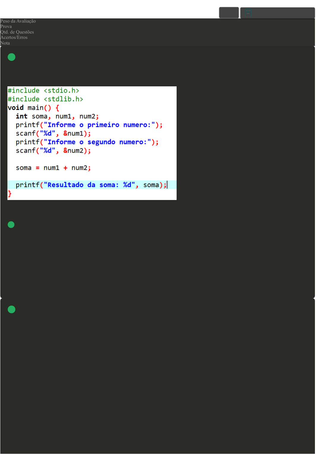 28/04/2023, 14:39 Avaliação I - Individual about:blank 1/4 Prova Impressa GABARITO | Avaliação I - Individual (Cod.:739666) Peso da Avaliação 1,50 Prova 46353874 Qtd. de Questões 10 Acertos/Erros 8/2 Nota 8,00 Analise o código a seguir: Qual o resultado da variável soma se as entradas forem respectivamente, 93 e 66? A 159. B 158. C 157. D 160. As palavras reservadas possuem como objetivo permitir que as tarefas a serem executadas e solicitadas ocorram de forma correta pelo computador, isso pode definir como os objetos, variáveis, constantes e subprogramas devem ser criados para esta linguagem de programação. Conforme Cocian (2004, p. 97), “a linguagem de programação em C, possui 32 palavras reservadas, no entanto isso está definido pelos padrões da American National Standards Institute (ANSI)”. Com base na palavra reservada, assinale a alternativa INCORRETA: FONTE: COCIAN, Luis Fernando Espinosa. Manual da linguagem C. Canoas: Ed. ULBRA, 2004, 500p. A CONTINUE. B WHILE. C STATIC. VOLTAR A+ Alterar modo de visualização 1 2 28/04/2023, 14:39 Avaliação I - Individual about:blank 2/4 D NUMERO. Na Linguagem de programação em C o comando de atribuição define ou re-define o valor armazenado no local de armazenamento indicado por um nome de varável. Na maioria das linguagens de programação é imperativas o comando de atribuição é uma das declarações básicas. O símbolo deste pode ser identificado por: A -> B = C <- D <> Sobre o código a seguir, há um erro em sua construção. Qual o problema que este código apresentará em sua execução? A Loop infinito. B Erro de formatação. C Declaração incorreta de variável. D Tipo indefinido. A estrutura de dados surgiu com o objetivo de auxiliar a tecnologia da informação a estruturar a linguagem de programação, nesse sentido podem ser utilizados vários tipos de associações entre estruturas de dados e linguagem de programação. Com base na Interpretação, assinale a alternativa CORRETA: A O interpretador possui como função executar o código-fonte, traduzindo o programa a cada linha de código que vai sendo escrito (digitado), assim que o computador consegue interpretar os códigos, o programa vai sendo executado, a cada execução do código o programa precisa ser novamente 3 4 5 28/04/2023, 14:39 Avaliação I - Individual about:blank 3/4 interpretado pela memória Ram do Computador. B O interpretador possui como função executar o código-fonte, traduzindo o programa a cada linha de código que vai sendo escrito (digitado), assim que o computador consegue interpretar os códigos, o programa vai sendo executado, a cada execução do código o programa precisa ser novamente interpretado pelo computador. C O interpretador possui como função executar o código-fonte, traduzindo o programa a cada linha de código que vai sendo escrito (digitado), assim que o computador consegue interpretar os códigos, o Sistema Operacional vai sendo executado, a cada execução do código o programa precisa ser novamente interpretado pelo computador. D O interpretador possui como função executar o código-fonte, traduzindo o programa a cada duas linhas de código que vai sendo escrito (digitado), assim que o computador consegue interpretar os códigos, o programa vai sendo executado, a cada execução do código o programa precisa ser novamente interpretado pelo computador. A estrutura de dados surgiu com o objetivo de auxiliar a tecnologia da informação a estruturar a linguagem de programação, nesse sentido podem ser utilizados vários tipos de associações entre estruturas de dados e linguagem de programação. Com base nos Interpretadores e Compiladores, assinale a alternativa CORRETA: A Os programas interpretados tornam o processo de tradução para o sistema máquina mais lento para sua execução, possuem maior dinamicidade e podem ser utilizados em vários sistemas operacionais, possuem maior portabilidade. B Os programas interpretados tornam o processo de tradução para o sistema máquina mais rápido para sua execução. C Os programas compilados tornam o processo de tradução para o sistema máquina mais rápido para sua execução. D Os programas interpretados tornam o processo de tradução para o sistema máquina mais rápido para sua execução, possuem maior dinamicidade e podem ser utilizados em vários sistemas operacionais, possuem menor portabilidade. Os compiladores são identificados como programas que realizam a tradução do código-fonte para uma linguagem compilada e entendível para o computador. Com base nos três componentes da compilação de programas, assinale a alternativa CORRETA: A Código-código, Código-objeto e Código executável. B Código-código, Código-objeto e Código printável. C Código-fonte, Código-objeto e Código executável. D Código-fonte, Código-objeto e Código printável. Conforme site JAVABR, o Java é uma linguagem de programação e plataforma computacional lançada pela primeira vez pela Sun Microsystems em 1995. O Java é rápido, seguro e confiável. Com base na linguagem Java, classifique V para as sentenças verdadeiras e F para as falsas: ( ) O Java é bastante inflexível, por conta de não possuir bibliotecas. ( ) A programação Java possui como objetivo programar em alto nível, onde seus comandos e códigos de programas são compilados diretamente em uma máquina virtual, tornando o processo muito mais rápido e não consumindo, assim, memória e processamento de um computador. 6 7 8 28/04/2023, 14:39 Avaliação I - Individual about:blank 4/4 ( ) O grande diferencial desta linguagem, além de ser popularmente muito utilizada, é sua aplicação web. ( ) A base da programação Java são as classe e seus objetos, que 'imita', o mundo real, o que facilita bastante a programação. Assinale a alternativa que apresenta a sequência CORRETA: A F – V – F – V. B V – F – V – F. C F – V – V – V. D V – F – F – V. A estr