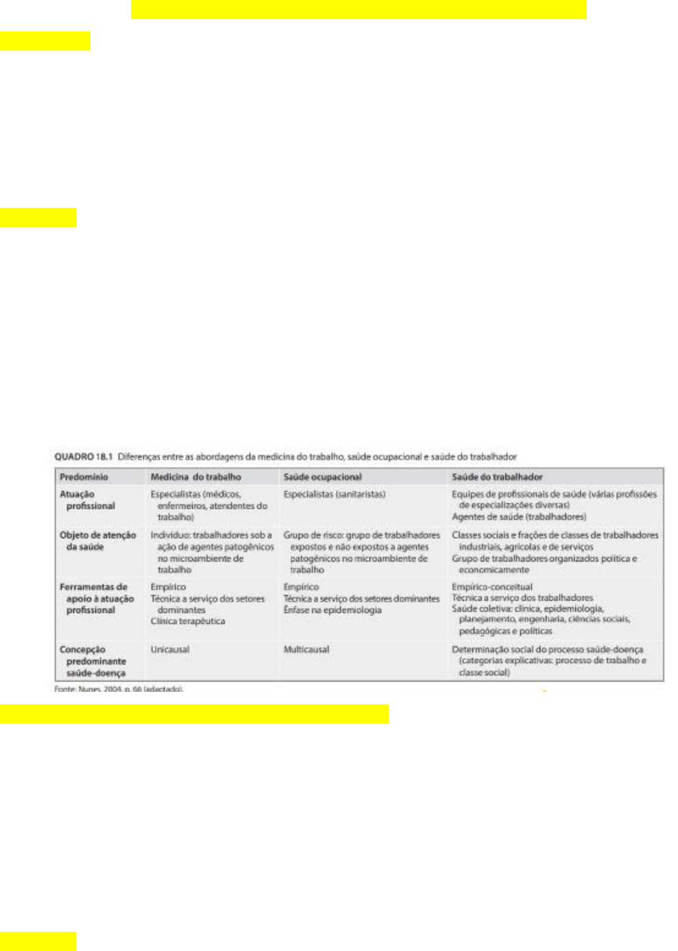 Política Nacional de Saúde do Trabalhador e Trabalhadora Introdução: Para entender melhor sobre a necessidade de políticas para a saúde do trabalhador, é importante compreender o contexto do trabalho na sociedade moderna. Atualmente, a situação de trabalho de muitos é precária, com trabalhos repetitivos, padronizados e pouco criativos, com a utilização de tecnologias cada vez mais complexas, exigindo constante atualização do trabalhador, além de demandar muito tempo. Tudo isso gera grande pressão em todos os trabalhadores, especialmente em um país em que o desemprego é um grande problema. Histórico: Medicina do trabalho: foi criada como especialidade médica, de abordagem clínica individual, na Inglaterra, no século XIX. Saúde ocupacional: foi criada na Europa pós-guerra, com foco na intervenção sobre o ambiente, buscando uma espécie de “higiene industrial”, com atuação multiprofissional. Saúde do trabalhador: foi criada na Europa, na década de 1970, buscando um campo interdisciplinar/intersetorial de compreensão do trabalho nos processos de determinação social da saúde. As diferenças entre esses 3 cenários são vistas na tabela abaixo: Principais Desafios para a Saúde do Trabalhador: Atualmente, os maiores desafios para a saúde dos trabalhadores envolve problemas de saúde ligados as novas tecnologias que surgem, assim como por conta de novas substâncias químicas e físicas (como certos produtos que podem ser problemáticos ou máquinas perigosas), também riscos à saúde por conta de biotecnologias. Pode-se dizer também, que o envelhecimento da população trabalhadora é outro grande desafio, além de grupos vulneráveis, como deficientes, migrantes e desempregados. Por fim, com o aumento populacional, a questão da mobilidade desses trabalhadores torna-se um grande desafio. A PNSTT: Foi criada com o objetivo de assegurar saúde para todos os trabalhadores brasileiros, como dito por seus principais artigos: “Art. 2º A Política Nacional de Saúde do Trabalhador e da Trabalhadora tem como finalidade definir os princípios, as diretrizes e as estratégias a serem observados pelas três esferas de gestão do Sistema Único de Saúde (SUS), para o desenvolvimento da atenção integral à saúde do trabalhador, com ênfase na vigilância, visando a promoção e a proteção da saúde dos trabalhadores e a redução da morbimortalidade decorrente dos modelos de desenvolvimento e dos processos produtivos”. “Art. 3º Todos os trabalhadores, homens e mulheres, independentemente de sua localização, urbana ou rural, de sua forma de inserção no mercado de trabalho, formal ou informal, de seu vínculo empregatício, público ou privado, assalariado, autônomo, avulso, temporário, cooperativados, aprendiz, estagiário, doméstico, aposentado ou desempregados são sujeitos desta Política”. Principais Objetivos das PNSTT: Fortalecer a Vigilância em Saúde do Trabalhador (VISAT) e a integração com os demais componentes da Vigilância em Saúde (incluindo análise de situação de saúde dos trabalhadores e a formação de intervenções). Garantir a integralidade, ou seja, inserir as ações de saúde do trabalhador em todas as instâncias da Rede de Atenção à Saúde do SUS. Incorporar a categoria “trabalho” como determinante do processo saúde-doença dos indivíduos e da coletividade, incluindo-a nas análises de situação de saúde e nas ações de promoção em saúde. Principais Estratégias da PNSTT: Articular e sistematizar as informações das demais bases de dados de interesse à saúde do trabalhador, em especial: Cadastro Nacional de Informações Sociais (CNIS), Sistema Único de Benefícios (SUB), Relação Anual de Informações Sociais (RAIS), Cadastro Geral de Empregados e Desempregados (CAGED), Sistema Federal de Inspeção do Trabalho (SFIT), Troca de Informação em Saúde Suplementar (TISS) e Instituto Brasileiro de Geografia e Estatística (IBGE), etc. Estabelecer a notificação compulsória e investigação obrigatória em todo território nacional dos acidentes de trabalho graves e com óbito e das intoxicações por agrotóxicos, considerando critérios de magnitude e gravidade. Estruturar a Rede Nacional de Atenção Integral à Saúde do Trabalhador (RENAST) no contexto da Rede de Atenção à Saúde, através de mapeamento das atividades produtivas no país, identificação de possíveis doenças ou agravos relacionados ao trabalho etc. Fortalecer e ampliar a intersetorialidade, através de fiscalização conjunta onde houver condições insalubres, perigosas e degradantes de trabalho. RENAST: O RENAST propõe, junto a atenção básica primária em saúde: • Reconhecimento e mapeamento das atividades produtivas no território; • Reconhecimento e identificação da população trabalhadora e seu perfil sócio-ocupacional no território; • Reconhecimento e identificação dos potenciais riscos e impactos (perfil de morbimortalidade) à saúde dos trabalhadores, das comunidades e ao meio ambiente, advindos das atividades produtivas no território; • Identificação da rede de apoio social aos trabalhadores no território; • Suspeita e ou identificação da relação entre o trabalho e o problema de saúde apresentado pelo usuário, para fins de diagnóstico e notificação dos agravos relacionados ao trabalho; • Articulação com as equipes técnicas e os Centros de Referência em Saúde do Trabalhador (CEREST) sempre que necessário, para a prestação de retaguarda técnica especializada, considerando seu papel no apoio matricial a toda rede SUS; • Incorporação de conteúdos de saúde do trabalhador nas estratégias de capacitação e de educação permanente para as equipes da atenção primária em saúde.