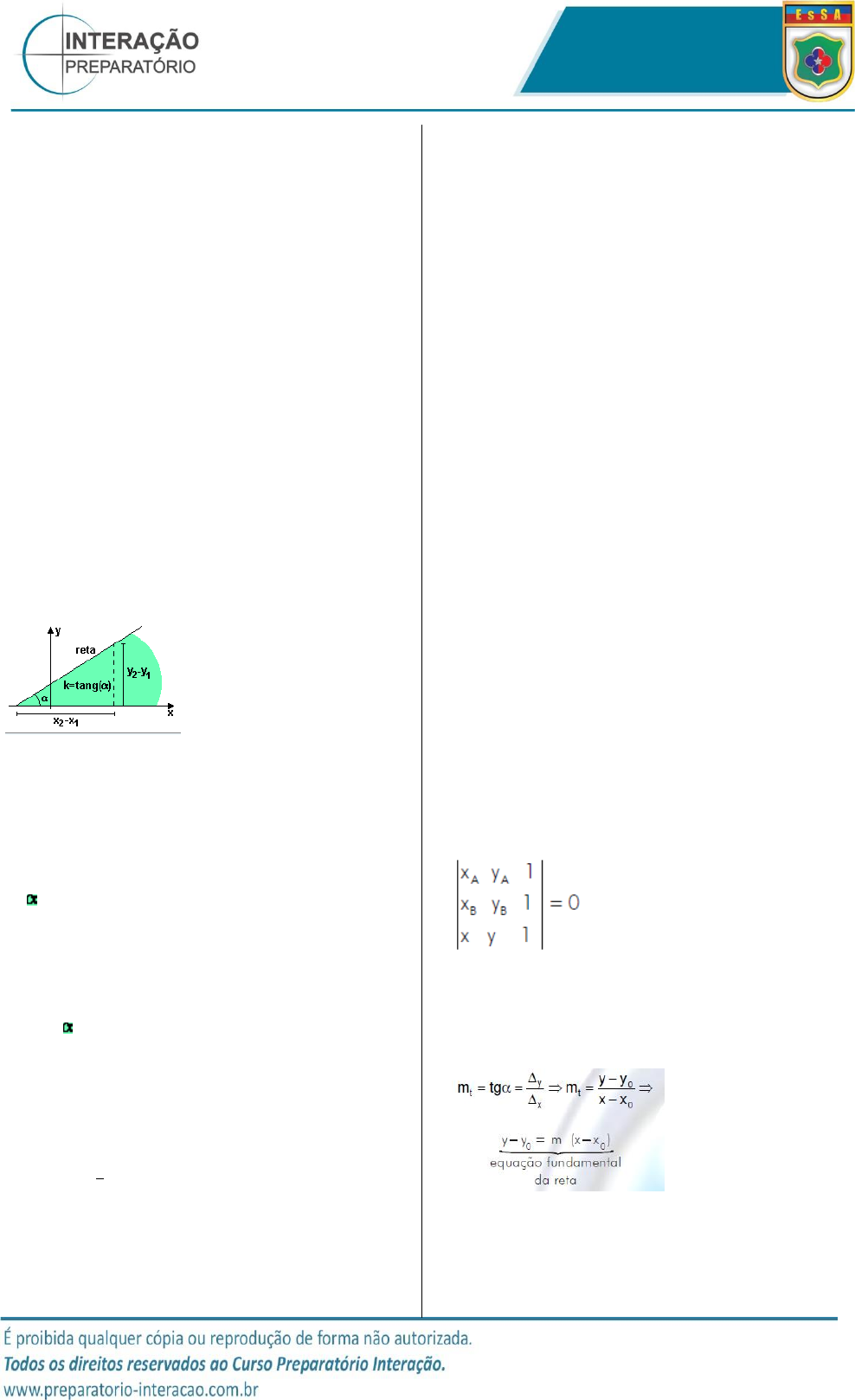 EQUIPE OS CONTÍNUOS MATEMÁTICA AULA 56 ESTUDO ANALÍTICO DA RETA Na Geometria Euclidiana, dados dois pontos P1=(x1,y1) e P2=(x2,y2) no plano cartesiano, existe uma única reta que passa por esses pontos. Para a determinação da equação de uma reta existe a necessidade de duas informações e dois conceitos importantes são: o coeficiente angular da reta e o coeficiente linear da reta. Define-se como coeficiente angular da reta o valor obtido calculando a tangente do ângulo de inclinação. . Determinação do coeficiente angular 1º caso : Com 2 pontos distintos Tg = y2 – y1 / x2 – x1 2º caso: com ângulo de inclinação M1 = tg 3º caso: equação da reta Dada a reta (t) de equação ax +bx+c = 0 com b≠0, m1 = - 𝑎 𝑏 IPC: Se o ângulo está no primeiro quadrante ou no terceiro quadrante, o sinal do coeficiente angular é positivo e se o ângulo está no segundo quadrante ou no quarto quadrante, o sinal do coeficiente angular é negativo. Coeficiente linear de uma reta: é a ordenada onde a reta corta o eixo das ordenadas. Equação geral da reta: Toda reta do plano cartesiano pode ser representada por uma equação de forma ax + by + c = 0, com a, b e c reais, a e b não nulos simultaneamente Determinação da equação da reta 1. Por dois pontos distintos Dado A ( xa,ya) e B (xb, yb) 2.Por um ponto e o coeficiente angular EQUIPE OS CONTÍNUOS MATEMÁTICA AULA 56 Retas horizontais e verticais: Se uma reta é vertical ela não possui coeficiente linear e coeficiente angular. Assim, a reta é indicada apenas por x=a, a abscissa do ponto onde a reta cortou o eixo OX. Se uma reta é horizontal, o seu coeficiente angular é nulo e a equação desta reta é dada por y=b, ordenada do ponto onde está reta corta o eixo OY.FORMA DE EQUAÃO DA Equação reduzida da reta Toda reta (t : ax + by + c = 0) não vertical pode ser escrita como abaixo: t:y = - 𝑎 𝑏 - 𝑐 𝑏 , em que - 𝑎 𝑏 representa o coeficiente angular da reta t e - 𝑐 𝑏 representa o coeficiente linear Equação segmentária da reta Toda reta não horizontal e não vertical pode ser escrita como abaixo. 𝑥 𝑝 + 𝑦 𝑞 = 1 , em que p e q são os pontos interceptos. (P representa o ponto de encontro da reta com o eixo x e q representa o ponto de encontro da reta com o eixo y). Posição entre duas retas Considere duas retas r e s não verticais, com coeficientes angulares, respectivamente, iguais a mr e ms . _ As retas r e s são paralelas quando r mr = ms ._ As retas são concorrentes quando mr ≠ ms ._ As retas são perpendiculares quando Mr .ms = −1. Distância de um ponto a uma reta no plano Seja um ponto P=(xo,yo) e uma reta r no plano definida por ax+by+c=0. A distância d=d(P,r) do ponto P à reta r pode ser obtida pela fórmula abaixo: EQUIPE OS CONTÍNUOS MATEMÁTICA AULA 56 Exercícios 1) O coeficiente angular da reta que passa pelos pontos A = (-1,2) e B = (3,6) é: a) -1 b)1/2 c)2/3 d) 3 e) 1 2) A equação da reta que passa pelo ponto (-1,-2) e tem coeficiente angular -1 é: a) x + y -1 = 0 b) x + y +1 = 0 c) x + y -3 = 0 d) x + y +3 = 0 e) x – y + 3 = 0 3) A equação da reta que passa pelos pontos (2,-3) e (8, 1) é: a) 2x – 3y – 13 = 0 b) -2x – 3y + 13 = 0 c) 3x – 2y + 13 = 0 d) 2x – 3y + 13 = 0 e) 2x + 3y – 13 = 0 4) A equação da reta suporte do segmento AB, dados A(7, 11) e B(15, -1), é: a) 2y-3y -24=0 b) 3y-2x+17=0 c) 3y-2x+7=0 d) 2y+3x -43=0 5) A equação da reta que passa pelo ponto A (3,4) , e cujo coeficiente angular é 1/2, é: a) x+2y+11=0 b) x-y+11=0 c) 2x-y+10=0 d) x-2y+11=0 6) A equação da reta com coeficiente angular igual a – 4/5 ,e que passa pelo ponto P(2,-5), é: a) 4x+5y+12=0 b) 4x+5y+14=0 c) 4x+5y+17=0 d) 4x+5y+16=0 7) Na figura,OABC é um quadrado de lado 3.Sabendo que o ponto D tem coordenada (0,6), o coeficiente angular da reta r é: a) -6 b) -4 c) -2 d) -1 EQUIPE OS CONTÍNUOS MATEMÁTICA AULA 56 8) Na figura abaixo, a reta r tem equação x+3y–6=0, e a reta s passa pela origem e tem coeficiente angular 2/ 3. A área do triângulo OAB, em unidade de área, é igual a: a) 1 b) 2 c) 3 d) 4 e) 5 9) As retas 2x - y = 3 e 2x + ay = 5 são perpendiculares. Então: a) a = -1 b) a = 1 c) a = -4 d) a = 4 10) Determinar o ponto B simétrico de A(-4; 3) em relação à reta x + y + 3 = 0. a)(-6,1) b) (-7,2) c) (4,-3) d) (6,-1) e) (2,0) 11) Determinar a reta perpendicular à reta de equação x + 2y - 3 = 0 no seu ponto de abscissa igual a 5. a)2 x - y -11 = 0 b) x + y +1 = 0 c) 2x + y + 11 = 0 d) x +3 y +3 = 0 e) x – y + 3 = 0 12) Determinar a equação da mediatriz do segmento de extremos A(-3; 1) e B(5; 7). a)2 x - y -11 = 0 b)4 x + 3y -16 = 0 c) 4x +3 y + 11 = 0 d) 4x +3 y +3 = 0 e) x – y + 3 = 0 13) As retas (r) 2x + 7y = 3 e (s) 3x - 2y = -8 se cortam num ponto P. Achar a equação da reta perpendicular a r pelo ponto P. a) 7x - 2y+16=0 b) x-y+11= 0 c) 7x-y+10=0 d) x-2y+11=0 EQUIPE OS CONTÍNUOS MATEMÁTICA AULA 56 14) As retas (r)3x + 2y - 1 = 0 e (s)-4x + 6y - 10 = 0 são: a) paralelas b) coincidentes c) perpendiculares d) concorrentes e não perpendiculares 15) A equação da reta passando pela origem e paralela à reta determinada pelos pontos A(2; 3) e B(1; -4) é: a) y = x b) y = 3x - 4 c) x = 7y d) y = 7x 16) Seja o triângulo de vértices A(1,1) , B(2,3) e C(5,2).A mediatriz do lado AB encontra o eixo das abscissas no ponto de coordenada: a)(0,11/2) b) (-5/2,0) c) (1/2,0) d) (-11/2,0) e) (11/2,0) 17) Qual é a distância entre as retas 3x + 4y - 12 = 0 e 3x + 4y + 8 = 0 ? a)4 b)5 c)2 d)3 e) 6 18) A medida da altura do triângulo ABC relativa ao lado BC sendo A ( 3, 5 ), B ( 0, -1 ) e C (4,2) é: a)3 b)4 c)5 d)6 19) Os vértices de um triângulo são A(2,5), B(0,0) e C (4,-2). A altura desse triângulo, relativa a BC, é: a)10√5 b)√5/5 c)12√5/5 d)√5 20) Seja r a reta que passa pelo ponto ( 3, 2 ) e é paralela a reta x - y + 2 = 0 . Então, a distância do ponto ( -3, 0 ) à reta r é: a)√2 b)4√2 c)√2/2 d) 2√