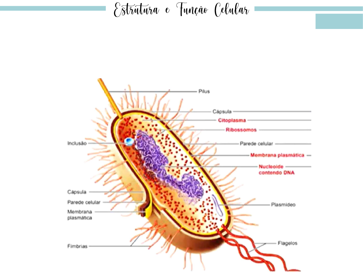 As células procariontes não possuem organelas envolvidas por membrana. Todas as bactérias possuem citoplasma, ribossomo, membrana plasmática e nucleoide (DNA). A maioria das bactérias possuem parede celular, assim como cápsula, fímbrias, flagelos, pilus, plasmídeo (são facultativos). Existem muitos tamanhos e formas diferentes para as bactérias. A maioria varia de 02 a 2 micromêtros de diâmetro e de 2 a 8 micrômetros de comprimento. Giovanna Lopes E. coli de tamanho normal (2 micrômetros de comprimeto) e outra (acima) no processo de elongação para se dividir. COCOS: são redondas. Staphylococcus aureus / Streptococcus pyogenes BACILOS: estão em forma de bastonetes, são compridos e finos. ESPIRILO: tem a forma de um “til” (~), é uma forma curva. Em razão deste formato, facilita sua passagem por entre os tecidos. ESPIROQUETA: é como se fosse uma molinha retorcida. PLEOMÓRFICAS: bactérias que não apresentam forma definida. FILAMENTOSAS: bactérias em formato de filamento característicos dos fungos filamentos. Quando os cocos se dividem para se reproduzir, as células podem permanecer ligadas umas nas outras: DIPLOCOCOS: Cocos que permancem aos pares (quando as células se dividem formam diplococos de dois a dois) – Streptococcus pneumoniae STREPTOCOCCUS: Se dividem mas permanecem ligados em forma de cadeia (“cordão de pérolas”) STAPHYLOCOCCUS: Se dividem e formam agrupamentos maiores, tipo “cacho de uvas”. Essa divisão é útil para identificar certas bactérias e suas características causadoras de doenças. Quanto aos bacilos também podem se apresentar como bastonetes simples, mas também como: DIPLOBACILO: bacilos agrupados de 2 a 2. ESTREPTOBACILOS: bacilos que formam umm cordão, agrupados em fileiras. COCOBACILO: grupo de bactérias que não são redondos e nem compridos, são meio ovalados. Os VIBRIOS são bactérias que se assemelham aos bastonetes curvos – Vibrio cholerae É uma estrutura fina, situada no interior da parede celular, revestido o citoplasma das células. É composta principalmente de fosfolipídeos e proteínas. Por não possuir carboidratos, a membrana plasmática dos procariotos são menos rígidas do que a dos eucariotos. Também há glicoproteínas e glicolipídeos na superfície externa, ajudando a proteger e lubrificar as células na interação célula-célula. As proteínas presentes na superfície externa forma uma barreira semipermeável (barreira seletiva), impedido a entrada de certas substâncias e íons e facilitando outras. A permeabilidade das membranas dependem de vários fatores, como o tamanho das moléculas (proteínas não passam por serem grandes, mas a água, açúcar e CO2 penetram). A membrana plasmática também é importante na absorção de nutrientes e na geração de energia, como nas mitocôndrias dos eucariotos, pois possuem enzimas capazes de catalisar reações químicas que degradam nutrientes e produzem ATP. Em algumas bactérias, os pigmentos e as enzimas envolvidas na fotossíntese são encontradas em invaginações na membrana plasmática que se estende ao citoplasma = CROMÓFAROS (ou tilacoides). É uma estrutura complexa e semi-rígida, responsável pela forma da célula. Ela circunda a membrana plasmática que é frágil, protegendo-a do exterior. Quase todos os procariotos possuem parede celular. A sua principal função é previnir a ruptura das células bacterianas quando a pressão da água dentro da célula é maior do que fora (pressão osmótica). Também serve como ponto de ancoragem de flagelos. A sua composição é uma rede macromolecular formada por peptidídeoglicano (dissacarídeo repetido ligado por polipeptídeos). Nas GRAM-POSITIVAS o peptideoglicano é mais espesso, sucedido da membrana plasmática. Esse tipo de bactéria é mais simples. Aqui, a parede celular constitui várias camadas de peptideoglicano formando uma parede espessa e rígida. Contém ácidos teicoicos ligados exclusivamente ao peptideoglicano (álcool + fosfato). O ácido lipoteicoico atravessa a membrana e se liga a ela. Nas GRAM-NEGATIVAS a estrutura é mais complexa. Tem-se a membrana plasmática (membrana interna) e a membrana externa (lipopolissacarídica + proteína – principal fator de virulência). Entre as duas membranas encontra-se o periplasma (fluído semelhante a gel) juntamente com uma pequena e fina camada de peptideoglicano. Aqui, a parede celular contém apenas uma camada fina de peptideoglicano. O peptideoglicano está ligado às lipoproteínas da membrana externa. O periplasma contém uma alta concentração de enzimas de degradação e proteínas de transporte. Não contém ácidos teicoicos. São mais suscetíveis ao rompimento. A membrana externa evita a fagocitose por macrófagos, fornece uma barreira para certos antibióticos (como a penicilina) e à lizoenzima (age no peptídeoglicano). Quando esse tipo de bactéria morre, ela libera os lipídeos presentes na membrana externa que funcionarão como uma endotoxina, responsável por sintomas como febre e vasodilatação. Cerca de 80% é composto de água e peso molecular muito baixo, composto por proteínas, enzimas, carboidratos, lipídeos e íons orgânicos. É espesso, aquoso, semitransparente e elásstico. Suas principais estruturas são: uma área contendo DNA, ribossomos (inclusões). Não possui citoesqueleto. O cromossomo (e o genoma) se concentra na região do nucleoide (contém uma única molécula longa e contínua de DNA de fita dupla, arranjada de forma circular). Os cromossomos bacterianos não são circundados por um envelope nuclear. Também não há a presença de histonas e o DNA está fixado na membrana plasmática. Todas as células possuem ribossomos. Funcionam como locais de síntese de proteínas a partir do RNAm. São compostos por 2 subunidades constituídos por RNAr + proteínas. Os ribossomos dos procariotos são os ribossomos 70s (subunidades 50s com 31 proteínas + 30s com 21 proteínas). Exist
