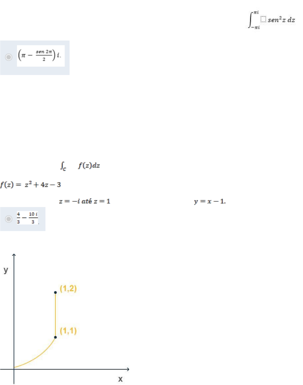 1 - A ideia básica da integração é que muitas quantidades podem ser calculadas se forem quebradas em pedaços pequenos e, depois, soma-se a contribuição que cada parte dá, nos permitindo calcular desde quantidades pequenas até valores volumétricos. Fonte: THOMAS, George B. Cálculo, vol 1. 11 ed. São Paulo: Pearson Education do Brasil, 2012. Considerando essas informações e o conteúdo estudado, determine a integral de . 2 - “Em vez de pensar em uma curva como um gráfico de uma função ou equação, consideramos uma forma mais geral de pensar em uma curva como a trajetória de uma partícula em movimento, cuja posição está mudando ao longo do tempo. Então, cada uma das coordenadas de x e y da posição da partícula se torna uma função de uma terceira variável t. Podemos ainda alterar a forma na qual os pontos no plano são descritos utilizando coordenadas polares em vez das retangulares ou cartesianas. Essas duas novas ferramentas são úteis para a descrição de movimentos, como os dos planetas e satélites, ou projéteis se deslocando no plano ou espaço.” Fonte: THOMAS, George B. Cálculo,vol 2. 12 ed. São Paulo: Pearson Education do Brasil, 2012. p. 77 Considerando a praticidade da resolução de situações-problema, por meio da parametrização de uma curva, determine a integral , sendo e C um caminho de , sendo um segmento sobre 3 - Podemos calcular a integral de uma função por meio de somas parciais, assim como em algumas figuras ou curvas, considerando-as compostas e realizar os cálculos parcialmente. Considere a seguinte figura: Fonte: Elaborado pela autora, 2021. Considerando essas informações e conteúdo estudado, determine a integral , sendo C composto por um arco de uma parábola de (0,0) e (1,1), e pelo segmento de uma reta vertical de (1,1) e (1,2). 4 - Ao trabalharmos com as funções, temos que considerar a importância de não somente determinarmos a sua lei de formação, mas também o seu domínio e condição de existência. Com as funções analíticas não poderia ser diferente. Então, podemos afirmar que a função é válida para todos os pontos de , sendo: 5 - “Inicialmente, estudamos as curvas como gráficos de funções ou equações, envolvendo as duas variáveis x e y. Com a parametrização, introduzimos outra forma de descrever uma curva expressando ambas as coordenadas como funções de uma terceira variável t.” Fonte: THOMAS, George B. Cálculo, vol 2. 12 ed. São Paulo: Pearson Education do Brasil, 2012. p. 77. Adaptado) A resolução de situações-problema envolvendo cálculo avançado, utilizando a representação paramétrica de uma curva, pode ser muito útil. Por meio da parametrização, calcule a integral , sendo e C um caminho de , sendo um segmento sobre 6 - Os elementos e conceitos do cálculo avançado são muito empregados em situações reais, seu estudo é evidente nas engenharias, na solução tanto de problemas de dimensões microscópicas quanto macroscópicas. Dito isso, considere a situação a seguir: Uma peça móvel de um maquinário percorre um caminho de formato elíptico dado por no sentido anti-horário, sobre uma força Considerando essas informações e conteúdo estudado, responda: qual é o trabalho realizado? 7 - Os números complexos surgiram a partir da necessidade de resultados em casos em que não havia solução no campo dos números reais, e sua aplicação se estendeu às funções de variáveis complexas. O estudo de uma função de variável complexa nos permite determinar a parte real e a parte imaginária de uma função. Denominando a parte real por u e a parte imaginária v, determine da função 8 - Uma função é uma operação que transformará pontos de um plano complexo em outros pontos. As funções de variáveis complexas, assim como os números complexos, também podem ser compostas por uma parte real e uma parte imaginária. Considerando essas informações e conteúdo estudado, determine uma função f, em que a parte real seja dada por: 9 - Analise a figura a seguir: Fonte: Elaborado pelo autor, 2020. Considerando essas informações e conteúdo estudado, calcule em que C é a metade superior do círculo unitário e assinale a alternativa que apresenta o resultado correto. 10 - Quando temos uma dada função f, e essa função é analítica, o valor de sua integral dependerá somente do ponto inicial e final do caminho de integração e poderá ser determinado por meio da diferença entre F(b) e F(a), sendo F primitiva de f. Considerando essas informações e conteúdo estudado, determine a integral de