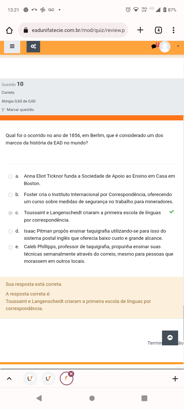 Qual foi o ocorrido no ano de 1856, em Berlim, que é considerado um dos marcos da história da EAD no mundo? a. Anna Eliot funda a Sociedade de Apoio ao Ensino em Casa em Boston. b. Foster cria Instituto Internacional por Correspondência, oferecendo um curso sobre medidas de segurança no trabalho para mineradores. C. Toussaint e Langenscheidt criaram a primeira escola de línguas por correspondência. d. Isaac Pitman propôs ensinar taquigrafia utilizando-se para isso do sistema postal inglês que oferecia baixo custo e grande alcance. e. Caleb Phillipps, professor de taquigrafia, propunha ensinar suas técnicas semanalmente através do correio, mesmo para pessoas que morassem em outros locais.