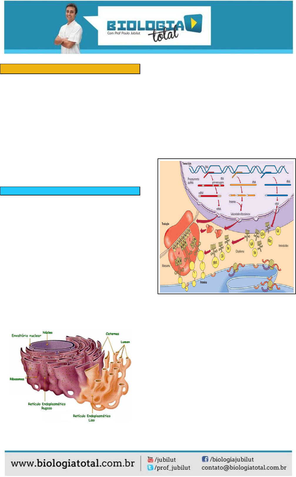 CITOPLASMA O citoplasma corresponde a todo material compreendido entre a membrana plasmática e a carioteca. O citoplasma é formado por um material gelatinoso (hialoplasma) onde se encontram mergulhadas as organelas. Hialoplasma ou Citoplasma Fundamental ou Matriz Citoplasmática O hialoplasma é um material viscoso, amorfo, constituído principalmente de água e de proteínas, formando um coloide. Com suas propriedades de elasticidade, contratibilidade, coesão, rigidez e mobilidade interna - contribui de maneira decisiva para a adaptação da célula às diferentes condições ambientais. ORGANELAS CITOPLASMÁTICAS São estruturas responsáveis pelas reações de metabolismo celular, embora algumas dessas reações ocorram também no hialoplasma. Todas as organelas membranosas da célula são formadas por membrana lipoprotéica, com estrutura semelhante à da membrana plasmática. a) Retículo Endoplasmático: é uma complexa rede de canais e vesículas membranosas, formando um verdadeiro labirinto. O RE é responsável pela circulação das substâncias dentro da célula. Em algumas regiões do retículo, observam-se ribossomos aderidos à membrana externa. Essas regiões são conhecidas como retículo endoplasmático rugoso ou granular e são responsáveis pela produção de proteínas. As regiões que não apresentam ribossomos são denominadas retículo endoplasmático liso ou agranular e são responsáveis pela produção de lipídios. Estruturas dos R.E. Liso e Rugoso b) Ribossomos: são estruturas compostas por RNA e proteínas, distribuídas em duas subunidades sobrepostas. Os ribossomos podem se apresentar livres no citoplasma, isolados ou então presos uns aos outros por uma fita de RNA. Nesse caso, são chamados polissomos ou polirribossomos. É nos ribossomos que ocorre a síntese proteica. O Ribossomo é uma organela não membranosa. A síntese de proteínas dentro da célula ocorre devido à interação do núcleo com o citoplasma. No núcleo, a partir do DNA sintetizado o RNAm (mensageiro) de uma das suas cadeias, transcrevendo o código de uma proteína específica. Tradução: a síntese de proteínas Depois de produzido, o RNAm desloca-se para o citoplasma e liga-se aos ribossomos que passam agora a “ler” a sequência de bases nitrogenadas do RNAm. A leitura do código é feita por “trincas” de bases nitrogenadas; cada “trinca” do RNA corresponde a um códon que irá determinar a colocação de um aminoácido específico na cadeia proteica. Isso caracteriza a tradução do código genético. c) Complexo Golgiense ou de Golgi: é um conjunto de bolsas e vesículas achatadas e empilhadas, que desempenham várias funções na célula: Armazenamento de substâncias: muitas das proteínas e demais substâncias sintetizadas na célula, migram até o complexo de Golgi e são armazenados no interior de suas vesículas. Organização do acrossomo nos espermatozoides: o acrossomo contém enzimas que têm a função de promover a perfuração do invólucro do óvulo por ocasião da fecundação. Situa-se na cabeça do espermatozoide. Síntese de moléculas complexas: os monossacarídeos obtidos dos alimentos são transformados em polissacarídeos e esses se combinam com determinadas proteínas dando origem a glicoproteínas. Complexo de Golgi d) Lisossomos: o termo lisossomo significa “corpo que quebra”(lise = quebra, soma = corpo). Formados pelo Complexo Golgiensi, são pequenas vesículas que contêm enzimas digestivas de todos os tipos, cuja função é digerir material que a célula engloba (digestão intracelular) e, ocasionalmente, elementos da própria célula (autofagia). Lisossomos participando da digestão intracelular Em condições normais a membrana do lisossomo, apesar de lipoprotéica, não permite que as enzimas entrem em contato com o citoplasma celular (esse mecanismo de controle ainda não está bem explicado). Sabe-se, no entanto, que certos fatores podem “desestabilizar” a membrana lisossômica. Por exemplo, sabe-se que, assim que a célula morre, os lisossomos se rompem aos poucos libertando suas enzimas que irão digerir todo o material celular, iniciando a decomposição cadavérica num processo denominado autólise. Este processo pode ser benéfico ou prejudicial. Esse fenômeno é verificado também em algumas doenças como, por exemplo, a silicose pulmonar, também chamada de “doença dos mineiros”. Ela ocorre quando o mineiro inspira grandes quantidades de pó de sílica, que acabam se acumulando nos alvéolos pulmonares. Como uma reação de defesa, células do sistema imune fagocitam estas partículas mas não as digerem, provocando a morte das células alveolares. De forma benéfica, podemos verificar ocorrência de autólise na regressão da cauda no girino durante sua metamorfose e na regressão do útero durante o período pós-parto, reaproveitando os nutrientes resultantes da digestão autofágica. Regressão da cauda do girino, exemplo de autólise e) Vacúolos: correspondem genericamente a qualquer espaço no citoplasma delimitado por um pedaço de membrana lipoprotéica. As variedades mais comuns de vacúolo são: Vacúolos Digestivos: o vacúolo digestivo, nada mais é do que um fagossomo ao qual se funde um lisossomo; o vacúolo autofágico, uma variação de vacúolo digestivo; e finalmente o corpo residual, que muitas vezes executa a clasmocitose. A formação destes vacúolos pode ser observada na imagem ao lado. Vacúolos Contráteis (ou Pulsáveis): em protozoários de água doce ocorrem vacúolos que se comunicam com o exterior por meio de um poro, expulsam o excesso de água da célula, exercendo um controle osmótico no organismo. Protozoário de água doce com vacúolos contráteis Vacúolos Vegetais: em qualquer célula vegetal ou animal, regiões do retículo endoplasmático, quando armazenam substâncias, formam vacúolos pelo afastamento de suas membranas. Nas células vegetais esses vacúolos são pa
