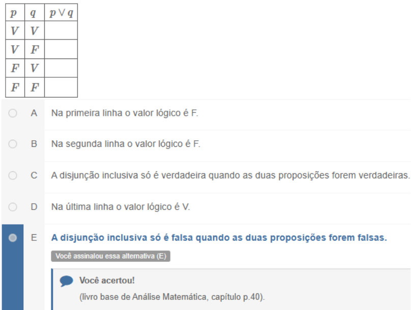 Questão 1/10 - Lógica Matemática - Considere o trecho de texto a seguir: "[...] Simbolicamente, a disjunção de duas proposições p e q indica-se com a notação: p∨q , que se lê: p ou q ." Após esta avaliação, caso queira ler o texto integralmente, ele está disponível em: ALENCAR FILHO, Edgard de, Iniciação à lógica matemática. São Paulo: Nobel:2002 , p.20. De acordo com os conteúdos do livro-base Introdução à Lógica Matemática para Acadêmicos, analise as assertivas e assinale a correta a partir da tabela. Questão 5/10 - Lógica Matemática Considere o trecho de texto dado: “Na linguagem comum, usam-se palavras explícitas ou não para interligar frases dotadas de algum sentido. Tais palavras são substituídas, na Lógica Matemática, por símbolos denominados conectivos lógicos''. Após esta avaliação, caso queira ler o texto integralmente, ele está disponível em: BISPO, Carlos Alberto Ferreira. CASTANHEIRA, Luiz Batista. SOUZA FILHO, Oswaldo Melo. Introdução à logica matemática. São Paulo. Cengage Learning, 2011. p. 05 De acordo com o texto citado e os conteúdos do livro-base Introdução à lógica matemática para acadêmicos, analise as seguintes proposições: I. p: Um número é divisível por 3. II. q: Um número é divisível por 4. III. r: Um número é divisível por 12. A partir disso, assinale a alternativa quer expressa corretamente a frase: “Se um número é divisível por 12, então ele é divisível por 3 e é divisível por 4.” Questão 1/10 - Lógica Matemática - Considere o trecho de texto a seguir: "Uma primeira providência, ao iniciarmos um estudo de Lógica, é aprender a distinguir um mero agrupamento de frases de um argumento de fato, ou seja, a distinguir argumentos de não-argumentos". Após esta avaliação, caso queira ler o texto integralmente, ele está disponível em: MACHADO, N.J.; CUNHA, M.O. Lógica e linguagem cotidiana: Verdade, coerência, comunicação, argumentação. 2. ed. Belo Horizonte: Autêntica, 2008. p. 17. De acordo com os conteúdos do livro-base Introdução à lógica matemática para acadêmicos sobre os conectivos lógicos das proposições, analise as assertivas a seguir e assinale a correta. Questão 1/10 - Lógica Matemática - Considere o trecho de texto a seguir: "Uma primeira providência, ao iniciarmos um estudo de Lógica, é aprender a distinguir um mero agrupamento de frases de um argumento de fato, ou seja, a distinguir argumentos de não-argumentos". Após esta avaliação, caso queira ler o texto integralmente, ele está disponível em: MACHADO, N.J.; CUNHA, M.O. Lógica e linguagem cotidiana: Verdade, coerência, comunicação, argumentação. 2. ed. Belo Horizonte: Autêntica, 2008. p. 17. De acordo com os conteúdos do livro-base Introdução à lógica matemática para acadêmicos sobre os conectivos lógicos das proposições, analise as assertivas a seguir e assinale a correta. A Uma condicional do tipo “se...então” é representada logicamente por "⟷". B O símbolo de implicação é representado logicamente por "~". C A bicondicional “se e somente se” é representada logicamente por "←". D A expressão “para todo” é representada logicamente pelo conectivo "∃". E O conectivo "^" é equivalente à expressão "e" , tendo como nome lógico "conjunção". O conectivo “^” é equivalente à expressão “e”, tendo como nome lógico “conjunção” (livro-base, p. 34). Questão 5/10 - Lógica Matemática - Considere o trecho de texto a seguir: "Definição - Chama-se sentença aberta com uma variável em um conjunto A ou apenas sentença aberta em A , uma expressão p(x) tal que p(a) é falsa (F) ou verdadeira (V) para todo a∈A . Em outro termos, p(x) é uma sentença aberta em A se e somente se p(x) torna-se uma proposição (falsa ou verdadeira) todas as vezes que se substitui a variável x por qualquer elemento a do conjunto A(a∈A) . O conjunto A recebe o nome de conjunto-universo ou apenas universo (ou ainda domínio) da variável x e qualquer elemento a∈A diz-se um valor da variável x ". Após esta avaliação, caso queira ler o texto integralmente, ele está disponível em: ALENCAR FILHO, Edgard de, Iniciação à lógica matemática. São Paulo: Nobel:2002 , p.156. De acordo com os conteúdos do livro-base Introdução à Lógica Matemática para acadêmicos, analise as afirmativas a seguir e assinale a correta com relação às proposições P eQ a seguir: Questão 6/10 - Lógica Matemática Considere o seguinte trecho de texto: “Negação: Este conectivo não liga duas proposições, mas simplesmente nega a afirmação da proposição que o precede. Em virtude disso, é um conectivo unário, enquanto os anteriores são conectivos binários, pois ligam duas proposições. Se o valor-verdade de uma proposição é (V), quando acompanhado do conectivo de negação, passará a ser (F) e vice-versa.” Após esta avaliação, caso queira ler o texto integralmente, ele está disponível em: BISPO, Carlos Alberto Ferreira. CASTANHEIRA, Luiz Batista. SOUZA FILHO, Oswaldo Melo. Introdução à logica matemática. São Paulo. Cengage Learning, 2011. p. 11. Através destas informações e os conteúdos do livro-base Introdução à lógica matemática para acadêmicos, assinale a alternativa que expressa corretamente a negação da frase “Todo atleta da equipe tem mais de 35 anos”: A Algum atleta da equipe pode ter 40 anos. B Um atleta da equipe pode ter mais de 36 anos. C lgum atleta pode ter menos de 40 anos. D Nenhum atleta tem menos de 40 anos. E Nenhum atleta da equipe tem mais de 35 anos. Uma das formas de negar a expressão "todo" é a expressão "nenhum. Para negar a expressão "Todo atleta da equipe tem mais de 35 anos" seria necessário afirmar que existe pelo menos um atleta que tem menos de 35 anos ou simplesmente dizer que nenhum atleta tem mais de 35 anos (livro-base, p. 74 - 75). Questão 7/10 - Lógica Matemática Leia at