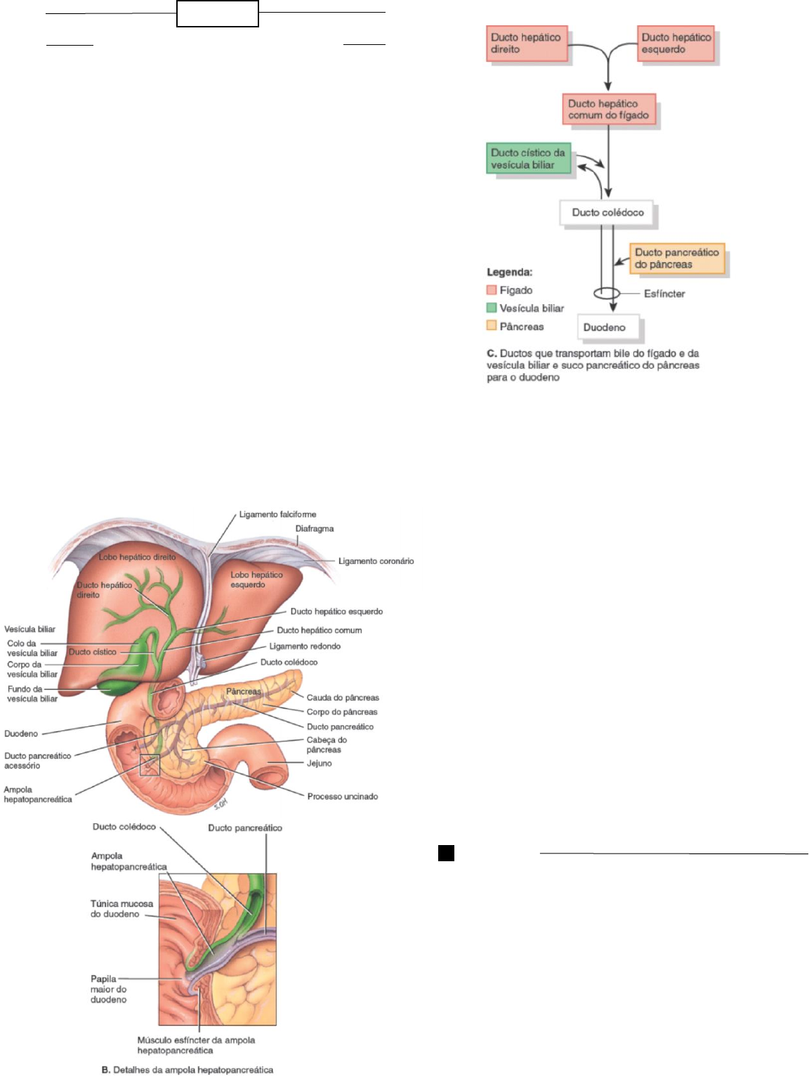 IANI SOARES LUZ - 2022.2 – 4° Período APG 13 ANATOMIA DO PÂNCREAS - Órgão acessório que contribui com a digestão química no intestino delgado - Glândula retroperitoneal que mede aproximadamente 12 ~15cm de comprimento, 2,5cm de espessura - Posterior a curvatura maior do estômago - Está ligado ao duodeno por dois ductos: ducto pancreático (ducto de Wirsung) e ducto pancreático acessório - O ducto pancreático forma uma ampola hepatopancreática (ampola de Vater) com o ducto colédoco do fígado, ambos se esvaziam no duodeno - Dividido em duas porções: corpo (parte central) e cauda (afilada) - O ducto pancreático se une ao ducto colédoco que vem do fígado e da vesícula biliar e entra no duodeno como ampola hepatopancreática - Essa ampola se abre na túnica mucosa duodenal conhecida como papila maior do duodeno (10cm abaixo do óstio pilórico do estômago) - A passagem do suco pancreático e do suco biliar por essa ampola é regulada pelo músculo esfíncter da ampola (esfíncter de Oddi) que circunda esse ducto - O ducto pancreático acessório (ducto de Santorini) sai do pâncreas e esvazia-se no duodeno ~2,5cm acima da ampola hepatopancreática Histologia Porção exócrina: - O pâncreas é composto por pequenos aglomerados (99%) de células epiteliais glandulares, os ácinos – constituem a porão exócrina do órgão IANI SOARES LUZ - 2022.2 – 4° Período - As células no interior dos ácinos secretam uma mistura de líquidos e enzimas digestória - > o suco pancreático Porção endócrina: - O 1% restante dos aglomerados, chamadas de ilhotas pancreáticas (ilhotas de Langerhans), foram a porção endócrina do pâncreas - As ilhotas de Langerhans secretam os hormônios glucagon, insulina, somatostatina e polipeptídio pancreático Fisiologia - O pâncreas produz diariamente 1,2 – 1,5 L de suco pancreático Suco pancreático: líquido claro e incolor que consiste principalmente de água, alguns sais, bicarbonato de sódio e várias enzimas – pH ligeiramente alcalino (7,1 – 8,2) - O suco pancreático age na: - Redução da acidez do suco gástrico ácido no quimo - Interrompe a ação da pepsina do estômago - Cria o pH apropriado para a ação das enzimas digestórias no intestino delgado - Enzimas pancreáticas: - Responsáveis pela digestão de carboidrato/amido, triglicerídeos, proteínas e ácidos nucleicos: Amilase pancreática, tripsina, quimotripsina, elastase, carboxipeptidade, lipase pancreática, ribonuclease e desoxirribonuclease - As enzimas que fazem a digestão das proteínas são produzidas em uma forma inativa, assim como no estômago, como são inativas, as enzimas não digerem as células do próprio pâncreas Ex: tripsina é secretada na forma de tripsinogênio – ativado no lúmen do intestino delgado pela enzima que fica na borda em escova a enteroquinase - Existe um mecanismo de defesa para os casos em que tripsinas são formadas acidentalmente no pâncreas, uma proteína executa essa função, a proteína inibidora da tripsina, que se combina a qualquer tripsina formada acidentalmente e bloqueia a sua atividade enzimática CÁLCULOS BILIARES Definição: a litíase biliar, ou cálculo biliar, é uma condição que se caracteriza pela formação de cálculos no interior da vesícula biliar. Classificação - Dois tipos: os cálculos de colesterol e os pigmentares. ➔ Cálculos de colesterol: são de cor castanho-claro, polidos ou facetados, únicos ou múltiplos e, à seção, têm aspecto lamelar ou cristalino. - 70-80% dos cálculos no mundo - Podem ser puros, ou misto, composto por 70% de colesterol monidratado, com quantidades variáveis de sais de cálcio, sais biliares, ácidos graxos, proteínas e fosfolipídios IANI SOARES LUZ - 2022.2 – 4° Período - Cálculos puros: raros, únicos, amarelo claros, redondos a ovoides, radio lucentes, com superfície externa dura e finamente granular - Cálculos mistos: mais comuns, múltiplos, formado por colesterol, bilirrubinato e outros sais de cálcio, são radiopacos, com superfície de corte cristalino ➔ Cálculos pigmentares: contêm menos de 25% de colesterol, são divididos em cálculos preto e castanhos - O principal componente é o bilirrubinato de cálcio - Os cálculos pretos são mais comuns em pacientes com cirrose ou hemólise crônica. São múltiplos, brilhantes, com contornos irregulares, radiopacos, originados na vesícula biliar (e tendem a permanecer nela), contêm sais de cálcio de bilirrubina indireta, carbonato de cálcio, cobre, fosfato de cálcio e glicoproteína mucina - Os cálculos castanhos são associados a infecção. São laminados, macios, de consistência saponácea e oleosa. Constituídos de bilirrubinato de cálcio monomérico e palmitato de cálcio e pequenas quantidades de colesterol e proteínas - Encontrados mias em ductos biliares - Geralmente, os pacientes com cálculos pigmentares são homens mais idosos do que aqueles com cálculos de colesterol - Tanto o cálculo de colesterol quanto os de pigmentos, possuem um núcleo constituído por pigmento biliar envolvido por matriz proteica, geralmente uma glicoproteína Etiologia - Mutações genéticas (anomalia do gene MDR3 hereditariedade - O MDR3 permite a transferência através da membrana do principal fosfolipídio biliar, a fosfatidil-colina - Fatores ambientais (ocidente predominam cálculos de colesterol, no oriente predominam os cálculos de bilirrubinato de cálcio) - Embora seja observado na infância e na adolescência, a litíase biliar é mais comum a partir da quarta década de vida - Dietas hipercalóricas e jejum prolongado - Dietas ricas em fibras diminuem a concentração biliar do colesterol, havendo IANI SOARES LUZ - 2022.2 – 4° Período menor tendência à formação de cálculo de colesterol (o mesmo foi observado em pessoas que consomem maior quantidade de álcool) Fisiopatologia Litíase de colesterol - A formação dos cálculos de colesterol compreende três 