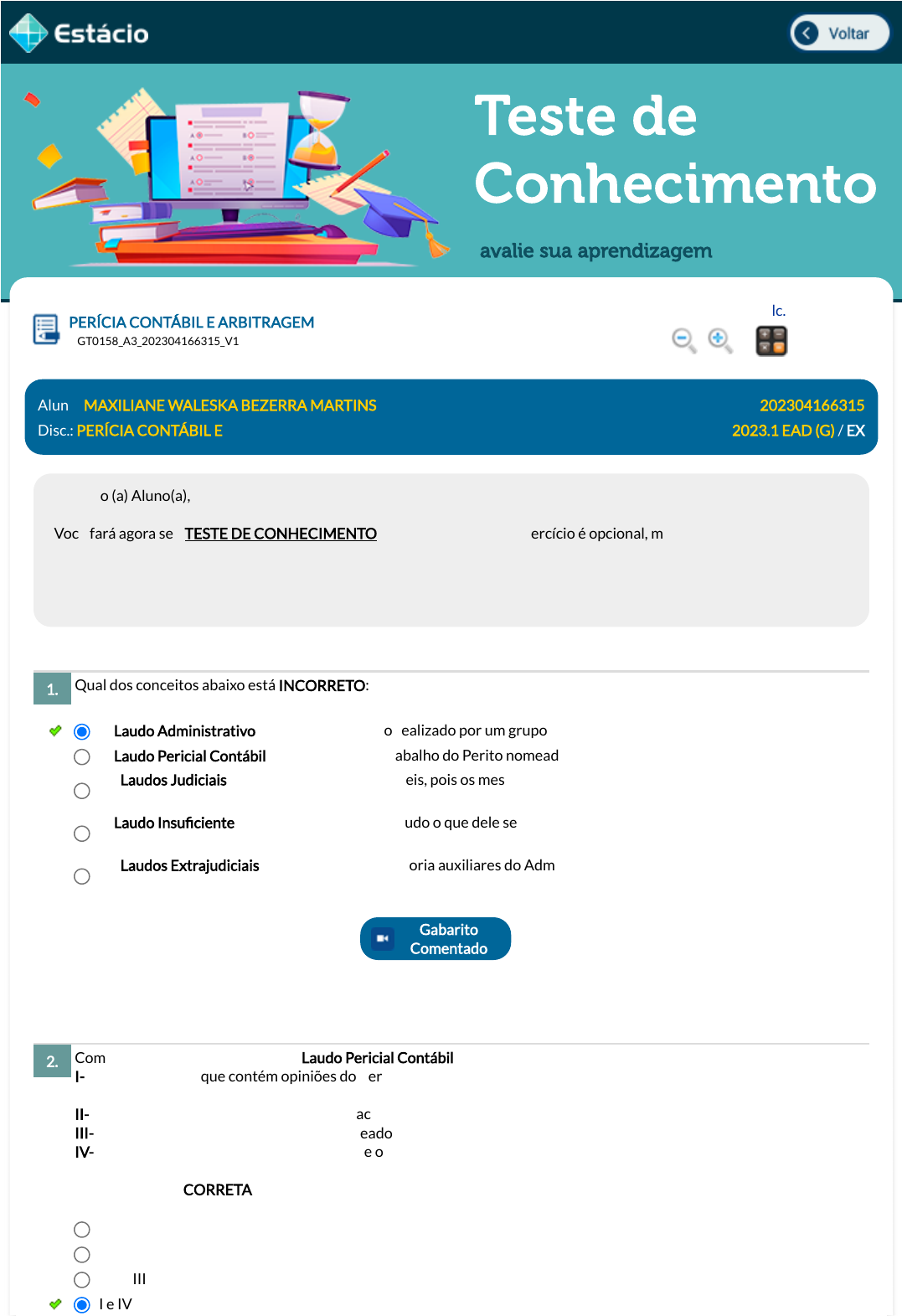 Disc.: PERÍCIA CONTÁBIL E 2023.1 EAD (G) / EX
