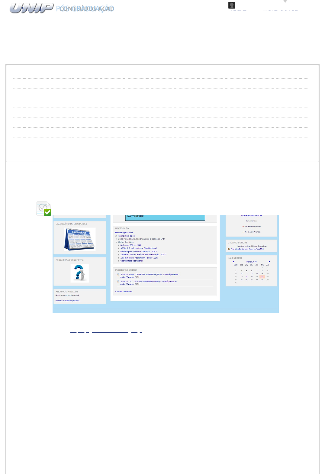 26/04/2023, 13:34 Revisar envio do teste: Questionário - Unidade lV – ... https://ava.ead.unip.br/webapps/assessment/review/review.jsp?attempt_id=_93640714_1&course_id=_56633_1&content_id=_853929_1&return… 1/10 Revisar envio do teste: Questionário - Unidade lV Métodos e Técnicas na Aplicação de Ensino para Adultos 13985-40-ED11389_10_02-202331 Unidade IV Usuário Wiliane Marcos de Carvalho Curso Métodos e Técnicas na Aplicação de Ensino para Adultos Teste Questionário - Unidade lV Iniciado 26/04/23 13:15 Enviado 26/04/23 13:34 Status Completada Resultado da tentativa 0,6 em 0,75 pontos Tempo decorrido 18 minutos Resultados exibidos Todas as respostas, Respostas corretas, Comentários, Perguntas respondidas incorretamente Pergunta 1 Respostas: a. Veja a imagem abaixo: Fonte: http://pigead.lanteuff.org/my/. Acesso em 19 mar 2019. Essa é a imagem de um ambiente tecnológico. Como sabemos, a EaD vem se desenvolvendo de forma bastante acelerada em nosso país. Isso se deve, especialmente, por suas características de romper com as barreiras de espaço e tempo, apresentar um grau de flexibilidade superior à educação presencial e utilizar as TICs em ambientes previamente preparados com interface amigável e graus de interação diversos. Os ambientes tecnológicos para o desenvolvimento do trabalho com EaD são chamados de: ATs: Ambientes Tecnológicos para abrigar professores e alunos, organizados numa disciplina ou curso, onde são postadas tarefas para serem resolvidas on line PÓS EAD COMUNIDADES BIBLIOTECAS Mural do AlunoCONTEÚDOS ACADÊMICOS 0,075 em 0,075 pontos Wiliane Carvalho 3 https://ava.ead.unip.br/webapps/blackboard/execute/courseMain?course_id=_56633_1 https://ava.ead.unip.br/webapps/blackboard/content/listContent.jsp?course_id=_56633_1&content_id=_853915_1&mode=reset http://pigead.lanteuff.org/my/ https://ava.ead.unip.br/webapps/portal/execute/tabs/tabAction?tab_tab_group_id=_66_1 https://ava.ead.unip.br/webapps/portal/execute/tabs/tabAction?tab_tab_group_id=_69_1 https://ava.ead.unip.br/webapps/portal/execute/tabs/tabAction?tab_tab_group_id=_67_1 https://ava.ead.unip.br/webapps/portal/execute/tabs/tabAction?tab_tab_group_id=_68_1 https://ava.ead.unip.br/webapps/portal/execute/tabs/tabAction?tab_tab_group_id=_70_1 https://ava.ead.unip.br/webapps/login/?action=logout 26/04/2023, 13:34 Revisar envio do teste: Questionário - Unidade lV – ... https://ava.ead.unip.br/webapps/assessment/review/review.jsp?attempt_id=_93640714_1&course_id=_56633_1&content_id=_853929_1&return… 2/10 b. c. d. e. Comentário da resposta: AVAs: Ambientes Virtuais de Aprendizagem desenvolvidos para gerenciar os conteúdos dos cursos ou disciplinas junto aos alunos, com acesso on line e síncrono ATs: Ambientes Tecnológicos para funcionar como repositório de conteúdo e distribuição, junto aos alunos, em tempo diferido AVAs: Ambientes Virtuais de Aprendizagem desenvolvidos para gerenciar a aprendizagem dos alunos, dispondo de ferramentas síncronas e assíncronas AVAs: Ambientes Virtuais de Aprendizagem desenvolvidos para gerenciar os conteúdos dos cursos ou disciplinas junto aos alunos, com acesso assíncrono Os ambientes virtuais de aprendizagem – AVAs – como o da imagem, tem o objetivo de gerenciamento de todo o processo de aprendizagem. Neles as atividades são de diversas ordens e podem ser síncronas, ou seja, ocorrer em tempo real, ou assíncronas, ou seja, após dispostas, o aluno as acessa em seu tempo e as realiza. Unidade 4, pp. 77-82 ADAPTADO DE: UECE-CEV - 2018 - DETRAN-CE - ANALISTA DE TRÂNSITO E TRANSPORTE - ASSUNTOS EDUCACIONAIS Pergunta 2 Analise a tirinha: Fonte: http://Wiltrando.com.br. Acesso em: 19 mar 2019 A personagem tem uma monografia para fazer, mas se perde no oceano da virtualidade e, ao invés de fazer seu trabalho, navega por diversos recursos tecnológicos. A EaD, devido a sua variedade de recursos, pode provocar É 0,075 em 0,075 pontos http://wiltrando.com.br/ 26/04/2023, 13:34 Revisar envio do teste: Questionário - Unidade lV – ... https://ava.ead.unip.br/webapps/assessment/review/review.jsp?attempt_id=_93640714_1&course_id=_56633_1&content_id=_853929_1&return… 3/10 Respostas: a. b. c. d. e. Comentário da resposta: essas “viagens” no usuário, no aluno. É importante refletir sobre isso. Tendo isso em mente, quanto à EaD, leia as assertivas a seguir: I) Ser aluno EaD significa atuar nos AVAS e, através de seus recursos e ferramentas, expressar pensamentos, tomar decisões, dialogar, trocar informações e experiências e produzir conhecimento. II) Cada pessoa busca as informações que lhe são mais pertinentes. Internalizá-las, apropriar-se delas e as transformar em uma nova representação, ao mesmo tempo em que se transforma e volta a agir no grupo, transformado e transformando o grupo não é função da EaD. III) Em EaD ensinar é organizar situações de aprendizagem, planejar e propor atividades, identificar as representações do pensamento do aluno, atuar como mediador e orientador, fornecer informações relevantes, incentivar a busca de distintas fontes de informações, realizar experimentações, provocar a reflexão sobre processos, favorecer a formalização de conceitos, propiciar aprendizagem significativa do aluno. Está correto o indicado em: ) Apenas I, II Apenas I Apenas II Apenas III Apenas I, III Cada pessoa busca as informações que lhe são mais pertinentes nas AVAs. Internalizá-las, apropriar-se delas e as transformar em uma nova representação, ao mesmo tempo em que se transforma e volta a agir no grupo, transformado e transformando o grupo é uma das funções da EaD, que visa promover, além da aprendizagem, o desenvolvimento da autonomia do aluno. Os AVAs são espaços autônomos por natureza. Isso não quer dizer que o aluno navegará sempre sozinho, já que há o tutor que deve estar sempre acompanhando seus alunos, mas, no AVA o aluno deverá responder a questionários, acessar fóruns, secreta