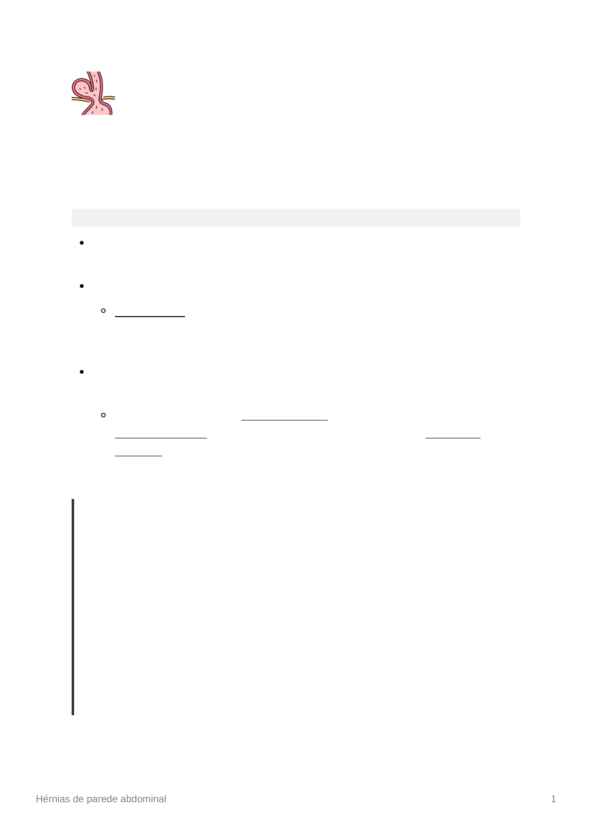 Hérnias de parede abdominal 1 Hérnias de parede abdominal INTRODUÇÃO Hérnias = abaulamento, tumefação, nodulação ou inchaço, redutível ou não, na topografia em questão. São mais frequentes na região inguinal. Outros sítios: femoral, umbilical, epigástrica, linha paramediana semilunar de Spiegel, trígonos lombares de Grynfelt e Petit e incisões cirúrgicas prévias. Quadro clínico: abaulamento móvel, redutível, numa região de fraqueza, associado ou não a dor/desconforto local. Hérnias complicadas: encarceramento (herniação não redutível), estrangulamento (isquemia de uma hérnia encarcerada) e obstrução intestinal secundária ao encarceramento. Hérnia encarcerada: abaulamento não redutível com desconforto local e dor moderada. Hérnia estrangulada: dor local intensa associada a sinais inflamatórios locais, como eritema da pele sobre a hérnia. Pode cursar mais tardiamente com piora clínica do paciente devido aos efeitos sistêmicos resultantes da isquemia e do processo infeccioso secundário. Obstrução intestinal: abdome agudo obstrutivo associado à hérnia encarcerada. Hérnias de parede abdominal 2 Diagnóstico: clínico. Exame de imagem se dúvida diagnóstica ou necessidade de se avaliar o conteúdo da hérnia. Tratamento: cirúrgico através da redução de seu conteúdo, fechamento do defeito e provavelmente colocação de uma tela de polipropileno para reforço aponeurótico. HÉRNIA INGUINAL São as hérnias mais frequentes. Mais comum em homens, no lado direito e na forma indireta. Forma indireta: o saco herniário se insinua através do canal inguinal. Ocorrem insinuando-se no anel inguinal interno e progredindo até atingir o anel inguinal externo, podendo alcançar o saco escrotal (hérnia inguinoescrotal = hérnia indireta). Ocorrem lateralmente aos vasos epigástricos inferiores. Forma direta: o saco herniário se projeta diretamente através da parede abdominal da região inguinal, no Trígono de Hesselbach. Ocorrem medialmente aos vasos epigástricos inferiores. A diferenciação entre elas se dá pelo teste do dedo fletido → o dedo é introduzido, retrogradamente, a partir do anel inguinal externo, palpando-se a partir do escroto alto, dentro do canal inguinal. Solicita-se que o paciente execute uma manobra de Valsava. A hérnia inguinal indireta toca a ponta do dedo do examinador, enquanto a hérnia direta toca sua face lateral. Hérnias de parede abdominal 3 As hérnias inguinais (e também femoral) ocorrem numa grande região denominada Orifício Miopectíneo de Fruchaud, que contém fraquezas potenciais para hérnias, como: o anel femoral (hérnias femorais), o anel inguinal interno (hérnias inguinais indiretas) e o Trígono de Hesselbach (hérnias inguinais diretas. Orifício Miopectíneo de Fruchaud: quadrilátero delimitado pelo m. reto abdominal (medial), ligamento pectíneo ou de Cooper (inferior), m. iliopsoas (lateral) e arco tendíneo dos m. transverso e oblíquo interno (superior). Trígono de Hesselbach: trígono delimitado pelo m. reto abdominal (medial), ligamento inguinal ou de Poupart (inferior) e os vasos epigástricos inferiores (lateral). Nessa região, a cobertura musculoaponeurótica é mínima e está ali exposta e vulnerável a fáscia transversalis. Classificação de Nyhus