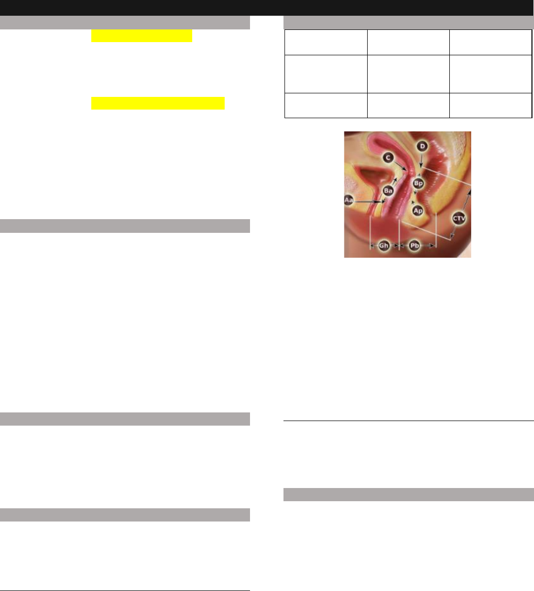 PROLAPSO GENITAL Anatomia • Aparelho de suspensão = ligamentos o Anteriores: pubovesicouterinos o Laterais: cardinais ou paramétrio ou ligamento de McEnroe o Posteriores: uterossacros • Aparelho de sustentação = ossos e músculos o Diafragma pélvico ▪ Elevador do ânus • Puborretal • Ileococcígeo • Pubococcígeo ▪ Coccígeo o Fáscia endopélvica Fatores de risco • Idade > 60 anos (pico 70-79 anos) • História familiar • Raça branca • Anormalidades congênitas • Constipação • Obesidade • Multiparidade, parto vaginal, fórcipe, período expulsivo prolongado • DPOC (aumenta pressão intrabdominal) • Defeitos na qualidade do colágeno • Rotura perineal • Retroversão e medioversão uterinas Quadro clínico • Sensação de peso ou desconforto na região da genitália externa = alivia ao deitar e piora ao longo do dia (ortostatismo prolongado) • “Bola na vagina” • Pode ter dispareunia e disfunção sexual Classificação • Prolapso de 1º grau = não alcança introito vaginal • Prolapso de 2º grau = se exterioriza parcialmente • Prolapso de 3º grau = se exterioriza completamente Segundo órgão • Apical o Uterino o Cúpula → coloca o espéculo e a tumoração vem do fundo da vagina • Vaginal anterior (cistocele) → quando comprime a parede posterior, a bola continua • Vaginal posterior (retocele) → quando comprime a parede posterior com o espéculo, a bola desaparece POP-Q Parede anterior Aa Parede anterior Ba Cérvice/cúpula C Hiato genital Gh Corpo perineal Pb Comprimento total vagina – CTV Parede posterior Ap Parede posterior Bp Fórnice posterior D - a = anterior - b = posterior - C = colo (ponto mais distal do ápice com o colo = D-C). Se hipertrofia > +4 - D = fundo de saco de Douglas. Quando não há útero, não fica descrito - Gh = hiato genital - CVT = comprimento total da vagina (VR 8-10cm) - Sinal negativo = interior da vagina (-1,-2,-3) - Sinal positivo = além do hímen vaginal (carúncula) Estadiamento I. < -1 II. -1 e +1 III. ≥ + 2, mas parcial IV. Total Tratamento • Uterino o Prolapso menor e alto risco cirúrgico = pessários e fisioterapia pélvica o Prolapso maior = histerectomia vaginal com reconstrução do assoalho OU cirurgia de Manchester (amputação parcial do colo com fixação em paramétrio) • Cúpula o Se alto risco cirúrgico = cirurgia de LeFort (colpocleise – fechamento vagina) = impede atividade sexual o Se condição cirúrgica = fixa cúpula no promontório ou sacroespinhoso • Vaginal anterior o Colporrafia anterior (cirurgia de Kelly- Kennedy) o Tela de polipropileno se recidiva • Vaginal posterior o Colporrafia posterior