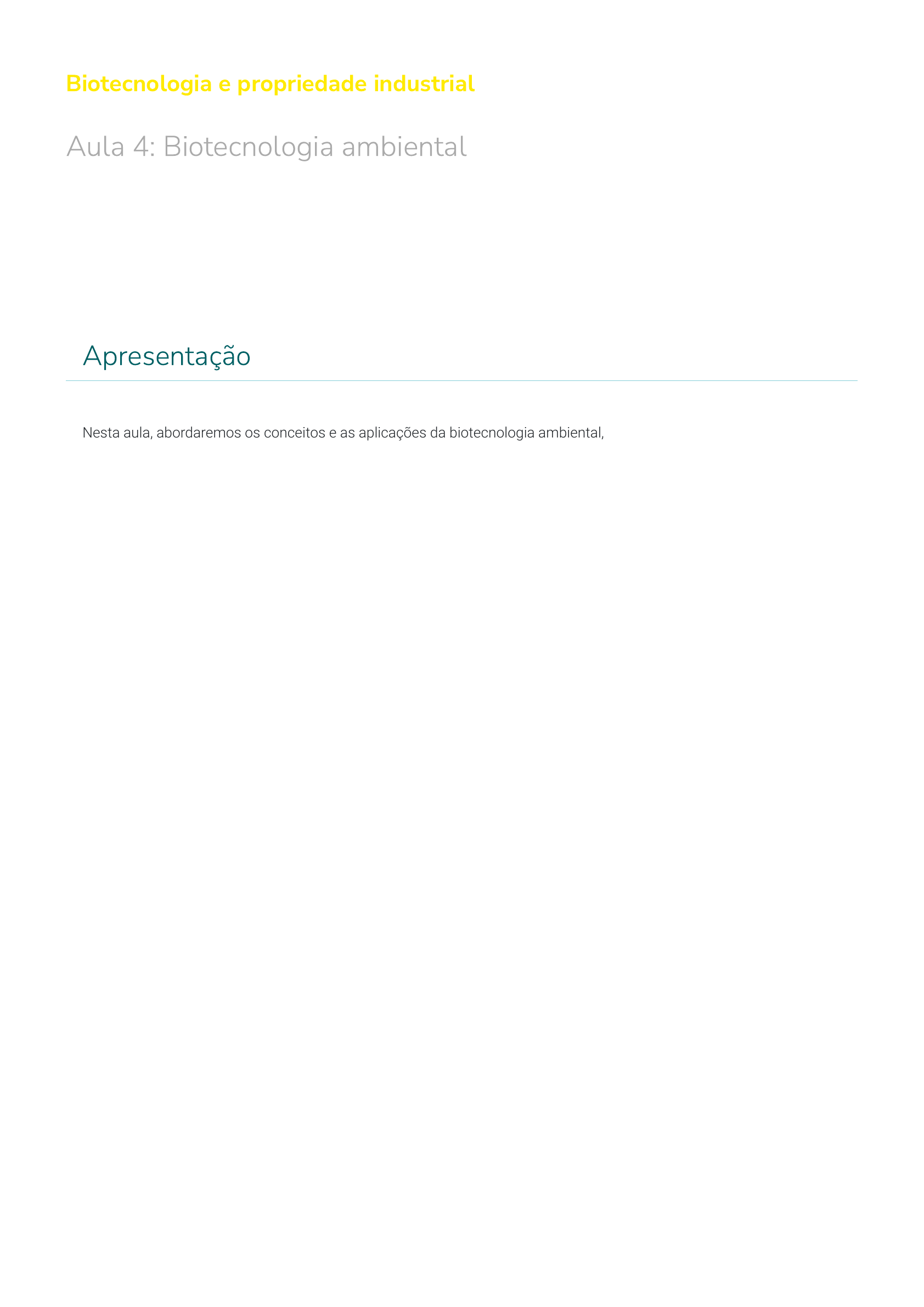 Biotecnologia e propriedade industrial Aula 4: Biotecnologia ambiental Apresentação Nesta aula, abordaremos os conceitos e as aplicações da biotecnologia ambiental, compreendendo os processos de biorremediação, de formação de bioplásticos e de produção de biocombustíveis. Além disso, enfatizaremos sobre as aplicações da biotecnologia para o controle da poluição. Objetivos Diferenciar os processos de biorremediação e as aplicações da biotecnologia no controle da poluição; Explicar a formação de bioplásticos; Descrever o processo de produção de biocombustíveis. Palavras iniciais A ideia de poluição ambiental abrange, entre outras coisas, o destino �nal inadequado de resíduos, o uso incorreto e o lançamento acidental de compostos químicos, contaminando solos, águas super�ciais e subterrâneas, além de ambientes marinhos, representando riscos globais ao meio ambiente e à saúde humana. © Tomas Castelazo, www.tomascastelazo.com / Wikimedia Commons A biotecnologia ambiental é um sistema de conhecimento cientí�co e de engenharia relacionado ao uso de microrganismos e seus produtos na prevenção da poluição ambiental através do biotratamento de resíduos sólidos, líquidos e gasosos, da biorremediação de ambientes poluídos e do biomonitoramento de processos ambientais. Biotecnologia ambiental A biotecnologia ambiental está emergindo como um campo distinto, que combina as disciplinas de ciências biológicas, ecologia e engenharia relacionadas para explorar processos biológicos (principalmente microbianos) em aplicações ambientais, agrícolas e de tratamento de resíduos. As vantagens do tratamento biotecnológico de resíduos são as seguintes: 1 Biodegradação ou desintoxicação de um amplo espectro de substâncias perigosas por microrganismos naturais. 2 Disponibilidade de uma ampla gama de métodos biotecnológicos para a destruição completa de resíduos perigosos e diversidade das condições adequadas para biodegradação. Entre as técnicas utilizadas, a biorremediação é uma importante ferramenta para regenerar ambientes contaminados, apresentando menor agressão ao ecossistema envolvido e podendo, assim, ser um meio de amenizar os danos causados. Atenção! Aqui existe uma videoaula, acesso pelo conteúdo online Saiba mais https://stecine.azureedge.net/webaula/estacio/go0266/aula4.html Para saber mais sobre o assunto, assista ao vídeo Biorremediação – 1 minuto com ciência. Essa técnica pode ser empregada para atacar contaminantes especí�cos no solo e em águas subterrâneas. Apresenta como vantagem o baixo custo e a pouca interferência no ambiente. Os sistemas microbianos, como bactérias, fungos e plantas, são mais amplamente empregados em programas de biorremediação, e os processos metabólicos dos organismos, principalmente os contaminantes, usam como energia fontes que resultam em subprodutos não tóxicos ou menos tóxicos. Saiba mais javascript:void(0); Para saber mais sobre o assunto, assista ao vídeo Biotecnologia na recuperação de áreas contaminadas. Os tipos de técnicas utilizadas na biorremediação in situ estão divididas em bioestimulação, bioaumentação, bioventilação, biorremediação intrínseca e �torremediação. Vamos conhecer um pouco mais algumas delas a seguir. Clique nos botões para ver as informações. Fitorremediação é o processo que consiste no uso de plantas para remoção de poluentes de solo ou água contaminados. A �torremediação é uma alternativa ambientalmente amigável e econômica se comparada às atuais tecnologias de remediação. A contaminação do solo e da água com resíduos orgânicos ou inorgânicos apresenta grandes problemas, e a remediação ambiental baseada em plantas tem sido amplamente adotada como uma tecnologia de limpeza favorável para remover poluentes do meio ambiente ou torná-los inofensivos. Fitorremediação A bioestimulação ocorre quando há crescimento de microrganismos naturais (autóctones). O processo consiste na aplicação de microrganismos alóctones para aumentar a habilidade dessas comunidades em degradar a carga poluente presente na biota. Bioestimulação A biorremediação intrínseca utiliza o processo natural para a degradação dos poluentes, mas a descontaminação é lenta, sendo necessário o monitoramento do local por um longo período. Biorremediação intrínseca A bioventilação, por sua vez, é caracterizada pela injeção de ar ou oxigênio em solo e águas subterrâneas contaminados, sendo ideal para grandes áreas contaminadas e mais e�ciente em ambiente aeróbio. Bioventilação javascript:void(0); O papel das cianobactérias (Fonte: Dr. Norbert Lange / Shutterstock.) Estudos recentes mostraram que locais poluídos por petróleo são ricos em consórcios de cianobactérias capazes de degradar os componentes do óleo. As cianobactérias desses consórcios facilitaram os processos de degradação. Atenção! Aqui existe uma videoaula, acesso pelo conteúdo online Engenharia genética integrada à biorremediação A engenharia genética integrada à biorremediação auxilia na manipulação do genoma bacteriano, podendo aumentar a desintoxicação de metais tóxicos e a restauração de locais contaminados. Essas técnicas incluem engenharia genética com genes ou operons únicos, construção de vias e alternâncias das sequências de genes existentes. Saiba mais Para saber mais sobre o assunto, assista ao vídeo Fotorremediação: o uso de plantas para descontaminação ambiental. Bioplásticos A poluição por plásticos se tornou um problema global e uma ameaça à saúde ambiental e humana. Os bioplásticos bacterianos ou poli-hidroxialcanoatos, PHAs, são um material lipídico acumulado por uma grande variedade de microrganismos, quando em presença de fontes abundantes de carbono. Representam uma classe complexa de poliésteres bacterianos de ocorrência natural, reconhecidos como bons substit