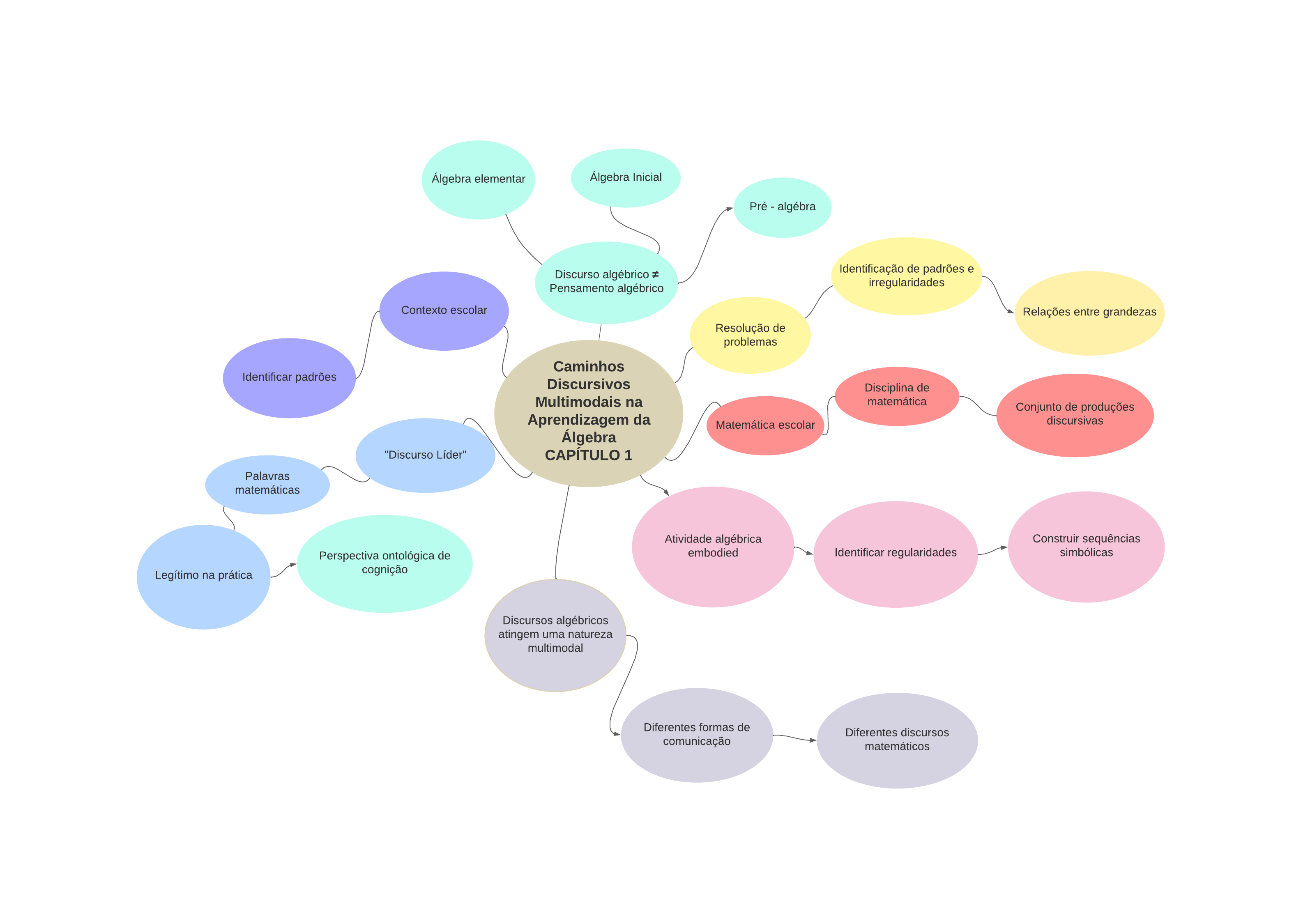 Caminhos Discursivos Multimodais na Aprendizagem da Álgebra CAPÍTULO 1 Resolução de problemas Matemática escolar "Discurso Líder" Discurso algébrico ? Pensamento algébrico Disciplina de matemática Conjunto de produções discursivas Palavras matemáticas Contexto escolar Álgebra elementar Identificação de padrões e irregularidades Identificar padrões Álgebra Inicial Legítimo na prática Pré - algébra Relações entre grandezas Perspectiva ontológica de cognição Atividade algébrica embodied Identificar regularidades Construir sequências simbólicas Discursos algébricos atingem uma natureza multimodal Diferentes formas de comunicação Diferentes discursos matemáticos Mapa mental P�gina 1