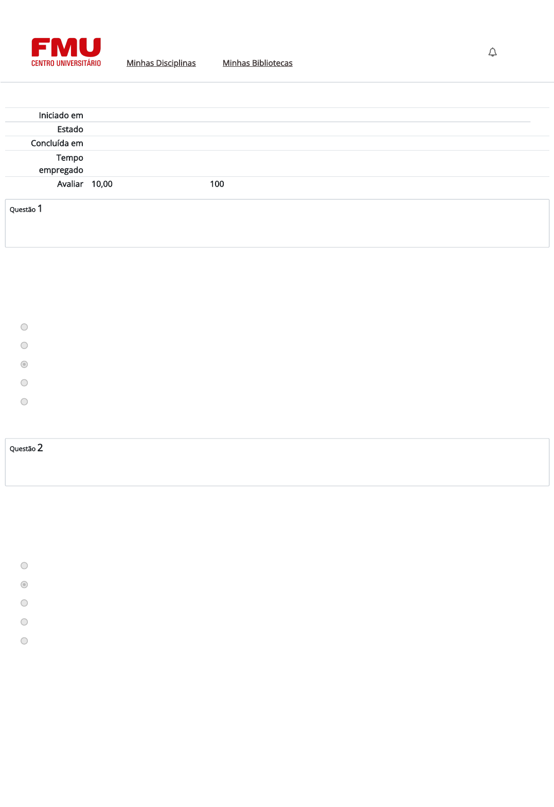 Iniciado em quarta, 3 mai 2023, 12:27 Estado Finalizada Concluída em quarta, 3 mai 2023, 12:41 Tempo empregado 14 minutos 15 segundos Avaliar 10,00 de um máximo de 10,00(100%) Questão 1 Correto Atingiu 1,00 de 1,00 Questão 2 Correto Atingiu 1,00 de 1,00 Englobando tanto o fator de aprendizado do conhecimento quanto do aprendizado da cidadania, percebemos que o termo educar vai além da simples concepção de letramento, graus de ensino ou aprendizado de conhecimentos técnicos. A ideia de se educar o indivíduo para a vida social comporta a necessidade de uma formação: a. afetiva, social e política b. humana, social e tecnológica c. humana, social e política d. humana, social e democrática e. humana, democrática e política As conquistas obtidas pela humanidade por meio de sua racionalidade podem ser fartamente observadas no moderno modo de vida dos grandes centros urbanos que, neste caso, demonstram como o homem conseguiu evoluir em sua tarefa de transformar a natureza em prol de seu bem-estar. Essas conquistas são avanços tecnológicos nos campos: a. da produção industrial e agrícola b. Todas as alternativas são corretas c. da economia d. da comunicação e. dos transportes Guia Digital Carreiras e Internacionalização NAP CPA Responsabilidade Socioambiental Minhas Disciplinas Minhas Bibliotecas MA https://codely-fmu-content.s3.amazonaws.com/Moodle/GuiaDigital/Guia+digital/index.html https://carreiras.fmu.br/ https://codely-fmu-content.s3.amazonaws.com/Moodle/NAP/inicial/nap/fmu/index.html https://codely-fmu-content.s3.amazonaws.com/Moodle/CPA/landing_CPA/index.html https://portal.fmu.br/sustentabilidade https://ambienteacademico.com.br/ https://ambienteacademico.com.br/ https://ambienteacademico.com.br/course/view.php?id=236 Questão 3 Correto Atingiu 1,00 de 1,00 Questão 4 Correto Atingiu 1,00 de 1,00 Durante a Idade Moderna, vemos uma grande produção de tecnologia, desde a luneta que proporcionou a Galileu observar os astros celestes, até a invenção da máquina a vapor no início do século XVIII. As ciências naturais, tais como a ______, a _________ e a ___________, demandaram a concepção e construção de mecanismos, instrumentos e procedimentos que representaram uma inovação em relação à forma como o conhecimento era obtido na Idade Média, algo entendido como intrínseco ao homem, ou seja, vinha do interior de seu intelecto. a. �loso�a, a física e a biologia b. medicina, a física e a biologia c. química, a física e a nutrologia d. geogra�a, a física e a biologia e. química, a física e a biologia Podemos entender que a ideia de Pós-Modernidade surge com diversos pontos de ruptura nos principais ideais modernos. O �nal do século XX trouxe acontecimentos políticos e tecnológicos que causaram profunda impressão na compreensão de como tem se desenvolvido as sociedades atuais. Na opinião de Ribeiro (2016), o �nal do século XX é marcado por constantes mudanças políticas, principalmente nos países mais desenvolvidos, tais como: 1. Estados Unidos 2. Japão 3. Alemanha 4. Rússia 5. China. Neste caso, os países mais desenvolvidos são: a. II, III, V b. I, II, III, IV c. Todos estão corretos d. I, III, IV e. I, III, IV, V Guia Digital Carreiras e Internacionalização NAP CPA Responsabilidade Socioambiental Minhas Disciplinas Minhas Bibliotecas MA https://codely-fmu-content.s3.amazonaws.com/Moodle/GuiaDigital/Guia+digital/index.html https://carreiras.fmu.br/ https://codely-fmu-content.s3.amazonaws.com/Moodle/NAP/inicial/nap/fmu/index.html https://codely-fmu-content.s3.amazonaws.com/Moodle/CPA/landing_CPA/index.html https://portal.fmu.br/sustentabilidade https://ambienteacademico.com.br/ https://ambienteacademico.com.br/ https://ambienteacademico.com.br/course/view.php?id=236 Questão 5 Correto Atingiu 1,00 de 1,00 Questão 6 Correto Atingiu 1,00 de 1,00 A obra Educação sem Distância: as Tecnologias Interativas na Redução de Distâncias em Ensino e Aprendizagem (TORI, 2016), aborda: a. a relação entre ensino e tecnologia na moderna educação digital. Tendo como foco a educação à distância, o autor Romero Tori trata de forma crítica e bem relacionada a realidade da educação por meio das novas tecnologias interativas. Feedback Geral: (não indicar a letra da alternativa correta, pois as são randômicas). b. um movimento intelectual é que ele se tornou a base para a forma de se fazer ciência na modernidade. c. uma proposta para o estudo especí�co dos acontecimentos ocorridos em cada momento particular da História, havendo dentro deles outras separações. d. que a modernidade não é apenas uma marcação histórica de acontecimentos sociais, intelectuais e políticos, é a caracterização de uma virada tanto intelectual quanto social na forma de vida do homem e na maneira como ele entende e age sobre o mundo. e. que o termo “tecnologia” está atrelado apenas ao passado dos dispositivos eletrônicos. Na opinião de Rodrigues (1987), quando a educação passa a ser apenas uma ponte entre a vida infantil, não produtiva, e a vida adulta, produtiva, sendo o indivíduo preparado unicamente para esse �m, ela perde seu _______________. Ainda segundo o autor, quando a educação passa a apenas treinar trabalhadores, ela deixa de exercer sua função de desenvolvedora de cultura, consciência política e intelectual. a. sentido humanitário b. sentido formador c. sentido comunitário d. sentido pro�ssional e. sentido tecnológico Guia Digital Carreiras e Internacionalização NAP CPA Responsabilidade Socioambiental Minhas Disciplinas Minhas Bibliotecas MA https://codely-fmu-content.s3.amazonaws.com/Moodle/GuiaDigital/Guia+digital/index.html https://carreiras.fmu.br/ https://codely-fmu-content.s3.amazonaws.com/Moodle/NAP/inicial/nap/fmu/index.html https://codely-fmu-content.s3.amazonaws.com/Moodle/CPA/landing_CPA/index.html https://portal.fmu.br/sustentabilidade https://ambienteacademico.com.br/ https://ambien