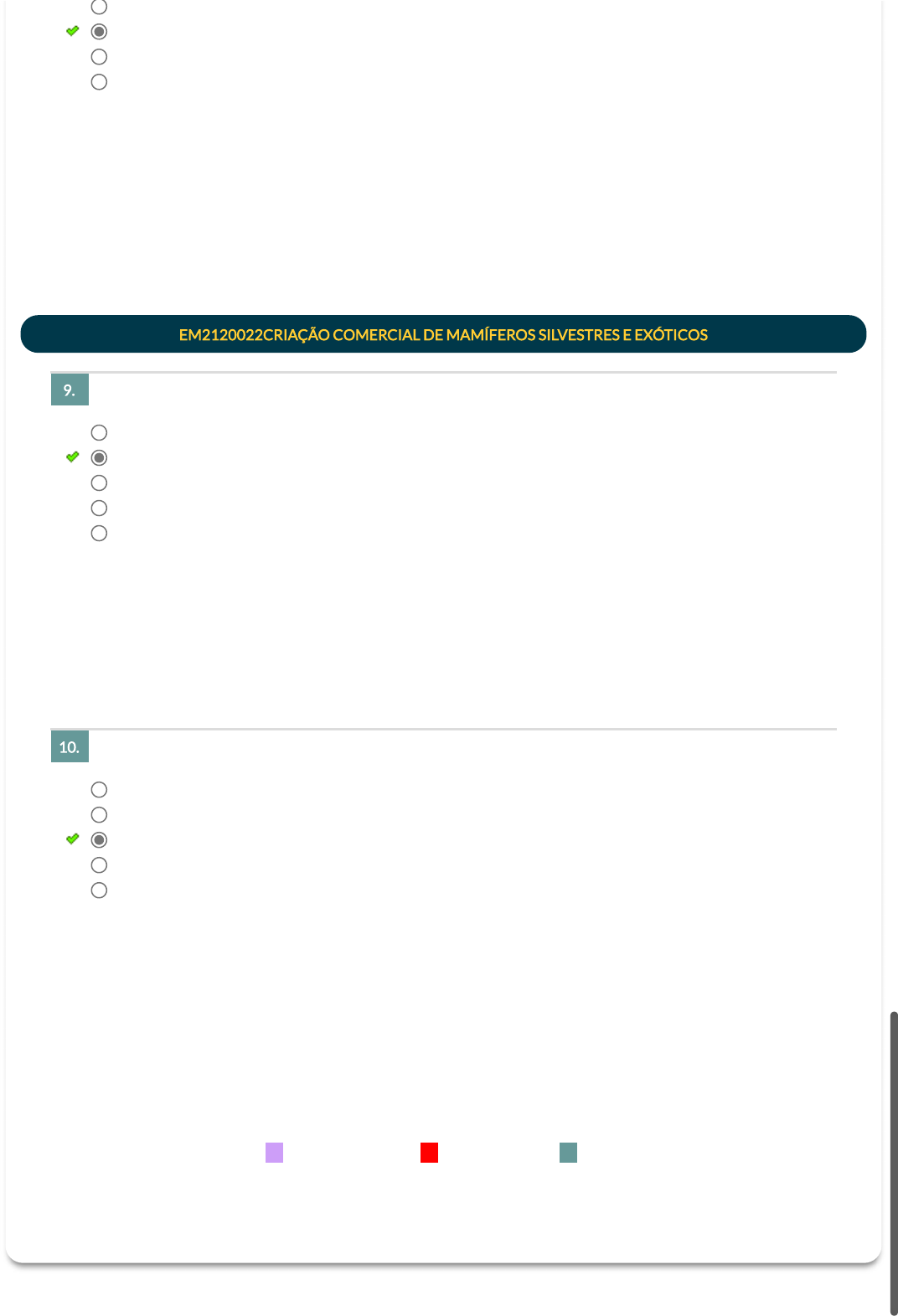 03/05/2023, 16:03 Estácio: Alunos https://simulado.estacio.br/alunos/ 1/1 Em relação às espécies exóticas importadas para o Brasil, aponte a a�rmativa correta: Em relação aos porcos silvestres criados no Brasil, podemos dizer que: Aves ratitas Aves de rapina Galináceos selvagens Psitaciformes Data Resp.: 03/05/2023 15:59:18 Explicação: A resposta certa é: Aves de rapina EM2120022CRIAÇÃO COMERCIAL DE MAMÍFEROS SILVESTRES E EXÓTICOS 9. Todas as espécies exóticas importadas devem ser castradas. Nem todas as espécies podem ser importadas e algumas só podem ser vendidas castradas. Qualquer animal pode ser importado para criação amadora. Qualquer animal exótico importado legalmente pode ser reproduzido no país. Não é necessário controle sanitário para animais provenientes da Europa e dos EUA. Data Resp.: 03/05/2023 15:59:35 Explicação: A resposta certa é: Nem todas as espécies podem ser importadas e algumas só podem ser vendidas castradas. 10. São da mesma espécie do javali. São espécies sensíveis que requerem muitos cuidados médico-veterinários. Embora parecidos �sicamente e de manejo semelhante, são espécies distintas. São espécies dóceis e fáceis de lidar. São espécies que requerem uma alimentação especial, muito custosa. Data Resp.: 03/05/2023 15:59:58 Explicação: A resposta certa é: Embora parecidos �sicamente e de manejo semelhante, são espécies distintas. Não Respondida Não Gravada Gravada Exercício inciado em 03/05/2023 15:55:06.
