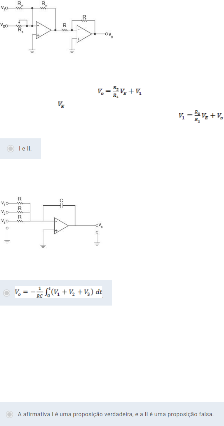 1 - O uso de diversos tipos de circuitos com amplificadores nos mostra que eles podem ser utilizados para o desenvolvimento de controladores e circuitos para a filtragem ativa de dado sinal. No circuito apresentado a seguir, por exemplo, tem-se um circuito desenvolvido para a implementação de um controlador de ação proporcional. Observe a figura com atenção! Fonte: PERTENCE JR., 2007, p. 91. PERTENCE JR., A. Amplificadores operacionais e filtros ativos. 6. ed. São Paulo: Bookman, 2007. Dentro desse contexto, com base na configuração apresentada e nas informações expostas, acerca do circuito proposto, podemos afirmar que: I. a tensão de saída é dada como ; II. o sinal de tensão corresponde, na prática, ao erro do controlador; III. ao calcularmos a tensão de saída do controlador, obtemos ; IV. a saída do controlador é dada pelo sinal do erro E. Está correto o que se afirma em: 2 - Um circuito integrador pode ser obtido não só para o cálculo da integral de dado sinal de entrada, tomado isoladamente. Prova disso é o circuito eletrônico visto a seguir, desenvolvido para a obtenção de um circuito amplificador integrador, com o uso de amplificadores operacionais de uso geral. Além disso, nesse caso, utiliza- se como exemplo três sinais distintos, mas é possível desenvolver um circuito com mais sinais de entrada. Fonte: PERTENCE JR., 2007, p. 86. PERTENCE JR., A. Amplificadores operacionais e filtros ativos. 6. ed. São Paulo: Bookman, 2007. Nesse sentido, considerando as informações apresentadas e a figura exposta anteriormente, qual seria a tensão de saída nesse caso? 3 - Um seguidor de tensão, também conhecido como buffer, é um tipo especial de circuito amplificador que pode ser desenvolvido com amplificadores operacionais em geral. Esse tipo de circuito serve para realizar o isolamento entre diferentes estágios de um circuito eletrônico que possua circuito de potência em seu desenvolvimento, por exemplo. Os seguidores de tensão ainda podem ser aplicados no casamento de impedâncias. Dessa forma, com base em nossos estudos sobre o seguidor de tensão, analise as afirmativas a seguir e a relação proposta entre elas. I. O seguidor de tensão com amplificador operacional pode ser desenvolvido simplesmente pela ligação do terminal inversor com a saída PORQUE II. é esse tipo de realimentação que permite, na prática, a obtenção de um ganho de tensão unitário ao final, na saída do circuito. Agora, assinale a alternativa correta. 4 - Os filtros ativos são circuitos desenvolvidos a partir do uso de amplificadores operacionais, geralmente os mais comercializados, como é o caso do próprio µA 741 e do LM 351. Estes permitem, através do uso de certos tipos de aproximações matemáticas, o desenvolvimento de um circuito eletrônico capaz de fazer a filtragem de faixas de frequência, a partir de 0 Hz ou não, rejeitando dentro do especificado. Assim, com base no assunto e considerando mais especificamente as diferenças entre os filtros ativos e passivos, analise as afirmativas a seguir e marque V para as verdadeiras e F para as falsas. I. ( ) Os filtros ativos são utilizados, geralmente, até 1 MHz. II. ( ) O ganho de potência de um filtro passivo normalmente é maior. III. ( ) Os filtros passivos utilizam somente elementos passivos, ou seja, resistores. IV. ( ) Os filtros ativos são mais fáceis de conseguir sintonização. Assinale a alternativa que apresenta a sequência correta: 5 - Os amplificadores operacionais, também conhecidos como amp-ops, foram desenvolvidos ainda na década de 1940, a partir do uso de válvulas. Os dispositivos mais otimizados, porém, só foram possível a partir do uso de transistores, criados mais adiante. De acordo com Pertence Jr. (2007), o primeiro amp-op monolítico, em circuito integrado, por exemplo, foi lançado no ano de 1963 pela Fairchild, nos Estados Unidos. PERTENCE JR., A. Amplificadores operacionais e filtros ativos. 6. ed. São Paulo: Bookman, 2007. Assim, com base em nossos estudos a respeito dos amplificadores operacionais, analise as afirmativas a seguir. I. O primeiro amp-op, embora já em CI, possui uma série de desvantagens, como baixa amplificação. II. Um dos motivos que desmotivaram o uso do primeiro amp-op monolítico foi a necessidade de alimentações diferentes. III. O µA741 foi bastante popular durante muito tempo, sendo um dos primeiros amplificadores operacionais. IV. A maioria dos amplificadores operacionais é desenvolvida a partir de transistores de efeito de campo, os FETs. Está correto o que se afirma em: 6 - Observe a figura a seguir. Fonte: PERTENCE JR., 2007, p. 19. PERTENCE JR., A. Amplificadores operacionais e filtros ativos. 6. ed. São Paulo: Bookman, 2007. Com base na figura anterior, é possível observar o porquê de haver um curto-circuito, idealmente, a ser considerado na análise de um circuito elétrico ou eletrônico com amplificadores operacionais. Similarmente, como não há circulação de corrente na entrada do dispositivo, considera-se idealmente que há um aterramento. s dois conceitos são o terra virtual e o curto-circuito virtual, utilizados para se entender e projetar amplificadores. Assim, acerca do funcionamento do amplificador, do amplificador operacional real e de aspectos de análise, analise as afirmativas a seguir e marque V para as verdadeiras e F para as falsas. I. ( ) As correntes e são nulas. II. ( ) A tensão é nula. III. ( ) A resistência é nula. IV. ( ) A corrente é nula. Agora, assinale a alternativa com a sequência correta. 7 - Os circuitos amplificadores, juntamente com os denominados filtros ativos, foram desenvolvidos a partir de uma série de características criadas para os amplificadores operacionais ao longo do tempo. Outro ponto importante a se destacar é que há um bom tempo as características dos amplificadores do tipo 741 foram estabelecidas, sendo mantidas desde então, como de impedância de entrada e de sa