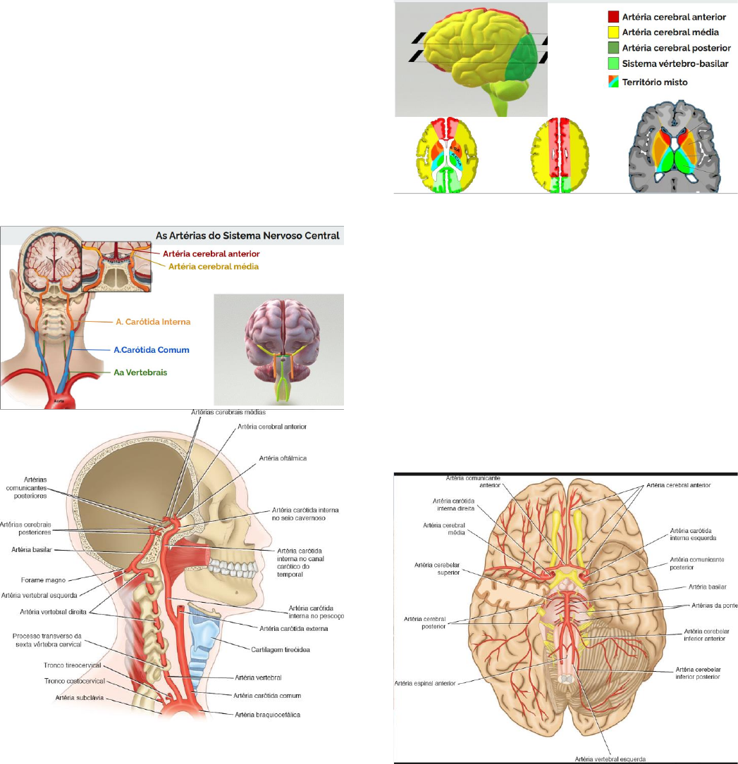 Neurologia 7°P Isadora Campos 02/03/23 Circulação cerebral e liquor 1) Conhecer as principais artérias e veias do cérebro. 2) Entender como o líquido cefalorraquidiano é produzido e drenado 3) Aprender a utilidade de se analisar o líquor 4) Conhecer os fatores que interferem na pressão intracraniana. ➔ Artérias do encéfalo Suprido pelas duas artérias carótidas internas e pelas duas artérias vertebrais. As quatro artérias situam-se dentro do espaço subaracnóideo, e seus ramos se anastomosam sobre a face inferior do encéfalo para formar o círculo arterial do cérebro (círculo de Willis). • Artéria carótida interna Começa na bifurcação da artéria carótida comum, onde habitualmente possui uma dilatação localizada denominado seio carótico. A artéria ascende pelo pescoço e perfura a base do crânio, atravessando o canal carótico do osso temporal. Nesta altura, entra no espaço subaracnóideo ao perfurar a aracnoide-máter e volta-se posteriormente até a região da extremidade medial do sulco lateral do cérebro. Então, divide-se nas artérias cerebrais anterior e média. • Artéria vertebral A artéria vertebral, um ramo da primeira parte da artéria subclávia, ascende pelo pescoço atravessando os forames nos processos transversos das seis vértebras cervicais superiores. Entra no crânio através do forame magno e perfura a dura-máter e a aracnoide-máter para entrar no espaço subaracnóideo. Em seguida, segue para cima, para a frente e medialmente sobre o bulbo. Na margem inferior da ponte une-se ao vaso do lado oposto para formar a artéria basilar. • Artéria basilar Neurologia 7°P Isadora Campos 02/03/23 A artéria basilar, formada pela união das duas artérias vertebrais, ascende em um sulco na face anterior da ponte. ➔ Círculo arterial do cérebro O círculo arterial do cérebro (círculo de Willis) situa-se na fossa interpeduncular, na base do cérebro. É formado por anastomose entre as duas artérias carótidas internas e as duas artérias vertebrais. As artérias comunicante anterior, cerebral anterior, carótida interna, comunicante posterior, cerebral posterior e basilar contribuem para o círculo. O círculo arterial do cérebro possibilita a entrada de sangue pelas artérias carótidas internas ou vertebrais, com distribuição para qualquer parte dos dois hemisférios cerebrais. Ramos corticais e centrais originam-se do círculo e suprem a substância cerebral. É comum a ocorrência de variações nos tamanhos das artérias que formam o círculo, e foi relatada a ausência de uma ou de ambas as artérias comunicantes posteriores. ➔ Artérias para áreas especificas do encéfalo O corpo estriado e a cápsula interna são supridos principalmente pelos ramos estriados mediais e laterais da artéria cerebral média; os ramos centrais da artéria cerebral anterior suprem o restante dessas estruturas. O tálamo é suprido principalmente por ramos das artérias comunicante posterior, basilar e cerebral posterior. O mesencéfalo é suprido pelas artérias cerebral posterior, cerebelar superior e basilar. A ponte é suprida pelas artérias basilar e cerebelares inferior, anterior e superior. O bulbo é suprido pelas artérias vertebral, espinais anterior e posterior, cerebelar inferior posterior e basilar. O cerebelo é suprido pelas artérias cerebelar superior, cerebelar inferior anterior e cerebelar inferior posterior. Neurologia 7°P Isadora Campos 02/03/23 ➔ Veias do encéfalo As veias do encéfalo não possuem tecido muscular em suas paredes muito finas, e são desprovidas de válvulas. Surgem a partir do encéfalo e situam-se no espaço subaracnóideo. Perfuram a aracnoide-máter e a camada meníngea da dura-máter e drenam para os seios venosos da dura-máter. Veias para áreas específicas do encéfalo O mesencéfalo é drenado por veias que deságuam nas veias basilar ou cerebral magna. A ponte é drenada por veias que desembocam na veia basilar, nas veias cerebelares ou em seios venosos adjacentes. O bulbo é drenado por veias que deságuam nas veias espinais e seios venosos adjacentes. O cerebelo é drenado por veias que desembocam na veia cerebral magna ou nos seios venosos adjacentes. Neurologia 7°P Isadora Campos 02/03/23 ➔ Correlações clínicas Isquemia cerebral: Ocorre inconsciência em 5 a 10 segundos se o fluxo sanguíneo para o encéfalo for totalmente interrompido. A parada completa do fluxo sanguíneo cerebral é rapidamente seguida de dano irreversível ao encéfalo, com morte do tecido nervoso. Interrupção da circulação cerebral: As lesões vasculares do encéfalo são extremamente comuns, e o defeito neurológico resultante depende do tamanho da artéria ocluída, do estado da circulação colateral e da área do encéfalo afetada. Síndrome das artérias cerebrais: lesões nas artérias carótida comum, carótida interna e vertebral no pescoço. Oclusão da artéria cerebral anterior Hemiparesia e perda hemissensitiva contralaterais, acometendo principalmente a perna e o pé (lóbulo paracentral do córtex) 2.Incapacidade de identificar objetos corretamente, apatia e alterações da personalidade (lobos frontal e parietal). Oclusão da artéria cerebral média Hemiparesia e perda hemissensitiva contralaterais acometendo principalmente a face e o braço (giros pré-central e pós-central) 2.Afasia se o hemisfério esquerdo estiver afetado (raramente, se o hemisfério direito estiver afetado) 3.Hemianopsia homônima contralateral (dano à radiação óptica) 4.Anosognosia, se o hemisfério direito estiver afetado (raramente, se houver comprometimento do hemisfério esquerdo). Oclusão da artéria cerebral posterior Hemianopsia homônima contralateral, com algum grau de preservação macular (dano ao córtex calcarino, preservação macular, visto que o polo occipital recebe suprimento sanguíneo colateral da artéria cerebral média) 2.Agnosia visual (isquemia do lobo occipital esquerdo) 3.Comprome