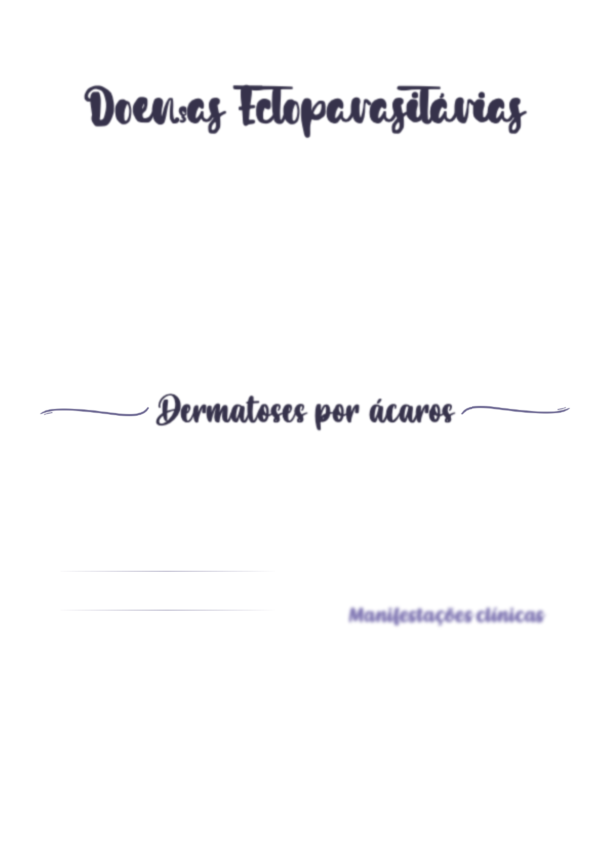 Juliana Silva | 1 Dermatologia Doenças Ectoparasitárias Dermatoses por ácaros: ➡ Escabiose ➡ Ixodíase Dermatoses por insetos anopluros: ➡ Pediculose do couro cabeludo ➡ Pediculose do corpo ➡ Pediculose do pubis Escabiose A escabiose ou sarna é uma dermatose produzida por um ácaro ⇢ Sarcoptes scabiei var. hominis Escabiose humana ≠ Escabiose animal A escabiose dos animais não é a mesma do ser humano, pode ser que ocorra transmissão, mas é localizada e ela regride espontaneamente sem tratamento, pois o ácaro não sobrevive (biologia não é a mesma) Dermatose por Siphonaptera (pulgas): ➡ Pulíase ➡ Tungíase Transmissão: ⇥ Contato pessoal Sem preferência por idade, sexo ou raça ⇥ A possibilidade de transmissão por roupas é excepcional Manifestações clínicas Principal sintoma ⇢ prurido intenso durante a noite Na semiologia devemos analisar 3 elementos: o sulco, a distribuição e as lesões secundárias • Lesão típica: sulco acariano Dermatoses por ácaros Juliana Silva | 2 Dermatologia O sulco escavado pelo parasita é uma pequena saliência linear, até 1 cm, em uma das extremidades, uma vesicopápula, perlácea, do tamanho da cabeça de um al f inete - onde se encontra a fêmea do ácaro (deve ser pesquisada) • Mais facilmente encontrada em crianças • Presença de mais de um caso na família - frequentemente pega a família inteira Em homens: ⇥ No genital (fecha o diagnóstico) Em mulheres: ⇥ Região da mama Na criança: ⇥ Lesão de couro cabeludo, face, lesões urticadas e eczematizadas ⇥ Provavelmente pegou dentro de casa e não na rua Nos idosos: ⇥ Costuma ter lesão nas costas (não dá tanto prurido) • O prurido é porque a fêmea se movimenta pelo corpo do indivíduo, principalmente a noite • Não é muito fácil de achar o parasita ⇢ encontram-se em média 15 parasitas Juliana Silva | 3 Dermatologia Iatrogenias: ⇥ Ocorre quando é tratado como escabiose mas não é ou quando não é tratado como escabiose, mas na verdade é Sarna norueguesa ou crostosa: ⇥ Os números de parasita são milhares ⇥ É altamente contagiosa Sarna nodular: ⇥ Aparecimento de lesões nodulares, principalmente na bolsa escrotal do pênis, na região axilar, na vulva feminina, nas virilhas, no doente que foi tratado com escabiose (sequela que é uma pápula-nodulo pruriginosa) Infecções secundárias • Escoriações e piodermites, como impetigo, foliculite, furúnculo e ectima. • Em crianças são encontradas úricas e áreas de eczematização Diagnóstico diferencial de escabiose na criança: lesão acro-pustulosa infantil Presença de selo-pápulas (pápulas com uma vesícula no centro) - prurigo da escabiose Prurigo = coceira + selopápulas Sarna norueguesa Juliana Silva | 4 Dermatologia Presença de lesões crostosas comprometendo todo o tegumento. Esses doentes não se coçam, então o parasita vai se acumulando. Encontramos a sarna norueguesa em alcoólotra crônico, da síndrome de Down e nos pacientes com HIV — falta de imunidade (pois é a presença da imunidade que faz com que não tenha múltiplos parasitas). Diagnóstico diferencial da lesão acima: ⇥ Dermatite seborreica no couro cabeludo Diagnóstico Sugerido, principalmente, pelo prurido noturno, e presença de familiares com prurido. Dermatoscopia: • Encontra-se os sulcos acarianos • Sinal em asa delta Escabiose por ácaros de animais ➡ Sarcoptes canis ➡ Sarcoptes suis ➡ Sarcoptes caprae Tratamento Permetrina: tratamento eletivo ⇥ Loção a 5% ⇥ Deve-se tratar a família inteira ao mesmo tempo, se não f izer isso, vai recidivar. ⇥ Deve ser usada por 1 semana Sarna nodular Juliana Silva | 5 Dermatologia Enxofre precipitado: tratamento para crianças (6-11 anos de idade) e bebês ⇥ 5 a 10% em pasta d’água Ivermectina: ⇥ 1 comprimido a cada 30 kg de peso ⇥ Não é tratamento para escabiose comum, é tratamento para sarna norueguesa ⇥ Ela é associada ao tratamento tópico, não é efetiva para escabiose sozinha ⇥ Não funciona direito na sarna comum por conta do ciclo do parasita Trocar a roupa e passar a permectina ou o enxofre precipitado toda vez que tomar banho! Ixodíase Ixodides ou carrapatos, ácaros são ectoparasitas que parasitam desde animais de sangue frio, até mamíferos e o homem Espécie mais frequente: Amblyomma cajennense Chamado de carrapato estrela ou carrapato de cavalo É um dos principais fatores da riquetsiose Ciclo: Ovo ⇢ ninfa hexápode ⇢ ninfa octópode ⇢ adulto A cúpula ocorre na fase parasitária no geral A fêmea após sugar o sangue do hospedeiro aumenta muito de tamanho e se desprende dele, caindo no solo. Em seguida, ela procura um lugar abrigado e deposita seus ovos, que são agrupados, formando, eventualmente, massa compacta. Após tempo variável, os ovos dão origem a ninfas hexápode. Estas f ixam-se em hospedeiros e sugam o sangue, necessário para a transformação da ninfa octópode em adulto Doença de Lyme: causada pelo espiroqueta Borrelia burgdorferi ⇥ É transmitida por carrapatos do gênero Ixodes ⇥ Também chamada de Borreliose ⇥ Carrapatos do gênero Ixodes (ixodes ricinus) - Não tem no Brasil Manifestações clínicas • Prurido intenso, formação de pápulas encimadas por crostículas Juliana Silva | 6 Dermatologia • Ocorrem principalmente nos membros inferiores, eventualmente disseminadas pelo contato com a massa de ninfas Os anopluros (Anaplura) são denominados piolhos, são ectoparasitas pequenos, que parasitam o couro cabeludo e o corpo, sendo responsáveis pelas pediculoses. São causadas pelo mesmo parasita, apenas raças biológicas diferentes! Pediculose do couro cabeludo ➡ Queixa de prurido ➡ Conf irmado o diagnóstico pela presença dos ovos ( f êmeas ) que são ovo i des , esbranquiçadas e aderentes à haste do cabelo ➡ As fêmeas são maiores do que os machos ➡ Todo indivíduo com coceira na cabeça, principalmente concentrada na região occ