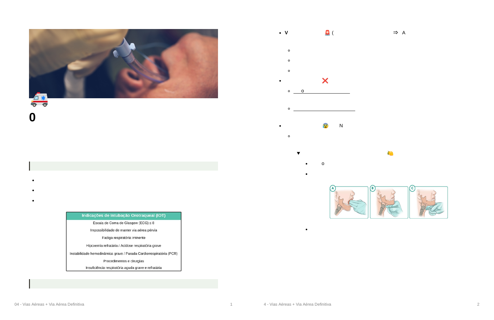 04 - Vias Aéreas + Via Aérea Definitiva 1 🚑 04 - Vias Aéreas + Via Aérea Definitiva Avaliação + algoritmos Decisão de intubar Há incapacidade de manter ou proteger a via aérea? Há incapacidade de ventilar ou oxigenar? Qual a evolução clinica ou desfecho esperado? Definições 04 - Vias Aéreas + Via Aérea Definitiva 2 Via Aérea Crítica 🚨 (imediata ou ”crash airway”) ⇒ FAZER IOT COM LARIGOSCOPIA DIRETO Arresponsivo Inconsciente Pré parada (”near death”) Via Aérea Falha ❌ ”Não Intubo Não Oxigeno” – NINO – a qualquer momento durante a tentativa de IOT, não conseguimos oxigenar (sat menor que 90) ”Não Intubo, porém oxigeno” – é considerada após três tentativas de IOT falhas por um operador experiente, no entanto, com saturação adequada na VBVM Via Aérea Difícil 😰 → ANATÔMICA X FISIOLÓGICA Quando um exame pré IOT identificou atributos físicos que podem tornar o cenário mais difícil Dificuldade na Laringoscopia (LEMON) 🍋 L: Look externally → ectoscopia E: Evaluate → 3-3-2 M: Mallampati 04 - Vias Aéreas + Via Aérea Definitiva 3 O: Obstrução/obesidade N: “Neck mobility” - Mobilidade do pescoço Classificação de Cormark-Lehane Grau 1 - Todas estruturas Grau 2 - Vejo apenas algumas estruturas Grau 3 - Vejo apenas epiglote Grau 4 - Não vejo nem a epiglote Dificuldade na ventilação BVM (ROMAN) 🏛 Dificuldade na inserção de um dispositivo extraglótico (RODS) 04 - Vias Aéreas + Via Aérea Definitiva 4 Dificuldade na cricotireoidostomia (SMART) 🧠 Anatômica Fisiológica 04 - Vias Aéreas + Via Aérea Definitiva 5 Algoritmos de tomada de decisão Algoritmo universal do departamento de emergência Via aérea crítica 04 - Vias Aéreas + Via Aérea Definitiva 6 Via aérea difícil 04 - Vias Aéreas + Via Aérea Definitiva 7 Via aérea falha Manejo básico Manuais Manobra de Heimlich Utilizar imediatamente na suspeita de obstrução de via aérea alta por corpo estranho Crianças com idade > 1 ano Técnica 04 - Vias Aéreas + Via Aérea Definitiva 8 Punho fechado com polegar voltado para o abdome, entre o xifoide e o umbigo, e a outra posicionada sobre a primeira. Obesos e gestantes: Mesma técnica, com compressões no tórax, ao nível do esterno, da mesma maneira. Paciente inconsciente Sentar-se de frente para a vítima Mãos abertas, uma sobre a outra, na região do abdome superior da vítima, próximo ao tórax Pressão para baixo e para cima, quantas vezes forem necessárias Manobra de Elevação de mento e Tração da mandíbula ”Chin lift” e ”Jaw thrust” 04 - Vias Aéreas + Via Aérea Definitiva 9 Utilizando Equipamentos básicos Cânula Nasofaríngea (CNF) Menor possível – minimizar trauma nasal Pode ser utilizado em pacientes despertos ou com reflexo da tosse presente Contraindicado fratura de base de crânio Cânula Orofaríngea → Guedel Rima labial até lóbulo da orellha ou ângulo da mandíbula Pacientes sem reflexo de tosse ou nauseoso A utilização da dita cânula de Guedel torna a via aérea permeável, porém não protege Ventilação Bolsa-Válvula-Máscara (AMBU) Precisa de: 04 - Vias Aéreas + Via Aérea Definitiva 10 Ventilação Bolsa-Válvula-Máscara Vedação adequada Ventilação apropriada - mascara deve cobrir nariz e boca do paciente Como ventilar 5-7 ml/kg (500 ml, aproximadamente) 10-12 compressões na bolsa por minuto Inspiração deve durar 1-2 segundos 🚨 Manobra de Sellik Minimizar os riscos de insuflação gástrica durante a VBVM DIFERENTE DO BURP Tenta ocluir o esôfago cervical Manejo avançado (VA definitiva) Indicação de VA 04 - Vias Aéreas + Via Aérea Definitiva 11 Laringoscopia direta Anatomia 04 - Vias Aéreas + Via Aérea Definitiva 12 Manuseio → mãe esquerda Posicionamento (posição olfativa) “Coxim” de 4 a 6 cm - suboccipital Intubação em rampa Técnica padrão 1. Abrir a boca do paciente o máximo que conseguirmos 2. Inserir a lâmina na goteira lingual direita, empurrando a lingua para a esquerda 3. Acompanhe o trajeto da lâmina e progrida até a base da língua 4. REFERÊNCIA – Visualização da EPIGLOTE! 5. Visualizou as pregas vocais 6. Inserir a extremidade do TOT 7. Balonete abaixo das pregas vocais 04 - Vias Aéreas + Via Aérea Definitiva 13 🚨 BURP → back, up, right pressure Introdutores do tubo endotraqueal (Bougie) Trata-se de um equipamento barato que pode melhorar o sucesso da IOT quando há dificuldade na visualização da glote. 04 - Vias Aéreas + Via Aérea Definitiva 14 Confirmação a IOT Padrão-ouro para detecção → a detecção do gás carbônico no final da detecção do gás carbônico no final da expiração a expiração Não consegui intubar - o que fazer? Oxigenação com AMBU Uso do bougie Dispositivos extraglóticos Via aérea cirúrgica DEG (Dispositivos extraglóticos) - não são definitivos Máscara laríngea (supraglótico) Deve ficar de 4-8h Dispositivo de regaste, quando falha VBVM e IOT 04 - Vias Aéreas + Via Aérea Definitiva 15 ML não constitui o manejo definitivo da via aérea, que é definido como uma via aérea protegida (um TOT com balonete na traqueia) Combitube (Infraglótico) Tubo de duplo lúmen que é introduzido às cegas pela boca O dispositivo pretende ser inserido no esôfago, muito embora possa ser remotamente inserido na traqueia (<5% das inserções) Alternativas para via aérea definitiva Broncoscopia flexível Manejo cirúrgico A indicação primária para a cricotireoidostomia é a ocorrência de via aérea falha e o paciente não pode ser oxigenado apesar da técnica adequada da 04 - Vias Aéreas + Via Aérea Definitiva 16 VBVM ou uso de dispositivo extraglótico Sequência Rápida de Intubação Definição Administração, após a pré-oxigenação de um agente indutor potente seguido imediatamente por um agente Bloqueador Neuromuscular (BNM) de ação rápida para induzir inconsciência e paralisia motora E por que devemos utilizar a SRI? A técnica parte d