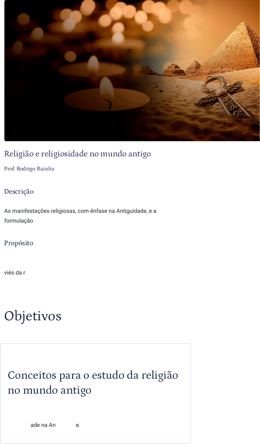 05/05/2023 10:26 Religião e religiosidade no mundo antigo https://stecine.azureedge.net/repositorio/00212hu/03437/index.html# 1/55 Religião e religiosidade no mundo antigo Prof. Rodrigo Rainha Descrição As manifestações religiosas, com ênfase na Antiguidade, e a formulação do monoteísmo de hebreus e cristãos. Propósito Instrumentalizar os alunos interessados em estudar Antiguidade por um viés da religião, percebendo como essas relações ainda são vivas em nossa dinâmica social. Objetivos Módulo 1 Conceitos para o estudo da religião no mundo antigo Identificar conceitos que nos permitam o estudo de religião e religiosidade na Antiguidade. 05/05/2023 10:26 Religião e religiosidade no mundo antigo https://stecine.azureedge.net/repositorio/00212hu/03437/index.html# 2/55 Módulo 2 Investigando abordagens religiosas na Antiguidade Reconhecer práticas religiosas associadas à investigação de documentos na Antiguidade no que tange às suas interpretações. Módulo 3 Eis que surge o monoteísmo Distinguir as características do monoteísmo hebraico e cristão. Introdução Estudar religião, em qualquer momento, é um desafio. Envolve paixões, negações e identidades. Muitas pessoas se definem por sua religião, não sendo só seu sistema de crenças, mas também a maneira como explicam sua própria existência. Por isso, um cuidado prévio que devemos ter é enfatizar que estamos falando de estudo, de cruzar dados filosóficos, científicos e socioculturais para compreender o fenômeno que chamamos de religião. A fé, os valores, as crenças dialogam com a prática e com as escolhas pessoais. Mas precisamos ter esse cuidado mesmo olhando para o mundo antigo? Sim. Afinal, a armadilha sobre o preconceito religioso pode estar sempre armada. Podemos ter poucos problemas para tratar de um Deus babilônio, como Marduk, ou um Deus grego, como Zeus ou Hórus, um Deus egípcio, mas a relação com o conhecimento deve ser igual ao tratarmos do Deus cristão - junto com Pai e Espírito Santo - Jesus ou Javé, a forma hebraica de se referir a “O Deus”. 05/05/2023 10:26 Religião e religiosidade no mundo antigo https://stecine.azureedge.net/repositorio/00212hu/03437/index.html# 3/55 Outro alerta é sobre os purismos. Religiões, desaparecidas ou ainda existentes, têm nomes próximos, mas mensagens reinterpretadas à luz dos novos contextos. Os dogmas e as informações sobre as tradições religiosas são constantemente reescritos, e por causa disso ressignificados. Isso gera uma batalha de intelectuais sobre o que na etimologia é o mais correto, ou mais profundo, qual o princípio verdadeiro. Aqui não será o lugar desses debates, mas sim o de perceber a relação entre o estudo e as possibilidades do estudo de religião. O desejo não é alcançar a verdade, mas reconhecer as características das religiosidades escolhidas em termos de reminiscência e fortalecer os instrumentos de análise. 1 - Conceitos para o estudo da religião no mundo antigo Ao �nal deste módulo, você será capaz de identi�car conceitos que nos permitam o estudo de religião e religiosidade na Antiguidade. O papel da religião nas sociedades antigas Iniciando os debates 05/05/2023 10:26 Religião e religiosidade no mundo antigo https://stecine.azureedge.net/repositorio/00212hu/03437/index.html# 4/55 A tentativa de estudar religião e religiosidade no mundo antigo é um trabalho de escolhas. O discurso religioso faz parte de praticamente todas as sociedades que se organizam no momento que costumamos chamar de Antiguidade. Povos como hititas, egípcios, sumérios, nórdicos, entre muitos outros, têm na religião o sentido explicativo do mundo e nas práticas individuais - conhecidas como religiosidades - muitas de suas marcas de práticas sociais. Sem recorte é impossível estudar porque tratam-se de: Inúmeros registros produzidos sobre o assunto a serem apresentados e discutidos Milhares de quilômetros possíveis de regiões a serem apresentadas e discutidas Milênios distintos de história a serem apresentados e discutidos As escolhas, quando observamos o volume de possibilidades, se basearam em dar fundamentos ao aluno para que ele tenha capacidade de, em primeiro lugar, estudar sobre os fenômenos religiosos. Entre os muitos caminhos que poderíamos seguir, escolhemos aqueles que dialogam mais intensamente com o mundo contemporâneo: o nascimento do monoteísmo, por isso dois módulos são dedicados a hebreus e cristãos. Antes de nos concentrarmos sobre essas relações, optamos por dar a escolha a todos que desejam estudar religião na Antiguidade demarcando como é possível fazê-lo, nos concentrando em observar o constructo entre a teologia política e os sacerdotes, percebendo que do diálogo entre estes é que são construídos os papéis religiosos. Depois passamos pelo exercício prático sobre o qual remetem os elementos religiosos e como podem ser associados a práticas econômicas, sociais e culturais. Passamos agora a nos concentrar sobre as ferramentas que nos permitirão esse desenvolvimento. 05/05/2023 10:26 Religião e religiosidade no mundo antigo https://stecine.azureedge.net/repositorio/00212hu/03437/index.html# 5/55 O que é religião? As diferenças entre religião e religiosidade Religião tem vários sentidos repetidos no senso comum. O mais recorrente é a ideia do religare como sendo a ponte entre os mundos físico e metafísico, ou tangível e intangível, ou real e espiritual. Seja qual for a “ponte”, essa visão é limitada porque a religião é um fenômeno humano de interpretação do mundo e tem um forte viés de construção de valor social. Analisaremos o que isso significa a partir de um react com o professor Rodrigo Rainha: React: o armário e o discurso religioso Você já assistiu ao filme Homens de Preto 2? Vamos assistir e comentar um trecho, a “cena do armário”. Religião é diferente de religiosidade, apesar de se aproximarem: Religião A
