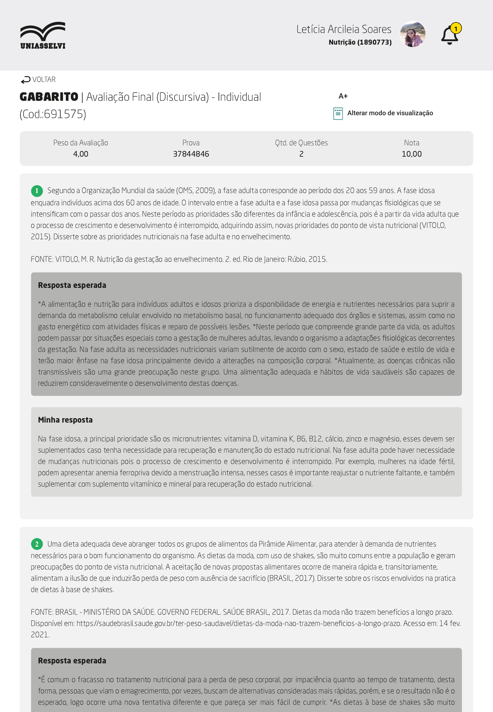 05/05/2023, 11:43 AVA https://ava2.uniasselvi.com.br/subject/grades-and-tests/answer-book/eyJ0ZXN0Ijp7InRlc3RDb2RlIjoiNjkxNTc1IiwiZGVzY3JpcHRpb24iOiJBdmFsaWHDp8OjbyBGaW5hbCAoRGlzY3Vyc2l2YSkgLSBJbmRpdmlkdWFs… 1/2 GABARITO | Avaliação Final (Discursiva) - Individual (Cod.:691575) Peso da Avaliação 4,00 Prova 37844846 Qtd. de Questões 2 Nota 10,00 Segundo a Organização Mundial da saúde (OMS, 2009), a fase adulta corresponde ao período dos 20 aos 59 anos. A fase idosa enquadra indivíduos acima dos 60 anos de idade. O intervalo entre a fase adulta e a fase idosa passa por mudanças fisiológicas que se intensificam com o passar dos anos. Neste período as prioridades são diferentes da infância e adolescência, pois é a partir da vida adulta que o processo de crescimento e desenvolvimento é interrompido, adquirindo assim, novas prioridades do ponto de vista nutricional (VITOLO, 2015). Disserte sobre as prioridades nutricionais na fase adulta e no envelhecimento. FONTE: VITOLO, M. R. Nutrição da gestação ao envelhecimento. 2. ed. Rio de Janeiro: Rúbio, 2015. Resposta esperada *A alimentação e nutrição para indivíduos adultos e idosos prioriza a disponibilidade de energia e nutrientes necessários para suprir a demanda do metabolismo celular envolvido no metabolismo basal, no funcionamento adequado dos órgãos e sistemas, assim como no gasto energético com atividades físicas e reparo de possíveis lesões. *Neste período que compreende grande parte da vida, os adultos podem passar por situações especiais como a gestação de mulheres adultas, levando o organismo a adaptações fisiológicas decorrentes da gestação. Na fase adulta as necessidades nutricionais variam sutilmente de acordo com o sexo, estado de saúde e estilo de vida e terão maior ênfase na fase idosa principalmente devido a alterações na composição corporal. *Atualmente, as doenças crônicas não transmissíveis são uma grande preocupação neste grupo. Uma alimentação adequada e hábitos de vida saudáveis são capazes de reduzirem consideravelmente o desenvolvimento destas doenças. Minha resposta Na fase idosa, a principal prioridade são os micronutrientes: vitamina D, vitamina K, B6, B12, cálcio, zinco e magnésio, esses devem ser suplementados caso tenha necessidade para recuperação e manutenção do estado nutricional. Na fase adulta pode haver necessidade de mudanças nutricionais pois o processo de crescimento e desenvolvimento é interrompido. Por exemplo, mulheres na idade fértil, podem apresentar anemia ferropriva devido a menstruação intensa, nesses casos é importante reajustar o nutriente faltante, e também suplementar com suplemento vitamínico e mineral para recuperação do estado nutricional. Uma dieta adequada deve abranger todos os grupos de alimentos da Pirâmide Alimentar, para atender à demanda de nutrientes necessários para o bom funcionamento do organismo. As dietas da moda, com uso de shakes, são muito comuns entre a população e geram preocupações do ponto de vista nutricional. A aceitação de novas propostas alimentares ocorre de maneira rápida e, transitoriamente, alimentam a ilusão de que induzirão perda de peso com ausência de sacrifício (BRASIL, 2017). Disserte sobre os riscos envolvidos na pratica de dietas à base de shakes. FONTE: BRASIL - MINISTÉRIO DA SAÚDE. GOVERNO FEDERAL. SAÚDE BRASIL, 2017. Dietas da moda não trazem benefícios a longo prazo. Disponível em: https://saudebrasil.saude.gov.br/ter-peso-saudavel/dietas-da-moda-nao-trazem-beneficios-a-longo-prazo. Acesso em: 14 fev. 2021. Resposta esperada *É comum o fracasso no tratamento nutricional para a perda de peso corporal, por impaciência quanto ao tempo de tratamento, desta forma, pessoas que viam o emagrecimento, por vezes, buscam de alternativas consideradas mais rápidas, porém, e se o resultado não é o esperado, logo ocorre uma nova tentativa diferente e que pareça ser mais fácil de cumprir. *As dietas à base de shakes são muito VOLTAR A+ Alterar modo de visualização 1 2 Letícia Arcileia Soares Nutrição (1890773) 1 05/05/2023, 11:43 AVA https://ava2.uniasselvi.com.br/subject/grades-and-tests/answer-book/eyJ0ZXN0Ijp7InRlc3RDb2RlIjoiNjkxNTc1IiwiZGVzY3JpcHRpb24iOiJBdmFsaWHDp8OjbyBGaW5hbCAoRGlzY3Vyc2l2YSkgLSBJbmRpdmlkdWFs… 2/2 populares e possuem muitos adeptos, devido a promessas de emagrecimento rápido e facilidade de ingestão. *No entanto, é preciso ter cautela principalmente ao utilizar os shakes como principal fonte alimentar diária. *As dietas à base de shakes não consideram necessidades nutricionais individuais e, quanto maior o tempo de utilização, maiores são os riscos à saúde. *Das consequências deste tipo de dieta incluem: deficiências nutricionais, emagrecimento inadequado com perda de músculos e água, causando flacidez, cansaço e indisposição, facilidade para recuperar o peso perdido, alto consumo de aditivos alimentares, como corantes, conservantes, estabilizantes e flavorizantes, além de propiciar deficiências nutricionais. Minha resposta Hoje em dia todos temos fácil acesso a internet, onde nos trazem coisas boas e ruins também, é o caso das dietas da moda e shakes. A busca desenfreada pelo corpo perfeito, leva as pessoas a cometer loucuras com a alimentação, uma delas são os shakes, que substituem refeições, possuem poucos nutrientes e minerais e dão sensação de saciedade. Porém a longo prazo não é algo sustentável, a pessoa não consegue manter, gerando um reganho de peso e trazendo junto um transtorno alimentar, além de poder gerar uma compulsão também. É extremamente desaconselhável que a pessoa troque refeições ricas em vitaminais, minerais e nutrientes, por shakes que não possuem nada disso. Imprimir Letícia Arcileia Soares Nutrição (1890773) 1