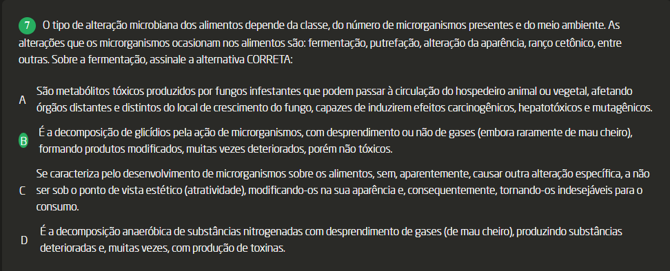 I - São metabólitos tóxicos produzidos por fungos infestantes que podem passar à circulação do hospedeiro animal ou vegetal, afetando órgãos distantes e distintos do local de crescimento do fungo, capazes de induzirem efeitos carcinogênicos, hepatotóxicos e mutagênicos. II - É a decomposição de glicídios pela ação de microrganismos, com desprendimento ou não de gases (embora raramente de mau cheiro), formando produtos modificados, muitas vezes deteriorados, porém não tóxicos. III - Se caracteriza pelo desenvolvimento de microrganismos sobre os alimentos, sem, aparentemente, causar outra alteração específica, a não ser sob ponto de vista estético (atratividade), modificando-os na sua aparência e, consequentemente, tornando-os indesejáveis para consumo. IV - É a decomposição anaeróbica de substâncias nitrogenadas com desprendimento de gases (de mau cheiro), produzindo substâncias deterioradas e, muitas vezes, com produção de toxinas. a) Apenas a afirmativa I está correta. b) Apenas a afirmativa II está correta. c) Apenas a afirmativa III está correta. d) Apenas a afirmativa IV está correta. e) As afirmativas II e III estão corretas.