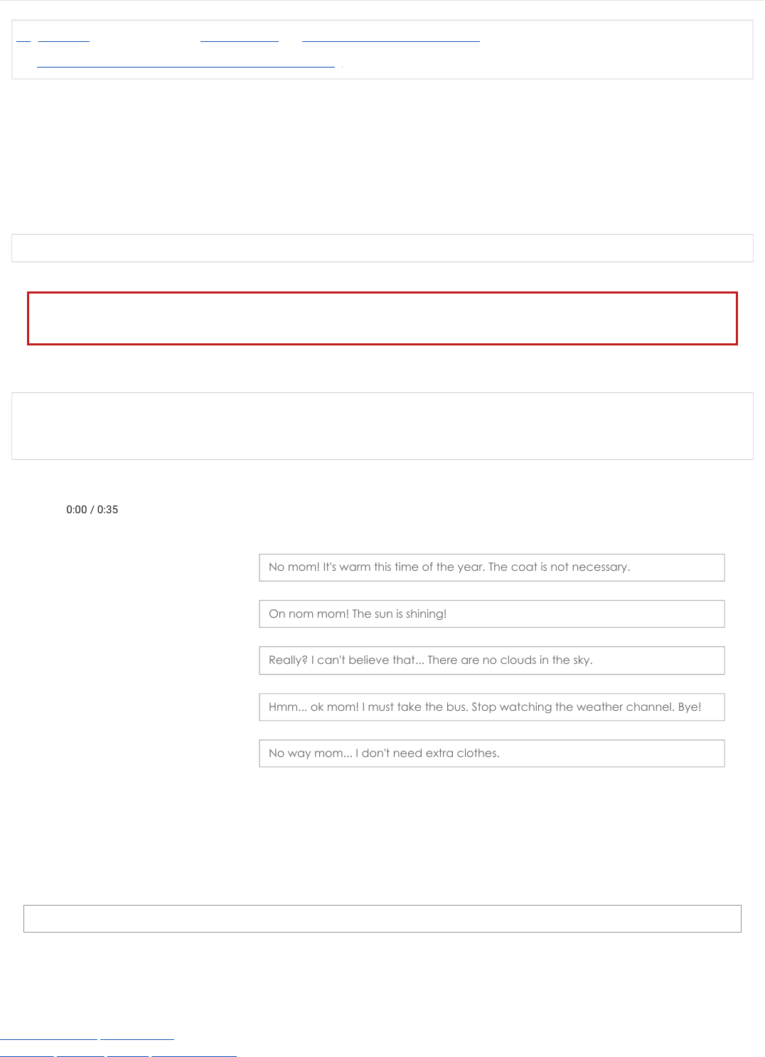 Resumo de retenção de dados Obter o aplicativo para dispositivos móveis Página inicial / Meus cursos / INGLÊS42023A / 1 What’s the weather like there? / 1.12 Teste seus Conhecimentos: bad weather is coming Iniciado em sábado, 6 mai 2023, 12:14 Estado Finalizada Concluída em sábado, 6 mai 2023, 12:16 Tempo empregado 2 minutos 37 segundos Notas 1,00/1,00 Avaliar 10,00 de um máximo de 10,00(100%) Informação Questão 1 Correto Atingiu 1,00 de 1,00 Christine's mom is giving her some instructions about what to wear in bad weather. Christine is not very interested in that. Listen to the conversation and match the columns. My dear don't forget to take a coat. It's freezing outside. You should take your umbrella! Only for now. The forecast is predicting hall. Yeah, but the forecast said there will be lightning and storm. My daughter, the forecast said it's getting cold and it may rain. 0:000:00 / 0:35/ 0:35 No mom! It's warm this time of the year. The coat is not necessary. On nom mom! The sun is shining! Really? I can't believe that... There are no clouds in the sky. Hmm... ok mom! I must take the bus. Stop watching the weather channel. Bye! No way mom... I don't need extra clothes. Sua resposta está correta. ◄ 1.11 Teste seus Conhecimentos: geography book Seguir para... 1.13 Glossary ► https://aprendamais.mec.gov.br/admin/tool/dataprivacy/summary.php https://download.moodle.org/mobile?version=2020110904&lang=pt_br&iosappid=633359593&androidappid=com.moodle.moodlemobile https://aprendamais.mec.gov.br/ https://aprendamais.mec.gov.br/course/view.php?id=701 https://aprendamais.mec.gov.br/course/view.php?id=701#section-1 https://aprendamais.mec.gov.br/mod/quiz/view.php?id=29906 https://aprendamais.mec.gov.br/mod/quiz/view.php?id=29905&forceview=1 https://aprendamais.mec.gov.br/mod/page/view.php?id=29908&forceview=1