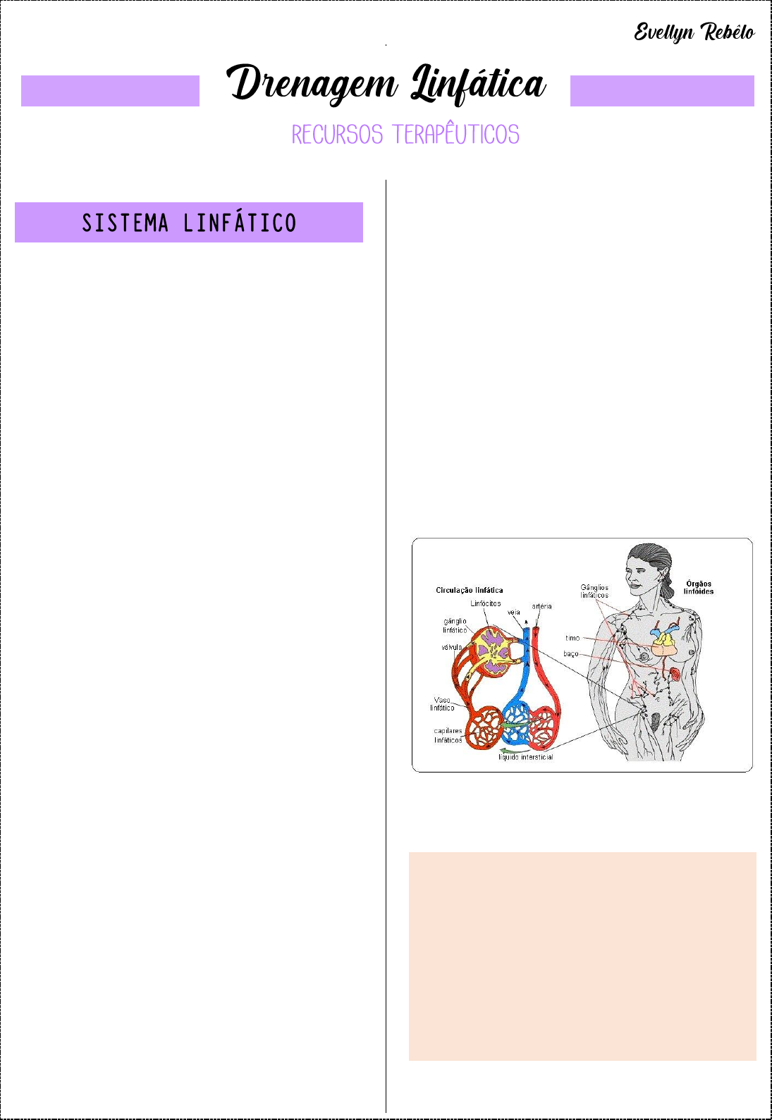 Principais funções: - Manter o equilíbrio líquido dos tecidos - Retornar o líquido intersticial ao sangue - Absorver gorduras do tubo digestivo -Participar da defesa do organismo contra os microrganismo ou substâncias nocivas Constituído pelo sistema vascular, órgãos e tecidos linfáticos, sendo eles: - Gânglios linfáticos: vão ser o principais que vão ajudar no equilíbrio hídrico e na defesa do organismo. -Linfa: liquido viscoso, de coloração amarela, de reação alcalina, a qual é o líquido intersticial. - Capilares linfáticos: são os menores vasos condutores do sistema linfático. Eles se originam no tecido conjuntivo como microscópicos vasos de fundo cego, que se unem, formando vasos maiores, os vasos linfáticos. Vasos linfáticos - formam as confluências dos capilares, que são chamados de pré-coletores. Tronco linfático- vão receber a linfa desses vasos. Ductos linfáticos – recebe a linfa dos troncos linfáticos e transportam de volta para o sistema sanguíneo e são chamado de condutores. Baço, timo e as tonsilas que vão atuar nesse processo. Composto pelo sistema vascular, no qual tem: Grande circulação – que sai da aorta e leva o sangue e nutrientes para todo o corpo e volta para o coração para ser oxigenado pelo pulmão. Pequena circulação – sangue da grande circulação, vai direto para o pulmão para ser oxigenado e volta para parte esquerda do coração para ser liberado pela aorta. É o inchaço causado pelo acúmulo anormal de líquidos entre os diversos tecidos, no interstício e cavidades que compõem o corpo humano, o que era para estar na circulação. COMPOSIÇÃO: por uma solução aquosa, vai ter sais e proteínas. CAUSAS: por patologias, traumas, fisiológico, falta de circulação e imobilidade. O QUE PODE LEVAR ACONTECER? ↑ Pressão hidrostática- aumento da pressão da água no nosso corpo. ↑ Permeabilidade vascular – acontece devido as inflamações. ↓ Pressão coloidosmótica – pressão da água e quanto dos sais dentro do organismo, que ela diminui e gera esse acúmulo de líquidos. ↓ Drenagem linfática – quando a nossa drenagem fisiológica diminui e não acontece de forma normal. CLASSIFICAÇÃO Linfedema Primário- acontece no caso de haver patologia sem intervenção de fatores externos (lesão de músculos, vários períodos em pé) Ex: elefantíase Linfedema Secundário- funcionamento anormal do sistema linfático é devido a fatores externos, associados a causas não patológicas (lesão, idade e obesidade) ou causas patológicas (trauma acidental ou cirurgias, infecção) 1º - só a patologia 2º - pode ser a patologia, mas tem que ser associada a algum fator externo. Ex: paciente com cardiomegalia, entretanto, teve uma entorse de tornozelo e teve o edema, é considerado 2º. DIAGNÓSTICO Avaliação da história, os exames físicos (medição do volume do edema, avaliação da pele, perimetria – comparar lados do corpo.) Perimetria Pode-se fazer também o teste do sinal de cacifo. Uso de manobras para drenagem dos vasos linfáticos, auxiliando o sistema linfático a manter o seu fluxo regular. Técnica de massagem, feita com pequenas pressões, suaves, lentas e que tragam relaxamento, seguindo a anatomia do sistema linfático. Inicia-se com o estímulo dos linfonodos corporais, movimentos para drenagem da linfa; Manobras lentas, comprimindo apenas o tecido superficial, sem alcançar a musculatura MANOBRAS De captação: realizada diretamente no local edemaciado, visando aumentar a captação da linfa pelos capilares linfáticos. Sempre de proximal para distal. De reabsorção: acontecem nos pré-coletores e coletores linfáticos (responsáveis pelo transporte da linfa captada pelos capilares linfáticos). De evacuação: atua nos linfonodos que recebem a confluência dos coletores linfáticos. Movimentos combinados/pressões em bracelete: PROTOCOLO 1. Começa pela drenagem dos gânglios da raiz do ”membro lesionado” – esvaziamento dos gânglios 2x5 manobras de chamada utilizando o movimento do polegar; 2. Estimula o sistema linfático através da realização de 5 manobras de chamada até chegar ao edema, do proximal até distal; 3. Reabsorver o edema as que forem necessário para encher os vasos; 4. Retorno do edema até a raiz do membro através de manobras de chamada: 1x em cada região de forma a auxiliar o retorno da linfa; 5. Drenagem do gânglios: 2 a 3 manobras de chamada IMPORTANTE No abdômen, geralmente faz a drenagem por quadrantes porque é uma área grande. Os superiores são drenados em direção a axilas e inferiores ao da virilha. INDICAÇÕES Alívio de dor Circulação sanguínea comprometida Edema no período gestacional e tensão- menstrual Hipertensão arterial Musculatura tensa/reumatismo Sistema nervoso abalado/estresse Estética Cicatrizes hipertrófica e queloideanas; Fibro edema gelóide (FEG) – celulite; Tratamento de acne e de dermatites (acompanhamento com dermatologista); Tratamento pré e pós cirurgia plástica/pós lipoaspiração. CONTRAINDICAÇÕES Asma brônquica grave e não medicada; Eczema agudo; Febre; Flebites e tromboflebites agudas; Hipotensão arterial; Infecções agudas; Insuficiência cardíaca/renal e neoplasias malignas.