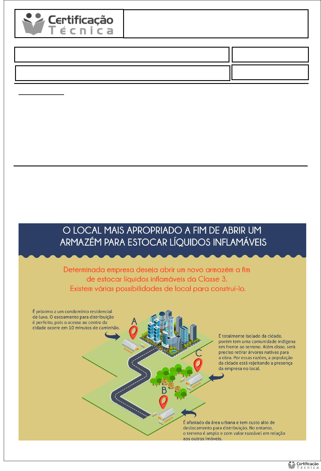 INSTRUÇÕES: Baixe o arquivo disponível com a Atividade Pratica; Você deve preencher dos dados no Cabeçalho para sua identificação: o Nome / Data de entrega. As respostas devem ser digitadas abaixo de cada pergunta; Ao terminar grave o arquivo com o nome Atividade Prática; o Quando solicitado Envio o arquivo pelo sistema no local indicado; Em caso de dúvidas consulte o seu Tutor. Aluno (a): PATRICIA DE BRITO PAIM Data: 09/02/2023 Segurança Logística - sg Avaliação Pratica 1 Os produtos perigosos exigem maior cuidado do que a carga geral em todas as atividades do armazém e no transporte. Por isso, é de extrema importância que gestores e colaboradores conheçam as normas brasileiras associadas ao produto perigoso. Essas diretrizes regulamentam o trabalho, incluindo, por exemplo, localização do armazém, movimentação, estoque, EPIs e transporte. Após ler tais informa- ções, avalie a situação a seguir. Diante desse cenário, qual é o local mais apropriado para a instalação do armazém e por que as outras possibilidades foram excluídas? No que diz respeito à segurança logística, o local B é o mais adequado, pois atende aos requisitos da legislação vigente. Dados principais da segurança logística A segurança logística consiste basicamente em , ao buscar condições razoáveis para aqueles que estão diretamente envolvidos no transporte e circulação de mercadorias em vários tipos de mercados consu- midores. a instalação de armazéns em áreas remotas da cidade, embora muitas vezes sejam mais caros para construir e manter. Quanto à abordagem de segurança para armazenar produtos perigosos, os principais detalhes incluem: Não é possível, de acordo com as normas vigentes, armazenar produtos perigosos em locais próximos às residências em geral por causa de possível contaminação; Em situações relacionadas à instalação de empresas que comercializam produtos perigosos; Recomenda-se, de acordo com a legislação, que este tipo de atividade não tem nenhum impacto ou al- teração no ecossistema do local.
