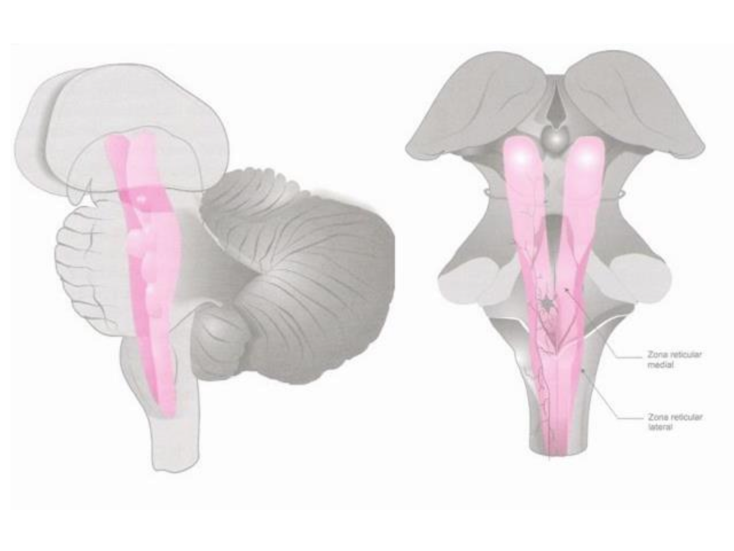 Formação Reticular Profa. Vivian Vasconcelos Costa Litwisnki Formação reticular • Um conjunto de células e fibras nervosas, agregação mais ou menos difusa de neurônios, de tamanhos e tipos diferentes e com características próprias, ocupantes de toda a do TE, embora se estendendo um pouco ao diencéfalo e aos níveis mais altos na medula, preenchendo espaços não ocupados pelos núcleos e feixes/tratos/fasciculos de fibras bem individualizados estudados na ME. Formação reticular • Não é uma estrutura homogênea (citoarquitetura ou do ponto de vista bioquímico). • Trata-se de uma área integradora do SN. Para ela convergem diversas informações vindas de numerosas estruturas neurais e dela partem projeções para praticamente todo o restante do SNC. Conexões Conexões • A FR não eh uma estrutura homogênea. Apresenta diferentes núcleos, com diferentes conexões e funções. • Conexões amplas e variadas • De maneira global podemos dividir: ✓ Conexões aferentes. ✓ Conexões eferentes. Funções • Controle da atividade elétrica cortical – Ciclo de vigília e sono; • Controle eferente da sensibilidade e da dor; • Controle da motricidade somática e postura; • Controle do SNA; • Controle neuroendócrino; • Integração de reflexos. Centro respiratório e vasomotor. Formação reticular • Controle da atividade elétrica cortical (ciclo vigília/sono); - SARA: Sistema ativador reticular ascendente: funcionaria com base nas eferências que a FR recebe (vias sensoriais diretas e indiretas) com o córtex cerebral por meio do tálamo. - A FR participa do controle do sono de maneira ativa “tônus cortical” - Lesões ou substancias que atuem na FR podem alterar os mecanismos de manutenção da consciência. eg: medicamentos contra insônia e anestésicos gerais podem atuar na FR. SARA: Sistema ativador reticular ascendente Formação reticular • Controle da motricidade somática e postural. - Fibras reticuloespinhais ipsilaterais ou cruzadas dirigem-se a ME. - Efeitos tanto excitatórios quanto inibitórios nos motoneurônios (eferências do córtex e cerebelo); - Manutenção da postura corporal, orientação da cabeça e do tronco em relação aos estímulos externos e mov. voluntários da m.m axial e apendicular proximal. Formação reticular • Controle eferente da sensibilidade - Controle aferente de entrada sensorial “atenção seletiva”; - Controle eferente de vias para as informações nociceptivas (sistema inibidor da dor); Formação reticular • Controle visceral e endócrino - Conexões reciprocas com áreas do hipotálamo e sistema límbico; - Fibras que terminarão em neurônios pré- ganglionares autonômicos na ME e TE; - Áreas reguladoras das funções cardiovascular (centro vasomotor) e respiratória (centro respiratório); - Participação em fenômenos neuroendócrinos – liberação de hormônios hipofisario (ACTH e hormônio antidiurético); Formação reticular • Controle dos movimentos oculares - Movimentos complexos e conjugados - Informações provenientes dos colículos superiores e núcleos vestibulares – FR – núcleos dos n.n oculomotor, troclear e abducente. - Área pontina da FR (próxima ao núcleo do abducente) controla os mov. Horizontais dos olhos - Área mesencefálica ( próxima ao n. do oculomotor), comanda os mov. Verticais dos olhos. AMBAS VIA FASCICULO LONGITUDINAL MEDIAL Formação reticular • Áreas aminergicas: utilizam como neurotransmissores aminas biogênicas. eg: noradrenalina, dopamina e adrenalina ( catecolaminas), a serotonina (indolamina). SISTEMAS AMINERGICOS: - Enviam axônios e terminações para praticamente todo o SNC - Funções moduladoras (excitatórias ou inibitórias); Formação reticular • Áreas e vias noradrenérgicas – “Locus ceruleus” - ativação cerebral, processo de vigília, atenção e memoria; Juntamente com o SNS – síndrome de emergência. Ansiedade. • Áreas e vias dopaminérgicas – Substancia negra e área tegmentar ventral no mesencéfalo – Vias mesolimbica e mesocortical. Mecanismos de recompensa. eg. Substancias que provocam dependência. Formação reticular • Áreas e vias serotoninérgicas - Núcleos da rafe: inervam estruturas do TE (área tegmentar ventral e substancia cinzenta periaquedutal), hipotálamo, estruturas límbicas e córtex. No bulbo e ponte enviam projeções ao TE , cerebelo e ME. - Vias serotoninérgicas descendentes: sistema inibidor da dor, regulação visceral e controle do neurônio motor somático. Formação reticular • Áreas e vias serotoninérgicas - Vias serotoninérgicas ascendentes: regulação do ciclo vigília/sono. - Controle da agressividade. eg: fármacos antidepressivos. COMA “Estado de inconsciência de si mesmo e do ambiente, mesmo apos estímulos de diversas modalidades e intensidades, em que o paciente permanece de olhos fechados” Vias reticulocorticais Escala de coma de Glasgow Sistema Nervoso Autônomo Profa Vivian Vasconcelos Costa Litwinski Sistema nervoso autônomo/visceral “escapar do controle voluntario exercido pelo SNC” Sistema Nervoso Sistema nervoso Somático “para a vida de relação” Músculos estriados Sistema nervoso visceral “para controle do meio interno” mm lisa, cardíaca e gls exócrinas Vias aferentes Centros Vias eferentes Vias aferentes Centros Vias eferentes = SNA SNS: Informa sobre o que se passa no Meio Ambiente. Leva a maior relacionamento//integração com o Meio Externo. SNV: Inerva Vísceras. Integração da atividade visceral para a Homeostase Interna. SNV: Conjunto de estruturas nervosas, centrais e periféricas, que controlam o Meio Interno. SNA = Porção Eferente do SN Visceral (Glândulas, Musculatura Lisa ou Cardíaca). Aferência Visceral Sensibilidade visceral: Dor Referida: dor deslocada de um órgão visceral sendo percebida na superfície do corpo É sentida na região da pele inervada pelo mesmo segmento medular que inerva o ó