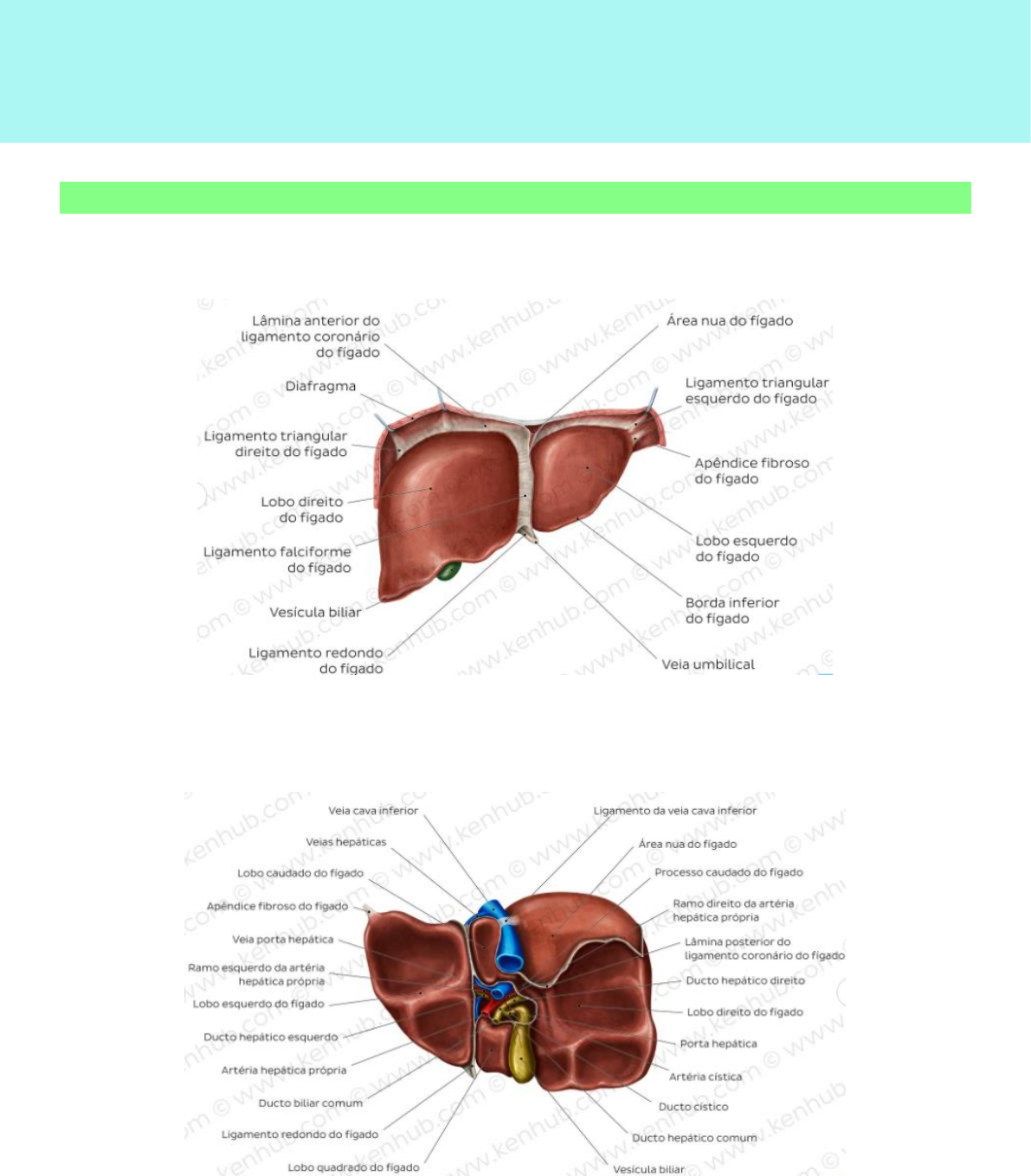 Ana Clara Guimarães de Souza Anatomia e Histologia – Morfofuncional Fígado e vesícula biliar Aspectos Anatômicos do fígado • Face diafragmática: face lisa, convexa; • A face diafragmática é coberta por peritônio visceral, exceto na área nua do fígado. Figura 1 - Face diafragmática • Face visceral: também é recoberta por peritônio, exceto na fossa da vesícula biliar e na porta do fígado. Figura 2 - Face visceral • Localização do fígado: quadrante superior direito do abdome (hipocôndrio direito + epigástrio). Situa-se profundamente às costelas VII a XI no lado direito e cruza a linha mediana em direção à papila mamária esquerda; • Lobo direito protegido pelo gradil costal; • Segundo maior órgão do corpo – pesa aproximadamente 1,5 kg; • Realiza interface entre sistema digestivo e o sangue; Figura 3 - Localização do fígado • Funções: ▪ Processamento e armazenamento de nutrientes (sob a forma de triglicerídeos ou glicogênio); ▪ Neutralização e eliminação de substâncias tóxicas por meio da bile. Também atua na emulsificação de gorduras; ▪ Produção de proteínas plasmáticas, como a albumina, protrombina, fibrinogênio. • Movimenta-se de acordo com a atividade do diafragma na dinâmica respiratória; • Relações anatômicas: estômago, vesícula biliar, rins, veia cava, aorta, duodeno e pâncreas, baço; • Estruturas de sustentação: ligamento triangular direito e esquerdo, ligamento coronário, ligamento falciforme (divide em lobos direito e esquerdo) e ligamento redondo (direciona-se à cicatriz umbilical); ▪ Ligamento falciforme: divide o fígado em lobo direito e lobo esquerdo ▪ Ligamento redondo: prolongamento do ligamento falciforme e remanescente fibroso da veia umbilical, que levava o sangue oxigenado e rico em nutrientes da placenta para o feto. ▪ Ligamento coronário: delimita a área nua do fígado em contato com o diafragma -permite a sustentação do fígado na parte superior no diafragma; ▪ Ligamento triangular esquerdo: próximo ao ápice (a extremidade esquerda) do fígado cuneiforme, as lâminas anterior e posterior da parte esquerda do ligamento coronário se encontram para formar o ligamento triangular esquerdo – permite a sustentação do fígado no diafragma; ▪ Ligamento triangular direito: permite a sustentação do fígado na parede abdominal ântero-lateral; ▪ Ligamento venoso: também é um remanescente embrionário, nesse caso, do ducto venoso da circulação fetal. Quando o bebê está no útero, o ducto venoso leva o sangue da veia umbilical até a veia cava Figura 4 - Ligamentos hepáticos Figura 5 - Ligamentos hepáticos • Impressões (na face posteior): gástrica, esofágica, suprarrenal, renal, duodenal: Figura 6 - Impressões hepáticas • Sulco da veia cava inferior (como se fosse uma impressão); • Área nua/extraperitoneal: área que não é recoberta pelo peritônio visceral (cápsula de Glisson); • Tríade portal: artéria hepática + veia porta + ductos biliares; • O fígado é dividido em lobos anatômicos e lobos funcionais (ou cirúrgicos): Figura 7 - Lobos hepáticos • Segmentos do fígado: o fígado é subdividido em oito segmentos. A veia hepática divide o lobo direito do fígado em segmentos anterior e posterior, e o lobo esquerdo em segmentos medial e lateral. Figura 8 - Segmentos do fígado vascularização do fígado • A veia porta é formada pela anastomose da veia esplênica com a veia mesentérica superior, então... Veia esplênica e mesentérica superior se unem (anastomose) e formam a veia porta → emite dois ramos, ramo esquerdo e ramo direito → sucessivas ramificações → vênulas • Suprimento de sangue oxigenado: porção dorsal da artéria aorta → artéria hepática → fígado. Realiza nutrição dos hepatócitos; • Veia porta do fígado: leva metabólitos da circulação esplâncnica (TGI) para serem processados pelo fígado. NÃO é a veia porta do fígado que realiza a drenagem venosa!!!!! • Drenagem venosa: Veia hepática (supra-hepática) → veia cava; • Ductos hepáticos direito e esquerdo saem do fígado e formam o ducto hepático comum: drenagem da bile (produzido pelos hepatócitos – emulsificação de gorduras); • Hilo ou pedículo hepático: tríade portal – veia porta + artéria hepática própria + ducto hepático comum (biliar); • Cada segmento do fígado recebe: uma tríade portal microscópica + um ramo principal da veia supra-hepática; • Artéria hepática: tem origem no tronco celíaco que sai da aorta abdominal Tronco celíaco → artéria hepática comum → artéria hepática própria → artéria hepática direita (caminha para o segmento funcional direito do fígado) e artéria hepática esquerda (caminha para o segmento funcional esquerdo do fígado). Ver imagem abaixo: Vascularização do fígado e tríade portal no hilo renal • Veia porta e circulação esplâncnica: a veia porta é formada pela união da veia mesentérica superior com a veia esplênica. A veia esplênica recebe a veia mesentérica inferior (que, no final das contas, também desemboca na veia porta); A circulação esplâncnica é drenada para o fígado através da veia porta. Posteriormente, ganha a circulação sistêmica por meio da veia supra-hepática e veia cava. Porém: Há áreas em que pode haver comunicação direta entre fluxo sanguíneo esplâncnico e circulação venosa sistêmica, sem a intermediação do fígado. São elas: região distal do esôfago e do fundo gástrico, veias paraumbilicais e região do reto inferior (através das veias retais médias e veias retais inferiores). Aspectos histológicos do fígado • Revestido por uma cápsula delgada de tecido conjuntivo que fica mais espessa no filo; • Hilo hepático: onde adentram a veia porta e a artéria hepática e de onde saem os ductos hepáticos direito e esquerdo e os vasos linfáticos; • Vasos circundados por tecido conjuntivo;