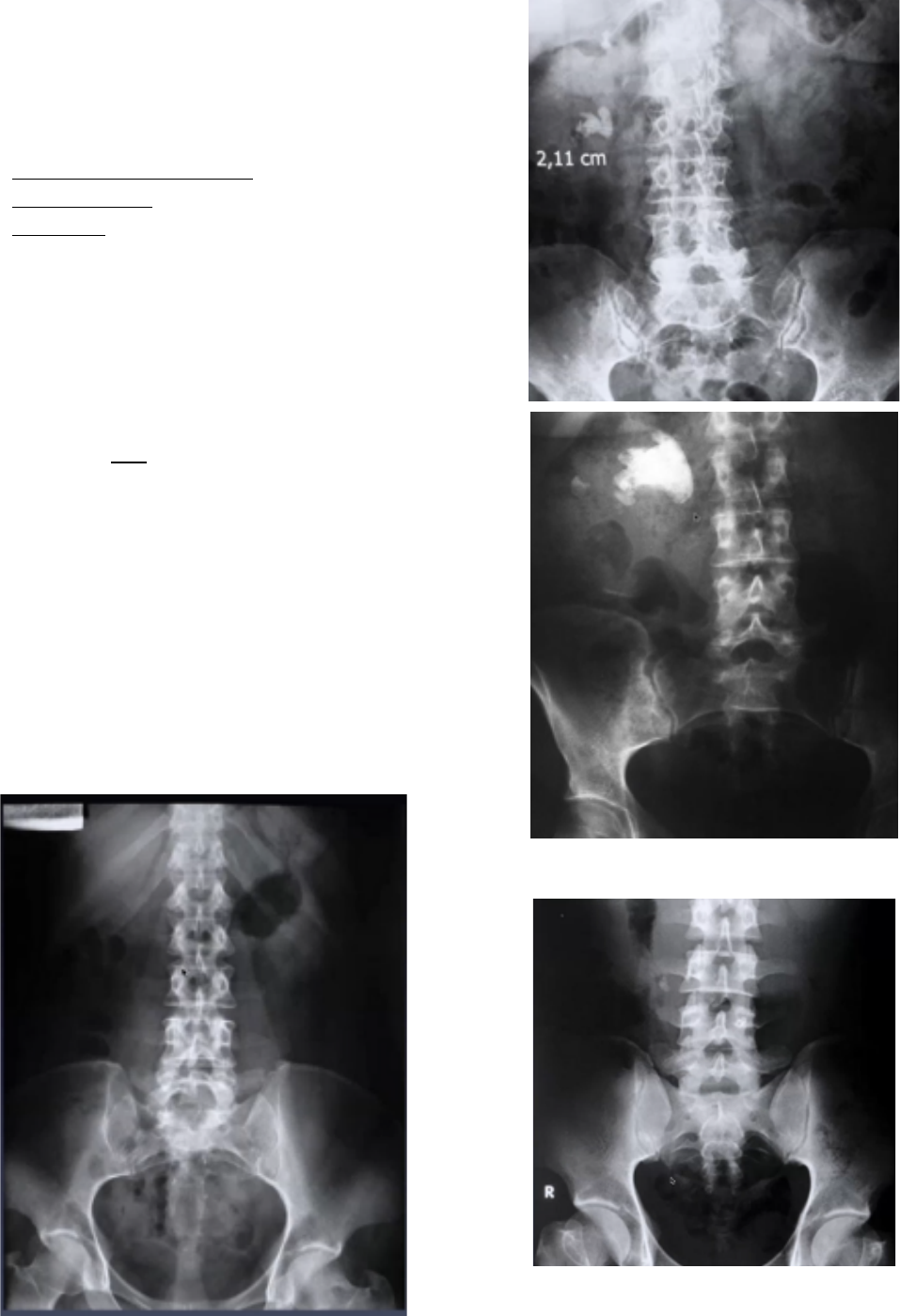Geovana Sanches, TXXIV IMAGENS EM UROLOGIA EXAMES • Radiografia o Urografia excretora o Uretrocistografia retrógrada e miccional • Ultrassonografia • Tomografia computadorizada • Ressonância magnética • Cintilografia • PET CT RAIO-X SIMPLES (PA) • Identificação • Características do exame • Lateralidade Estruturas • Órgãos urológicos o Não são vistos no RX simples sem contraste o Visualiza-se apenas a sombra renal • Cálculos o Maioria das vezes são radiopacos, pois 80% deles tem cálcio em sua composição o Não é possível identificar os de ácido úrico (não é radiopaco) • Duplo-J o Estende-se do rim até a bexiga o A alça encontra-se na pelve renal Raio-X normal Cálculos Cálculo renal à direita coraliforme – ocupa a pelve renal e tem mais de 2 cálices (formato de coral) Cálculo ureteral proximal à direita de aproximadamente 1 cm Geovana Sanches, TXXIV Duplo J Duplo J + Cálculo no ureter distal à direita UROGRAFIA EXCRETORA (UGE) A UGE é uma radiografia na qual injeta-se contraste iodado na veia e, de tempos em tempos, faz-se um raio-X para verificar a absorção e a excreção da substância. O exame é feito em 5 etapas: 1. Preparo intestinal 2. RX simples para avaliação de calcificações 3. Contraste iodado intravenoso a. Após 5 minutos, é possível visualizar um pouco do parênquima renal 4. Radiografias seriadas a. 3, 5, 10, 20 e 40 minutos 5. Imagem pós-miccional Estruturas • Avaliação da via excretora superior e de parte da bexiga • Não é um bom exame para visualização do parênquima renal • Ureter o Apresenta peristalse, não sendo identificado em alguns momentos na urografia excretora o Dilatação na porção proximal indica obstrução Patologias • Megaureter obstrutivo o Alteração congênita o Dilatação ureteral importante, mas com rim normal (pelve e cálice renal sem alterações) o Dificuldade na drenagem e refluxo § Melhor prognóstico se unilateral o Quadro clínico § Pielonefrites § Perda da função renal o Síndrome de Brunielli § Barriga de ameixa § Megaureter bilateral § Alteração dos mm. ureteral ou abdominal • Duplicidade ureteral o Completa: ambos os ureteres se inserem na bexiga (chegam separadamente) § Regra de Weigert-Meyer § Unidade superior: drenagem medial e inferior § Unidade inferior: drenagem lateral e superior § Obstruções são mais comuns no polo superior (trajeto maior) e refluxos no polo inferior (trajeto menor) § Sinal do lírio caído Geovana Sanches, TXXIV o Incompleta: os ureteres se unem antes de chegar a bexiga e há apenas um local de implantação • Estenose da junção uretero-piélica (JUP) o Causa mais comum de obstrução de vias urinárias em crianças (hidronefrose) o Correção cirúrgica § Retirada da estenose e anastomose entre pelve e ureter o Causas intrínsecas § Muscular § Obstrução o Causas extrínsecas § A. renal polar UGE normal • Preparo intestinal inadequado • 1’: sombra renal • 5’: fase excretora o Visualiza-se parênquima renal e eliminação do contraste • 10’: visualiza rim, a via excretora e os ureteres (rentes a coluna) • 20’: ureteres + JUV + bexiga o Visualização do contorno e capacidade, mas não é ideal para verificar lesões; não é um exame bom para TU inferior • Imagem Pós-miccional Megaureter obstrutivo • 25’: via excretora normal à direita • 40º minuto: visualiza-se ureter dilatado a direita de grandes proporções o Megaureter obstrutivo Duplicidade ureteral Duplicidade ureteral bilateral completa Geovana Sanches, TXXIV Duplicidade ureteral bilateral incompleta Sinal do lírio caído Obstrução da porção superior do ureter leva a uma dificuldade de drenagem, causando dilatação (sinal do lírio caído). Estenose da JUP • RX após 4 horas da injeção de contraste o Rim D: não é visto pois já drenou o contraste o Rim E: o contraste está parado na JUP esquerda URETROCISTOGRAFIA RETRÓGRADA E MICCIONAL (UCM) A uretrocistorgrafia retrógrada e miccional é um exame radiográfico que exige diversas etapas. São elas: 1. Preparo intestinal 2. RX simples 3. Introdução de contraste pela uretra 4. RX miccional 5. RX pós-miccional § em diversas incidências Estruturas • Trato urinário inferior o Uretra o Bexiga Patologias Uretra • Estenose de uretra o Causas § Uretrite § Trauma § Uso de sonda por tempo prolongado o Tratamento § Uretrotomia interna ou uretroplastia • Outras: divertículo, próstata obstrutiva, fístula e lesões traumáticas Bexiga • Refluxo vesicoureteral o Exame permite avaliação do refluxo da bexiga para o ureter o Classificação Grau Característica I Refluxo apenas no ureter Il Conteúdo alcança o rim, mas não causa dilatações lll Pequena dilatação renal lV Moderada dilatação renal V Intensa dilatação renal e presença de tortuosidades no ureter • Outras lesões: divertículos, trabeculações, neurogênicas, hiperplasia prostática, tumorações e fístulas UCM normal Geovana Sanches, TXXIV Estenose de uretra Refluxo vesico-ureteral ULTRASSONOGRAFIA Estruturas • Parênquima renal • Bexiga Patologias • Cálculos (litíase) o USG é examinador dependente e que o cálculo será visto de acordo com seu tamanho o Não são bem visualizados caso estejam no ureter médio devido a sobreposição de estruturas • Hidronefrose • Tumoração renal o Isoecogênicos • Angiomiolipoma o Tumor benigno composto por vaso, gordura e músculo o Hiperecogênico o Indicação cirúrgica se > 4 cm § Risco de sangramento o Esclerose tuberosa § Escleroses na face § Retardo mental § Angiomiolipoma • Tumor de bexiga o Diferencia-se de um coágulo através da mudança de posição do paciente e uso do Doppler § Doppler § Tumor apresenta fluxo sanguíneo/ vascularização § Mobilidade § Coágulo: móvel o Exame de eleição: cistoscopia o Fatores de risco § Tabagismo § Exposição a aminas aromáticas § Radioterapia pélvica o 