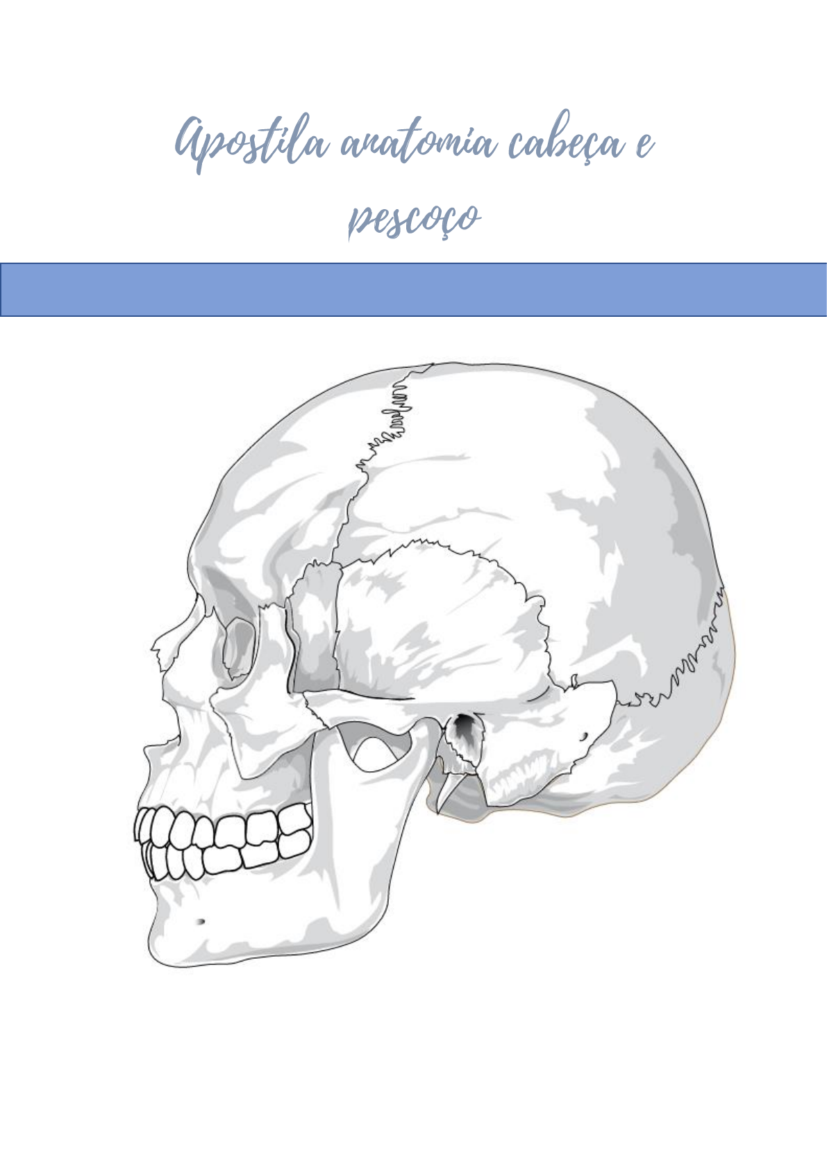 Por Maria Clara Frotté Osteologia 1 Crânio • Faz parte do esqueleto axial. • Seus ossos são unidos por junturas fibrosas. (Imóvel) Somente a ATM é uma articulação sinovial, unindo a mandíbula ao osso temporal de forma móvel. • Função de proteger: - O encéfalo; - As porções iniciais dos sistemas respiratório e digestório. - Os órgãos dos sentidos especiais (visão, gustação, olfação...). • Permite a passagem de vasos e nervos pelos forames. • Na maxila e mandíbula há suporte dos dentes. • Plano orbitomeático: orienta a posição do crânio, sendo uma linha horizontal que une a margem superior do meato acústico externo à borda inferior da órbita esquerda. • Pode ser dividido em viscerocrânio e neurocrânio: • Os ossos do crânio possuem a lâmina óssea interna e externa (osso compacto) e uma camada média de osso esponjoso (díploe). 2 • Vista Superior do crânio • Vista posterior do crânio 3 • Vista anterior do crânio 3.1) Fronte • Contribui para o esqueleto do terço superior da face. • Na escama do osso frontal existe uma elevação na porção medial, a glabela, a qual marca a localização do seio frontal. • A escama do seio frontal tem ossificação intramembranosa. • A lâmina horizontal contribui para o teto da órbita e para o soalho da cavidade craniana. • Nos embriões, o osso frontal é separado por uma sutura. Caso ela permaneça, é chamada de sutura metópica. 4 3.2) Cavidade orbital o Margem supraorbital: frontal + 2 reentrâncias: incisura frontal e incisura ou forame supraorbital. o Margem infraorbital: osso zigomático + maxila. O forame infraorbital permite a passagem do feixe vasculonervoso infraorbital (V2). o Margem lateral: processos zigomáticos do frontal e frontal do zigomático. o Margem medial: maxila + frontal + lacrimal. o Teto: frontal + asa maior do esfenoide. No extremo posterior do teto existe uma depressão, a fossa para glândula lacrimal. O canal óptico dá passagem para o nervo óptico (II) e à artéria oftálmica. o Assoalho: maxila + zigomático + processo orbital do palatino. Sulco infraorbital -> Canal infraorbital -> Forame infraorbital (face). o Parede medial: lacrimal + lâmina orbital do etmoide + pequena parte do esfenoide + parte da maxila + parte do frontal. - Forames etmoidais inferior e posterior: dão passagem aos vasos e nervos com mesmo nome. o Parede lateral: zigomático + asa maior do esfenoide + parte do frontal. - Fissura orbital superior e inferior. 5 3.3) Proeminência da face • Formada pelo zigomático, articulando-se com a maxila, frontal, esfenoide e temporal. Traumas nessa região não costumam fraturar o zigomático, mas pode ocorrer o seu deslocamento para o seio paranasal ou separações das suturas que envolvem essa região. 3.3) Nariz ósseo externo • Abertura piriforme: delimitada pelas maxilas e ossos nasais. • Espinha nasal anterior: onde se fixa a cartilagem do septo nasal. • Cóanos: aberturas posteriores da cavidade nasal delimitados pelo vômer, lâmina pterigoidea medial, pelas lâminas horizontais do osso palatino e pelo corpo do esfenoide. • Osso etmoide -> descrição necessária para entender a cavidade nasal. 6 3.3.1: Osso etmoide Composição: lâmina horizontal (cribriforme) + lâmina vertical + duas massas laterais. • Massas laterais: cavidades ósseas aeradas. o Labirinto etmoidal -> seio etmoidal o Também formam a parede medial da cavidade orbital e as conchas nasais superior e média. o Lâmina horizontal -> lâmina cribriforme -> filetes nervosos do nervo olfatório (I). o Lâmina vertical -> lâmina perpendicular -> septo nasal. Fratura da lâmina cribriforme: pode atingir os filetes do nervo olfatório (I) e de suas bainhas, formadas por extensões da dura-máter. Ocorre extravasamento do líquido cerebrospinal (rinorreia) e perda de olfato (anosmia). 3.3.2: Paredes da cavidade nasal o Parede lateral: parte do nasal + maxila + lacrimal + etmoide + concha nasal inferior + lâmina perpendicular do palatino + lâmina medial do processo pterigoide do esfenoide. OBS: As conchas nasais média e superior são projeções do etmoide. 7 - Forame esfenopalatino: comunica a cavidade nasal e a fossa pterigopalatina. o Parede medial: septo ósseo = lâmina perpendicular do etmoide + vômer. Teto: nasal + frontal + corpo do esfenoide + parte do vômer+ Lâmina cribriforme do etmoide. o Assoalho: teto da cavidade oral = processos palatinos das maxilas +lâminas horizontais dos palatinos. 4) Vista lateral do crânio • Frontal + parietal + temporal + parte do occipital + nasal + lacrimal + zigomático + maxila + mandíbula + asa maior do esfenoide. 4.1) Osso temporal • Partes escamosa, timpânica, estiloide, mastoide e petrosa. 8 4.2) Fossa temporal: Região onde fica o músculo temporal, delimitada superiormente pela linha temporal superior e inferiormente pelo arco zigomático. • Ptério: relação com o ramo anterior da artéria meníngea média. Traumatismos nessa região podem causar fraturas que rompem a dura- máter e essa artéria. Traumas na região do Ptério → Observação do paciente por 24 horas. 4.3) Fossa infratemporal: Região abaixo da fossa temporal. Preenchida pelo tendão do músculo temporal, pelos músculos pterigoideos medial e lateral, pela artéria maxilar e seus ramos, pelo plexo venoso pterigoideo e pelos nervos mandibular, parte do nervo maxilar e pelo nervo corda do tímpano. Seus limites incluem: • Superior: asa maior do esfenoide. • Inferior: é aberta. • Anterior: maxila e fissura orbital inferior. • Posterior: aberta. • Lateral: lâmina lateral do processo pterigoide do esfenoide e pela fissura pterigomandibular. • Medial: ramo e processo coronóide da mandíbula. Comunicações com: • Fossa temporal: pela abertura do arco zigomático e o resto do crânio. • Órbita: pela fissura orbital inferior. • Fossa pterigopalatina: pela fissura pterigomaxilar. • Fossa média do crânio, p