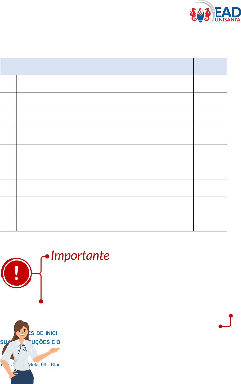 RELAÇÃO DOS FORMULÁRIOS PARA REALIZAÇÃO DO ESTÁGIO CURRICULAR SUPERVISIONADO ITENS NECESSÁRIOS EM SUA PASTA DE ESTÁGIO: Checagem 1. Carta de Apresentação para Estágio (opcional) 2. Ficha de informações gerais sobre o (a) aluno (a) estagiário (a) 3. Ficha de registro de frequência 4. Ficha de Avaliação do (a) estagiário (a) pela Instituição Concedente 5. Declaração de Conclusão de Estágio pela Instituição Concedente 6. Comprovante de Realização de Estágio Supervisionado 7. Entrevista com um profissional da Instituição concedente do estágio 8. Relatório de observação do estágio 9. Plano de Aula alinhado à BNCC Apenas a Carta de Apresentação e a Ficha de Informações Gerais sobre o aluno (itens 1 e 2) deverão ser preenchidos manuscritos. Os demais documentos devem ser digitados em computador. Sua pasta deve conter todos os itens, com exceção da “Carta de apresentação”, pois ela pode ficar no local onde você fez o estágio. Caso não fique com a escola, inclua-a na pasta. Ao final todos os itens devem ser convertidos em .pdf (arquivo único) e entregues via AVA na página da disciplina. ANTES DE INICIAR O SEU ESTÁGIO LEIA O GUIA DA DISCIPLINA NO AVA E SIGA SUAS INSTRUÇÕES E ORIENTAÇÕES. SE NECESSÁRIO, ACESSE NOSSA ÁREA DE APOIO TÉCNICO E VEJA NOSSOS TUTORIAIS. O SEU ESTÁGIO CURRICULAR SUPERVISIONADO DEVERÁ OCORRER OBRIGATORIAMENTE EM INSTITUIÇÕES REGULARES, CONFORME DESCRIÇÃO ABAIXO: Modalidade Carga-horária de observação Carga-horária de relatório Estágio Curricular Supervisionado de Ensino Religioso na Educação Básica - Ensino Médio 80h 20h Este estágio poderá ser realizado em instituições como: Escolas da educação básica – em turma de ensino Médio na disciplina de ensino religioso ou outra equivalente. Em caso de dúvidas sobre o aceite da instituição em que você tem interesse em estagiar, procure orientação de sua tutora ou professora da disciplina. ATENÇÃO! – LEIA AS INSTRUÇÕES ACIMA! OBJETIVOS ESPERADOS PARA O ESTÁGIO CURRICULAR SUPERVISIONADO: · Conhecer a realidade educacional em diferentes aspectos, como: físico, pedagógico e administrativo; · Observar, refletir e propor ações para auxiliar de forma qualitativa a construção do conhecimento aliado à realidade observada; · Analisar os diferentes aspectos que envolvem o cotidiano escolar dos estudantes; · Envolver os alunos nas mais diferentes situações escolares; · Estimular os alunos/professores a observarem de maneira investigativa as produções das crianças, para encontrarem nelas elementos que lhes permitam compreender o momento de aprendizagem de cada um; INSTITUTO SUPERIOR DE EDUCAÇÃO SANTA CECÍLIA C.N.P.J. 58.251.711/0001-19 - Santos-SP Curso de Licenciatura em Ciências da Religião · Apresentar o relatório final de estágio e sua produtividade quando estiver, futuramente, atuando como docente. EAD UNISANTA Rua Cesário Mota, 08 - Bloco F, Sala F12 – Boqueirão – Santos/SP – CEP 11045-040 – Tel. (13) 3202-7159 3. FICHA DE REGISTRO DE FREQUÊNCIA EM ESTÁGIO CURRICULAR SUPERVISIONADO DE ENSINO RELIGIOSO NA EDUCAÇÃO BÁSICA – ENSINO MÉDIO Nome do estagiário: RA: Semestre: Ano: Data de início do estágio: Data de término: Horas realizadas: Instituição: Endereço: Cidade: CEP: Fone: DATA SÉRIE/ANO DESCRIÇÃO DAS ATIVIDADES ACOMPANHADAS NO DIA (usar uma linha para cada dia - crie cópias da página se necessário) CARGA HORÁRIA (em horas) RÚBRICA DO PROF. TITULAR DA SALA DATA SÉRIE/ANO DESCRIÇÃO DAS ATIVIDADES ACOMPANHADAS NO DIA (usar uma linha para cada dia – crie cópias da página se necessário) CARGA HORÁRIA (em horas) RÚBRICA DO PROF. TITULAR DA SALA ______________________________, _____de ________________de _________. Assinatura e CARIMBO do diretor da instituição Assinatura do estagiário Prof. Supervisor de Estágios – UNISANTA 4. Ficha de avaliação do (a) estagiário (a) pela instituição de ensinO Nome do estagiário: RA: Semestre: Instituição concedente do estágio: Início: Término: Horas realizadas: ASSINALE A TABELA ABAIXO DE ACORDO COM A RUBRICA: A (excelente) / B (bom) / C (regular) / D (insatisfatório) AÇÕES A B C D Demonstra conhecimento na realização de tarefas desenvolvidas no cotidiano escolar. Utiliza a língua portuguesa de forma correta. Demonstra capacidade de procurar soluções sem prévia orientação, dentro dos padrões adequados a cada situação de trabalho (proatividade). Possui clareza, precisão e eficiência nas várias formas de comunicação. Tem interesse e entusiasmo no desempenho das atividades. Evidencia controle emocional em situações inesperadas ou difíceis e coerência de atividades nas manifestações afetivas e comportamentais. Busca, junto aos profissionais da unidade escolar, contribuir para o alcance de um objetivo comum. Procura viabilizar as instruções do supervisor, normas e regulamentos, apresentando bons resultados. Atingiu os objetivos propostos para a realização do estágio. ______________________________, _____de ________________de _________. Assinatura e CARIMBO do diretor da instituição Carimbo da unidade escolar Prof. Supervisor de Estágios – UNISANTA 5. DECLARAÇÃO DE CONCLUSÃO DO ESTÁGIO DA INSTITUIÇÃO CONCEDENTE Declaro, para fins de comprovação de Estágio Curricular Supervisionado, que o (a) aluno (a) __________________________________________________________, regularmente matriculado (a) no curso de Licenciatura em Ciências da Religião, da Universidade Santa Cecília da UNISANTA, cumpriu ________ horas de Estágio Curricular Supervisionado de Ensino Religioso na Educação Básica - Ensino Médio, no período de ____/____/____ a ____/____/____, neste estabelecimento de ensino. _______________, _____de ________________ de _________. _________________________________________________________________________________________ Assinatura E carimbo do (a) Coordenador (a), Diretor (a) ou repres