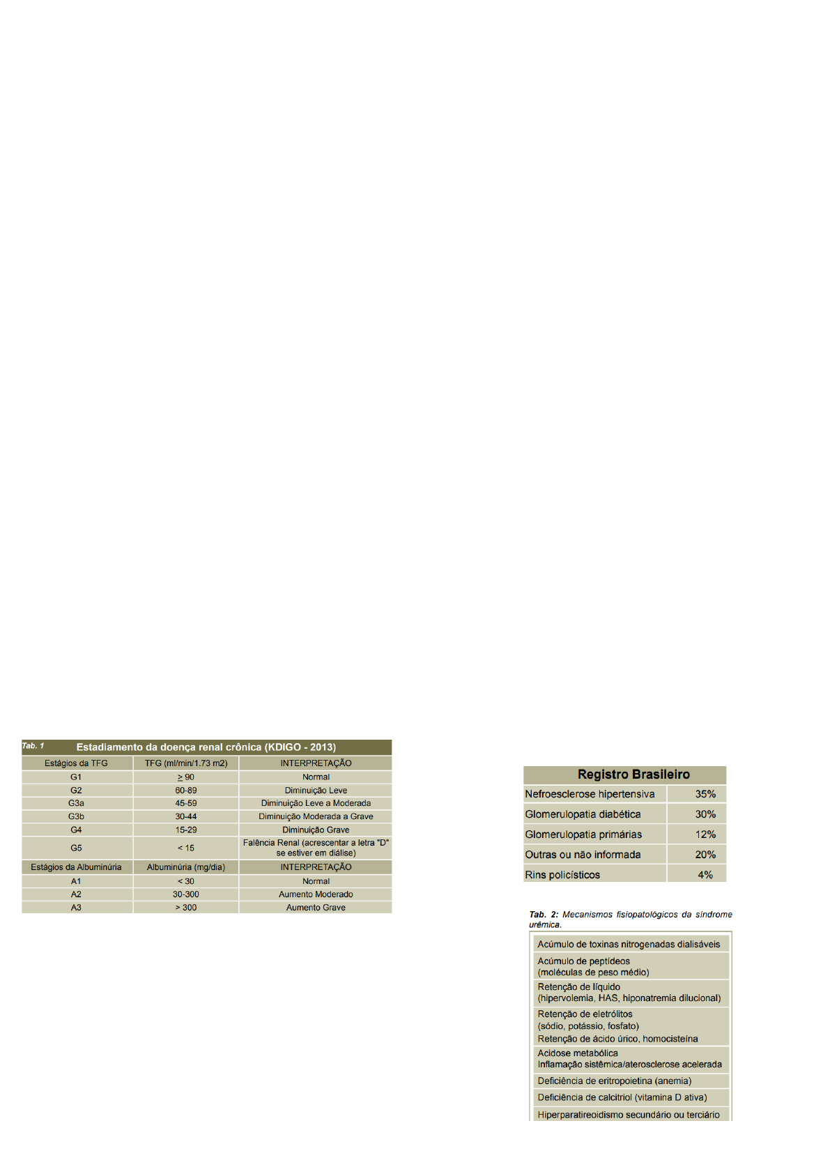 Nefro - Lesão Renal Crônica: - Existe Doença Renal Crônica quando há “dano renal” (geralmente detectado pela presença de albuminúria > 30 mg/dia) e/ou perda da função renal (definida como uma taxa de filtração glomerular < 60 ml/min/1.73 m²), por um período maior ou igual a 3 meses. - As suas causas são processos patológicos lentamente progressivos. - Ao contrário do que se observa na maioria dos casos de IRA, na DRC não ocorre regeneração do parênquima renal, e por isso a perda de néfrons é irreversível. - Às vezes, no entanto, a DRC pode se instalar de forma aguda (Necrose cortical aguda e glomerulonefrite rapidamente progressiva). - Todas as nefropatias crônicas, após um período variável (geralmente entre 3-20 anos), podem evoluir para a Doença Renal em Fase Terminal, em que se observam níveis residuais de TFG (<15% do normal). - Nesse momento, a histopatologia perde as características específicas da nefropatia inicial, apresentando uma alteração universal: Fibrose glomerular e intersticial, aliada à atrofia dos túbulos (ou seja, perda total dos néfrons). - O paciente, então, apresenta os diversos sinais e sintomas que compõem a Síndrome Urêmica (uremia), e a terapia de substituição renal, representada pelos métodos dialíticos e pelo transplante renal, torna-se imprescindível para a sua sobrevivência. - O estadiamento tem sido feito pelo sistema proposto pela KDIGO, que permite estratificar o paciente quanto ao risco de complicações da DRC. - A classificação final será composta pela combinação dos estágios “G” + “A”, devendo-se acrescentar a letra “D” se o paciente estiver em diálise. - Uma albuminúria > 30 mg/24h, quando persistente, sinaliza os pacientes com maior risco de evoluir para DRC progressiva e rins em fase terminal, independentemente da etiologia. - Na realidade, quanto maior for o nível de proteinúria, mais rápida será a queda anual na taxa de filtração glomerular. - À medida em que a perda de néfrons progride, os néfrons remanescentes vão sendo “sobrecarregados”, tentando excretar, além de sua carga básica de solutos, os solutos que os néfrons perdidos excretariam: Hiperfiltração Adaptativa. - Entretanto, a própria hiperfiltração acaba induzindo a lesão glomerular, inicialmente pelo processo de glomeruloesclerose segmentar focal (proteinúria crescente), que com o tempo evolui para glomeruloesclerose global difusa, acompanhada de fibrose e atrofia de todo o néfron. - O bloqueio do SRAA comprovadamente consegue prevenir ou atrasar essa evolução da doença para a autoperpetuação. - O uso de IECA ou Antagonistas da Angiotensina II produz uma redução no grau de proteinúria bem acima do esperado somente pela queda dos níveis tensionais. - Além de reduzir a hiperfiltração e a proteinúria, tais drogas possuem efeito anti-fibrótico e anti-inflamatório no rim, retardando a progressão da nefropatia através de vários mecanismos complementares. - Assim, um dos principais alvos terapêuticos com o objetivo de evitar ou atrasar a evolução para DRFT é o controle da proteinúria para níveis inferiores a 0,5-1g/dia, ou, pelo menos, uma queda superior a 50-60% em relação ao valor inicial. - Outros fatores devem ser estimulados para tentar minimizar o dano renal: Abandono do tabagismo, controle glicêmico rigoroso e tratamento da acidose metabólica com reposição de bases. - O tratamento específico de algumas entidades, como as glomerulopatias e as vasculites, pode ser altamente eficaz se iniciado precocemente. - Baseia-se no uso de corticosteróides e outros imunossupressores, como a ciclofosfamida. Etiologia da DRC: Fisiopatologia da Síndrome Urêmica: 1) Toxinas Dialisáveis (Perda da função de filtro): - A disfunção renal grave leva ao acúmulo de substâncias tóxicas endógenas, algumas das quais podem ser filtradas pela membrana de diálise. - A uréia é a substância de maior concentração urinária, e representa 80% de todo o nitrogênio eliminado na urina. - Entretanto, foi observado que ao se fazer diálise acrescentando ureia na solução dialítica, para manter seus elevados níveis séricos, mesmo assim havia melhora importante dos sintomas da síndrome urêmica. - Atualmente, centenas de substâncias nitrogenadas são encontradas em altos níveis na circulação de pacientes urêmicos. - A uréia apresenta efeito tóxico apenas quando em altas concentrações (>380mg/dl). Sua toxicidade é primariamente gastrointestinal (anorexia, náuseas e vômitos) e hematológica (sangramento). - Apesar da baixa toxicidade, seus níveis elevam-se juntamente com os de outras substâncias nitrogenadas tóxicas e, por conseguinte, ela pode ser usada como marcador da síndrome urêmica. - Os sinais e sintomas da síndrome urêmica costumam ocorrer com ureia sérica > 180 mg/dl, em não diabéticos, e > 140 mg/dl, em diabéticos. - Com frequência, pacientes em programa de diálise apresentam sintomas como astenia, falta de energia, distúrbios do sono e cognição, alterações psiquiátricas, disfunção sexual e deficit de crescimento e maturação sexual em crianças e adolescentes. - A hipótese de que o tratamento dialítico não é inteiramente capaz de depurar todas as toxinas que deveriam ser eliminadas e/ou metabolizadas no rim, causando seu acúmulo e o surgimento da síndrome residual, é corroborada pelo fato de que, estes pacientes, quando transplantados, evoluem com melhora importante dos referidos sintomas. 2) Distúrbios Hormonais (Perda da função endócrina): - O principal fator parece ser a elevação dos níveis de paratormônio (PTH), devido ao hiperparatireoidismo secundário. - O PTH é considerado uma verdadeira “toxina urêmica” e contribui para quase todos os sinais e sintomas da síndrome, incluindo a encefalopatia, a cardiomiopatia, a anemia e o prurido. - Sem dúvida, entretanto, a manifestação mais dependente dos efeitos do PTH